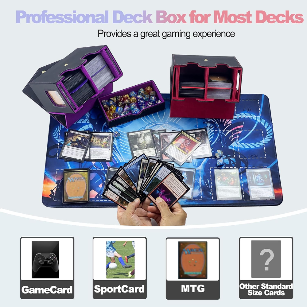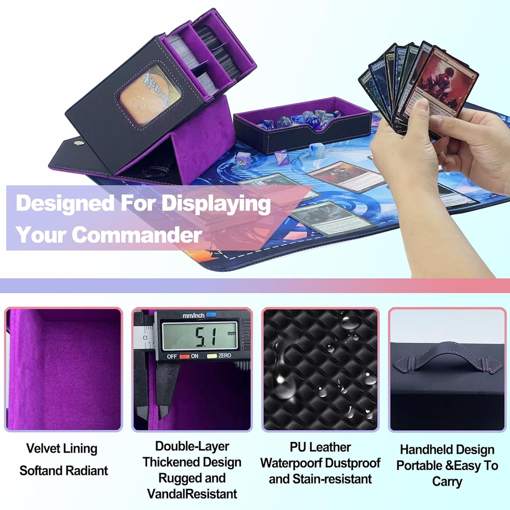 Designed for MTG Commander: This trading card storage box includes 2* 35pt one touch magnetic card holder and 2 card dividers, ideal for showing off rare or commander cards. A must-have commander deck box for TCG, EDH, CCG and serious collectors. Magnetic and Safety Buckle Lock: Made of waterproof PU leather and microfiber lining, this deck box mtg commander offers strong protection. The magnetic closure + button flap keeps your card organizer safe in travel and storage. Generous Storage Capacity: This Commander deck box offers ample space for 520 unsleeved cards or 300 single-sleeved (Penny sleeve) cards, or 200 double-sleeved cards. It also features dual side display windows, letting you show off your rarest cards without sacrificing protection. Note: Top loaders hard card sleeves and 35pt one touch magnetic card holder can also be used, but they have not been specifically measured. You can try them out~(Just place it in an east-west direction) Portable Handle for Travel: The built-in handle makes this MTG card box easy to carry to tournaments, collector events, or local game shops. Functional, stylish, and ideal for all trading card fans Ideal Gift: Whether you're a card collector or know someone who is, this tcg card storage box is the ideal solution for keeping collections neat and organized. A thoughtful g1ft for family, friends, or any card game enthusiast. Product description
