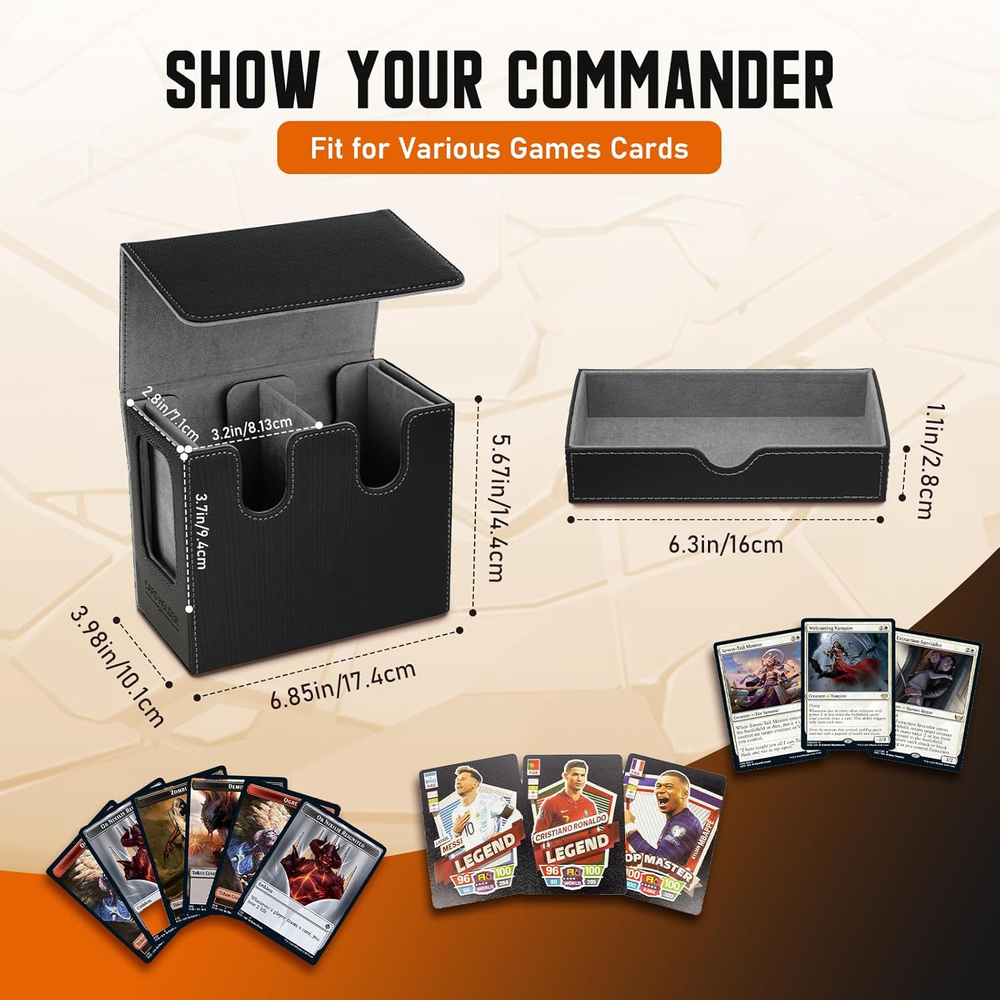 Ample Storage Capacity: The commander deck box features two compartments that hold up to 200 double-sleeved cards or 250 single-sleeved or 400 unsleeved cards, its unique U-shaped opening makes you easily take cards during battle. The card deck case for rrading cards is a perfect storage solution for your card collection. There is also a large drawer inside for placing dice. The inner design can prevent your dice from falling accidentally, making it safer and more confidential. Display Window for Your Commander Deck: The mtg commander deck box is customized for EDH Commander players. You can securely store your Commander/Leader cards in the included card holders. The mtg deck box allows you to display your Commander character through the window, and easily view the deck in each card box without opening it, stylishly displaying your collection. Magnetic Closure and Large Dice Tray: The card deck box is equipped with multiple strong magnets to ensure that the deck box remains closed during transportation. It will not open easily even if shaken vigorously, providing reliable protection for your cards. The card storage box size of each compartment is: 2.8 x 3.2 x 3.7 inches, and the dice box size is: 6 x 3 x 1.1 inches. Robust Protection, Effortless Organization: The magic card deck case is made of premium PU leather for shock and dust protection and soft microfiber lining to protect cards from scratches. With double partitions, the mtg card box ensures cards are sorted orderly and fully protected . 6 included dividers allow you to divide the cards into different sections to categorize your card collections. Compatible with Various Games Cards: Our mtg storage box is designed to universally accommodate all trading card games, including Magic The Gathering, Yugioh!, Duel Masters, One Piece, and sports cards such as baseball/basketball/football cards. Whether you're an MTG, PTCG, or TCG player, TiMOVO provides you an unprecedented joy in card gaming. Product Description The video showcases the product in use. The video guides you through product setup. The video compares multiple products. The video shows the product being unpacked. Removable & Convenient Large Inside Drawer The dedicated large dice tray holds a variety of accessories such as dice, counters and tokens, ensuring your gaming gears are organized and within easy reach.The inner design can prevent your dice from falling accidentally, making it safer and more confidential. 1 Commander Display 2 6 Card Dividers 3 Magnetic Closure 4 Product Details More MTG Commander Card Deck Box Add to Cart Add to Cart Add to Cart Add to Cart Add to Cart Add to Cart Add to Cart Customer Reviews 4.8 out of 5 stars 55 4.9 out of 5 stars 90 4.9 out of 5 stars 90 4.9 out of 5 stars 90 4.6 out of 5 stars 60 4.6 out of 5 stars 60 4.6 out of 5 stars 60 Price $27.99 $ 27 . 99 $25.99 $ 25 . 99 $28.99 $ 28 . 99 $27.99 $ 27 . 99 $38.99 $ 38 . 99 $42.99 $ 42 . 99 $42.99 $ 42 . 99 Compatibility For all Trading Cards For all Trading Cards For all Trading Cards For all Trading Cards For all Trading Cards For all Trading Cards For all Trading Cards Material PU Leather PU Leather PU Leather PU Leather PU Leather PU Leather PU Leather Capacity 400+ Unsleeved Cards 400+ Unsleeved Cards 400+ Unsleeved Cards 400+ Unsleeved Cards 3000+ Unsleeved Cards 3000+ Unsleeved Cards 3000+ Unsleeved Cards Dividers 6PCS 4PCS 4PCS 4PCS 20PCS 20PCS 20PCS Commander Display 2 2 2 2 4 4 4 Features Magnetic, Large Dice Tray Removable Card Box, Dice Tray Removable Card Box, Dice Tray Removable Card Box, Dice Tray 4-Row Design, Card Supporters 4-Row Design, Card Supporters 4-Row Design, Card Supporters