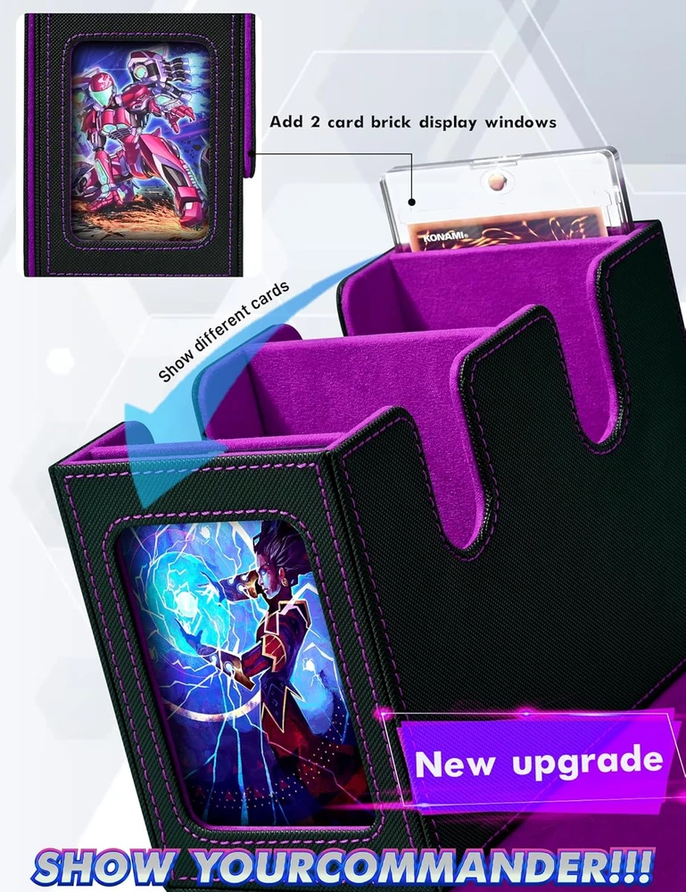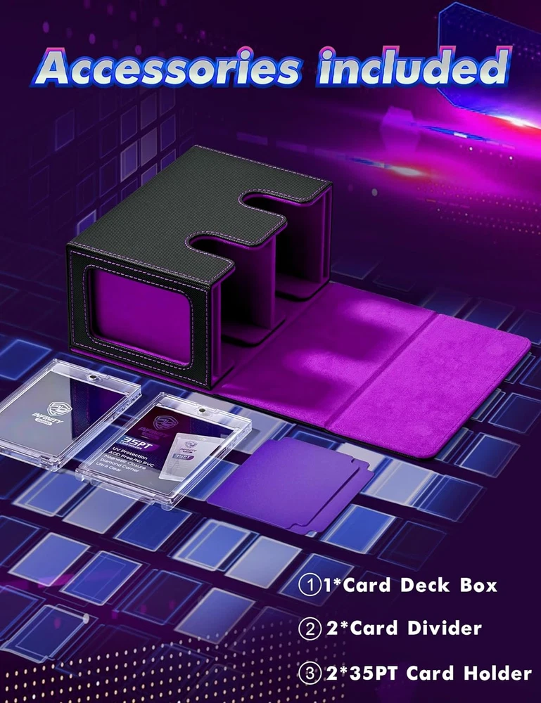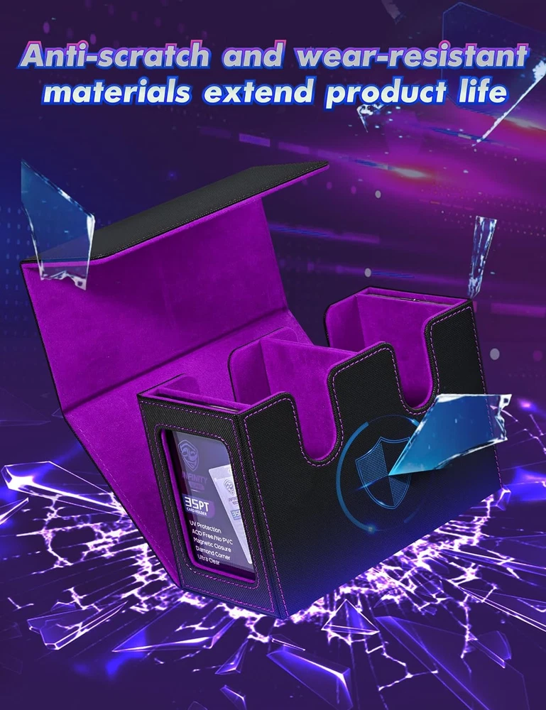 Menu Other Items Feedbacks About Us Contact Us Add To Favorites MTG Deck Box with 2 Commander Display, Double Deck Box for 280+ Single Sleeved Cards, Leather Magnetic Card Storage Box Fits for TCG CCG Magic Cards (Black&Purple) ๐๐จ ๐ง๐๐๐ ๐ญ๐จ ๐ ๐ฎ๐๐ฌ๐ฌ ๐ฐ๐ก๐๐ญ ๐๐๐๐ค ๐ข๐ญ ๐ข๐ฌ๏ผ Crafted with Commander EDH players in mind, our innovative design is tailor-made for your Commander deck. You can showcase your commander through the external display window: Frontline Command! It's also possible to hide your commander and surprise your enemies!!! ๐๐ซ๐๐ฆ๐ข๐ฎ๐ฆ ๐๐ฎ๐๐ฅ๐ข๐ญ๐ฒ๏ผ Featuring a sturdy and durable PU leather shell for shock protection and a soft microfiber interior to safeguard cards from scratches. The U-shaped wide mouth ensures easy card retrieval during gameplay, offering convenience and peace of mind ๐๐ฆ๐ฉ๐ฅ๐ ๐๐๐ฉ๐๐๐ข๐ญ๐ฒ๏ผ Tested with various popular sleeves, the Infinity Guard upgrade commander card deck boasts an impressive capacity, and 480+ sleeveless trading game cards easily. Also suitable for holding 140+ double-sleeved cards or 280+ single-sleeved cards ๐๐ญ๐ฎ๐ซ๐๐ฒ ๐๐ซ๐จ๐ญ๐๐๐ญ๐ข๐จ๐ง๏ผThe trading card storage box has a very strong magnetic closure even if you shake the card case hard it won't open and the trading cards won't fall out. Also, you are easy to access and take out your precious cards when you need them, very humanized and practical.The trading card storage box has a very strong magnetic closure even if you shake the card case hard it won't open and the trading cards won't fall out. Also, you are easy to access and take out your precious cards when you need them, very humanized and practical ๐๐๐๐จ๐ซ๐ญ๐ฅ๐๐ฌ๐ฌ ๐๐ซ๐ ๐๐ง๐ข๐ณ๐๐ญ๐ข๐จ๐ง๏ผ This card display box has a unique design with double-layer partitions inside to ensure that the cards are sorted in an orderly manner and fully protected to avoid confusion and damage. The two included dividers will allow you to divide the cards into different areas, making it easy to sort and organize your card collection Product Description Item Specification Style Arts And Crafts Number of Items 1 Closure Type Magnetic Country of Origin China Batteries Included? No Unit Count 1.0 Count Batteries Required? No Material Faux Leather Item Package Quantity 1 Item Weight 1.12 pounds Material Feature Durable and Shock Resistant Opening Mechanism Lift-Off Lid Special Features Impact Resistant Special Feature Impact Resistant Color Black&Purple Shape Rectangular Recommended Uses For Product For Trading Cards Size 260+ Product Dimensions 6.97"L x 4.84"W x 3.74"H Number Of Pieces 1 Dimensions Shipping Returns Additional Info Product Dimensions: 4.84 "h x 6.97 "h x 3.74 "h. Weight: 1.12 lb Fast shipping is very important for us. Our standard shipping service is FREE. Your order will be shipped within 1-3 business days upon full payment received. Most items are delivered within 3-5 business days, however, please allow 3-10 business days. We are shipping only to USA. We only ship to the confirmed Paypal address. We reserve the right to cancel any order for any reason at any time. We are not responsible for undeliverable addresses. We offer a 30 day return policy from checkout winning date. Your satisfaction is guaranteed! If for any reason you are unhappy with your item, just return it within 30 days for a full refund, minus shipping cost. Please contact us prior to initiating a return so that we can issue you a refund authorization. Items defective upon receipt must be packaged in their retail packaging as if new and returned with a detailed description of the problem. Return shipping fees are not refundable. We reserve the right to decline any returns if the above guidelines are not followed. All of our items, unless otherwise stated, will only run on 120 volts. Please check to make sure your country complies with these specifications. If you have a problem or question regarding your transaction please contact us before leaving any type of feedback. We will work with you to resolve any problem you may have.