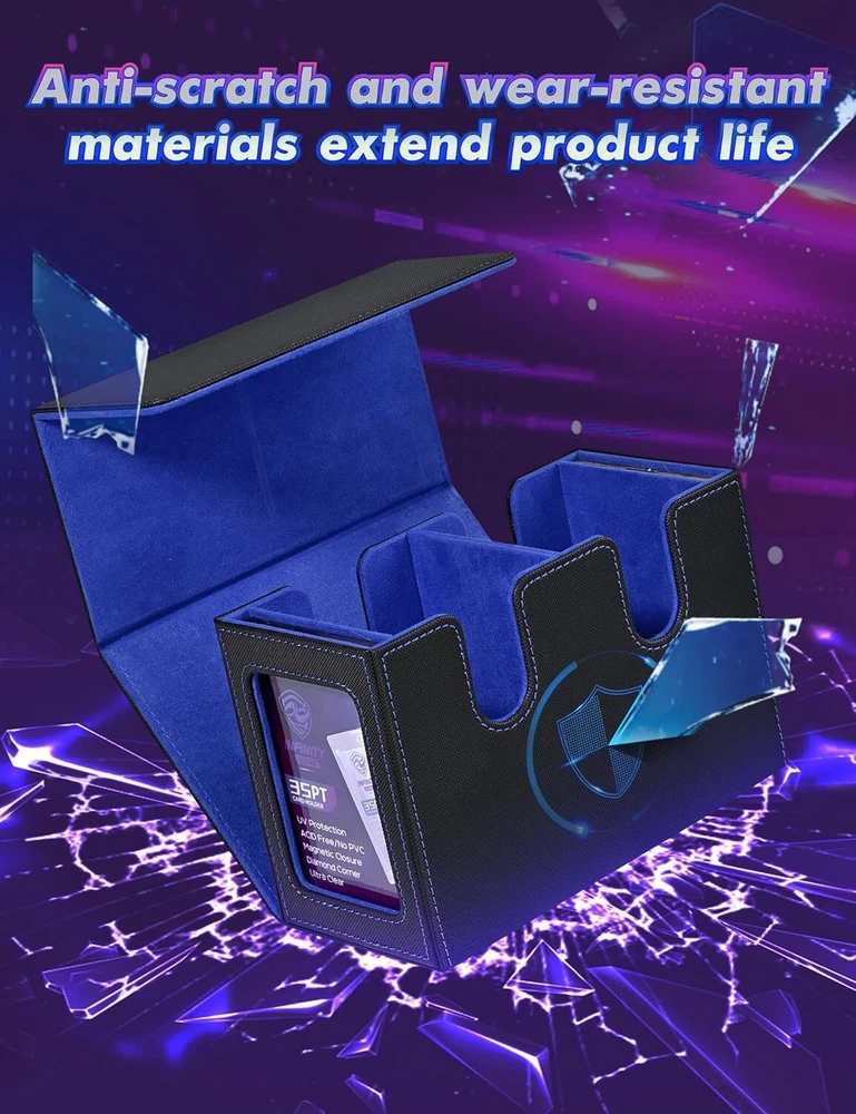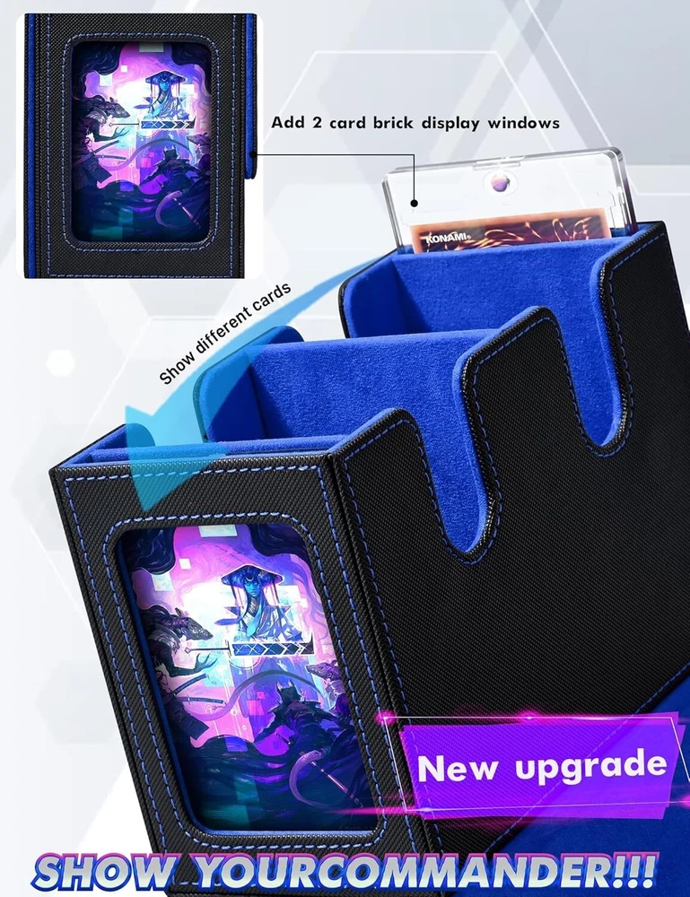 MTG Deck Box with 2 Commander Display, Double Deck Box for 280+ Single Sleeved C No Need to Guess What Deck It Is : Designed with Commander EDH players in mind, this innovative product is tailored for your Commander deck. You can showcase your commander through the external display window: Frontline Command! It's also possible to conceal your commander and surprise your opponents! Premium Quality : Featuring a sturdy and durable PU leather shell for shock protection and a soft microfiber interior to safeguard cards from scratches. The U-shaped wide mouth ensures easy card retrieval during gameplay, offering convenience and peace of mind. Ample Capacity : Tested with various popular sleeves, this upgraded commander card deck box boasts an impressive capacity, holding 480+ unsleeved trading game cards with ease. It’s also suitable for storing 140+ double-sleeved cards or 280+ single-sleeved cards. Sturdy Protection : The trading card storage box features a strong magnetic closure, ensuring it stays securely shut even when shaken. Your cards will remain safe and won’t fall out. Additionally, accessing and retrieving your cards is effortless, making it both practical and user-friendly. Effortless Organization : This card display box includes a unique double-layer partition design to keep your cards sorted and fully protected, preventing confusion and damage. The two included dividers allow you to separate your cards into different sections, making it easy to organize and manage your collection.