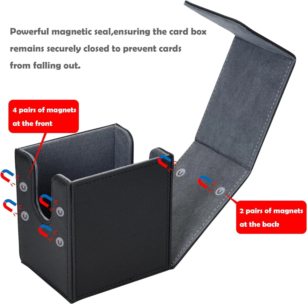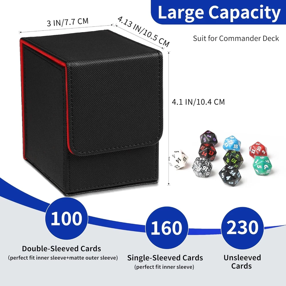 Ample Capacity: The MTG Commander Deck Box has exterior dimensions of 4 x 3.4 x 3 inches and interior dimensions of 3.74 x 2.75 x 2.63 inches; hold 80+ double-sleeved or 130+ single-sleeved cards, not compatible with top loaders Easy Card Access: The front and rear grooves of the Magic Deck Box make it easy to take out and retrieve cards; it also includes two card dividers to help efficiently organize and sort your collection Secure Magnetic Closure: The TCG Deck Box is equipped with 6 pairs of strong magnetic clasps, ensuring that cards do not shift during transport and use; it keeps the box securely closed even when inverted Dual Protection: The MTG card box Made with durable PU leather and soft microfiber lining, effectively protecting your cards even without sleeves and preventing damage Wide Compatibility: Our MTG deck boxes are suitable for various TCG, CCG, LCG and other collectible cards. They are compatible with MTG, YuGiOh, PTCG, OPCG and more, helping you manage and display your collection with ease Product Description 1 Easy to Retrieve 2 6 Powerful Magnets 3 Durable & Sturdy MTG Deck Box Add to Cart Add to Cart Add to Cart Add to Cart Add to Cart Add to Cart Customer Reviews 4.8 out of 5 stars 58 4.8 out of 5 stars 74 4.8 out of 5 stars 74 4.8 out of 5 stars 74 4.8 out of 5 stars 74 4.8 out of 5 stars 74 4.8 out of 5 stars 74 Price $9.99 $ 9 . 99 — $12.99 $ 12 . 99 $14.99 $ 14 . 99 $14.99 $ 14 . 99 $12.99 $ 12 . 99 $12.99 $ 12 . 99 Card Insertion Direction Horizontal Vertical Vertical Vertical Vertical Vertical Vertical Large Capacity 100+ Double-Sleeved Cards 100+ Double-Sleeved Cards 100+ Double-Sleeved Cards 100+ Double-Sleeved Cards 100+ Double-Sleeved Cards 100+ Double-Sleeved Cards 100+ Double-Sleeved Cards Copyrighted Pattern / Mana Lotus Black-green Dual-color White-blue Dual-color Elf Dragon Material Durable Leather Durable Leather Durable Leather Durable Leather Durable Leather Durable Leather Durable Leather Powerful Magnetic Seal ✔ ✔ ✔ ✔ ✔ ✔ ✔ Cutouts on Both Sides ✔ ✔ ✔ ✔ ✔ ✔ ✔ Come with 2 Dividers ✔ ✔ ✔ ✔ ✔ ✔ ✔