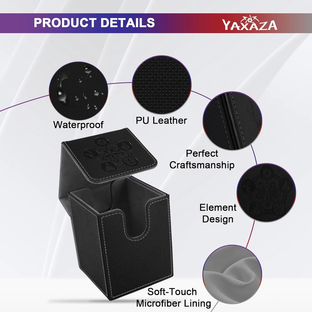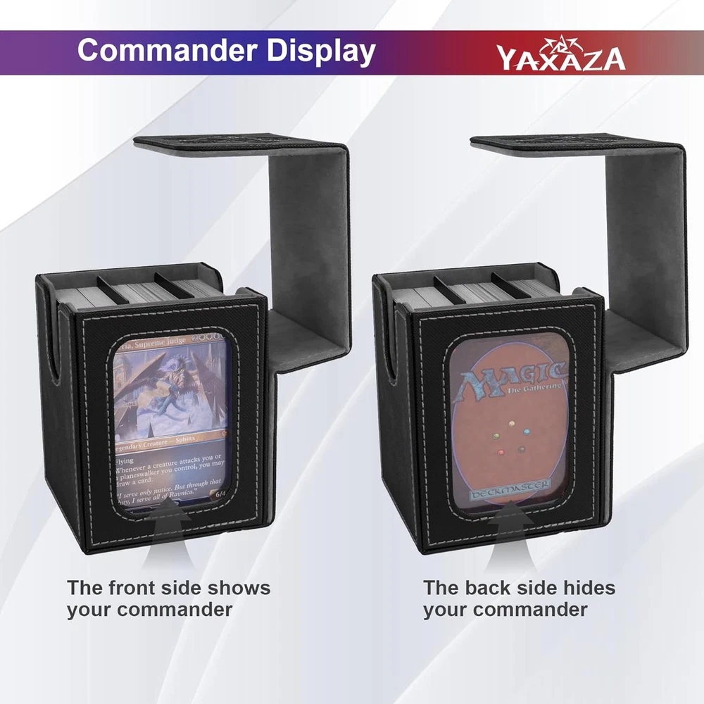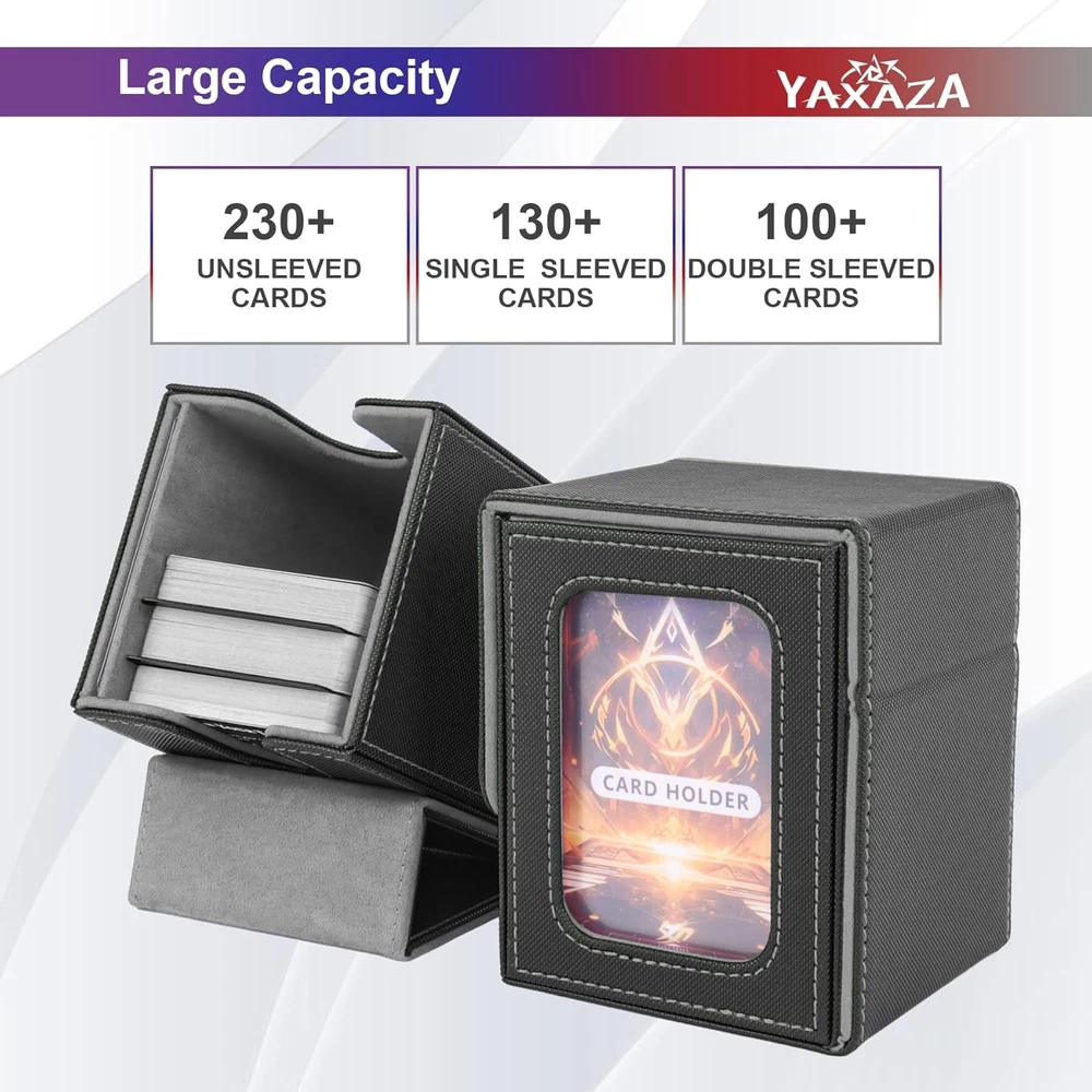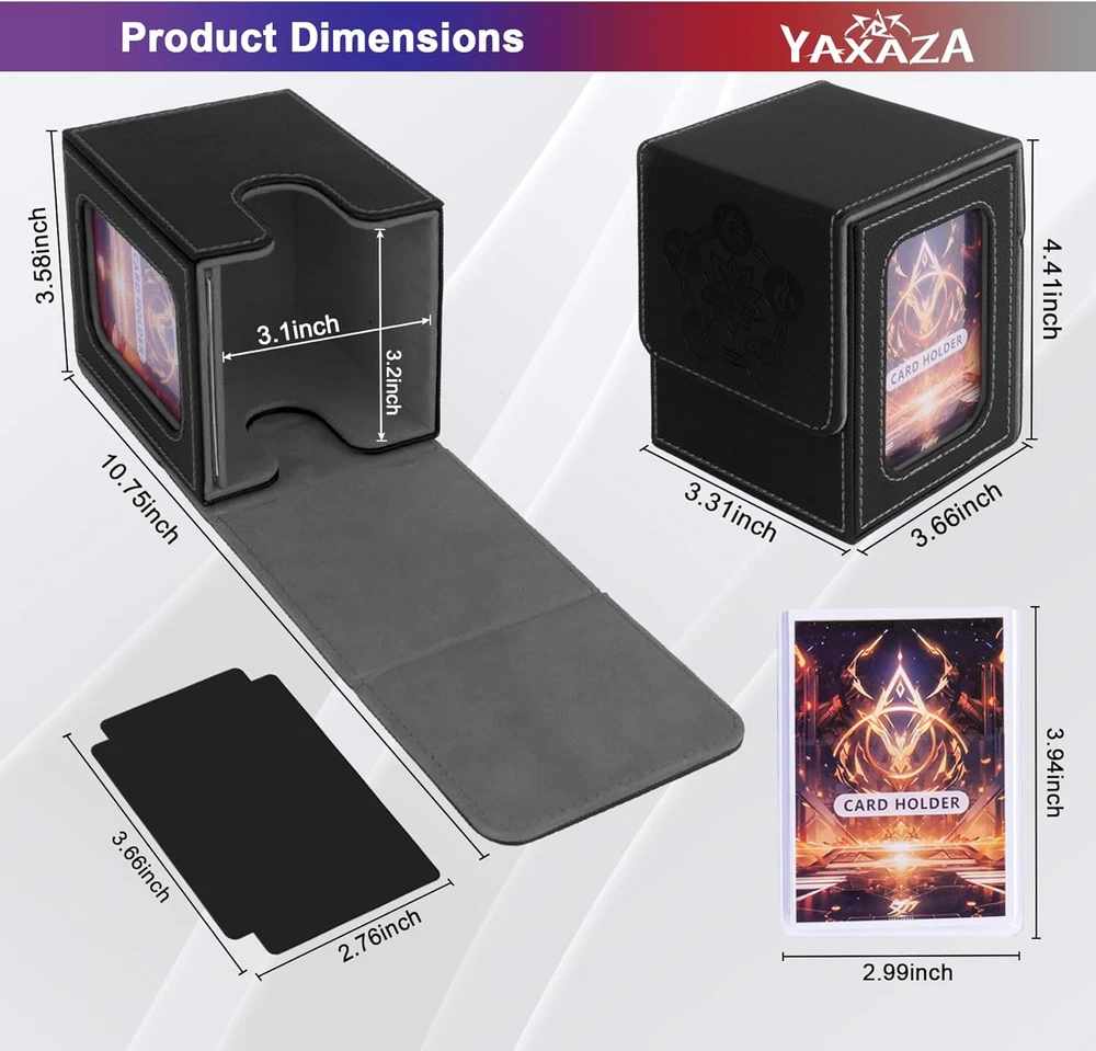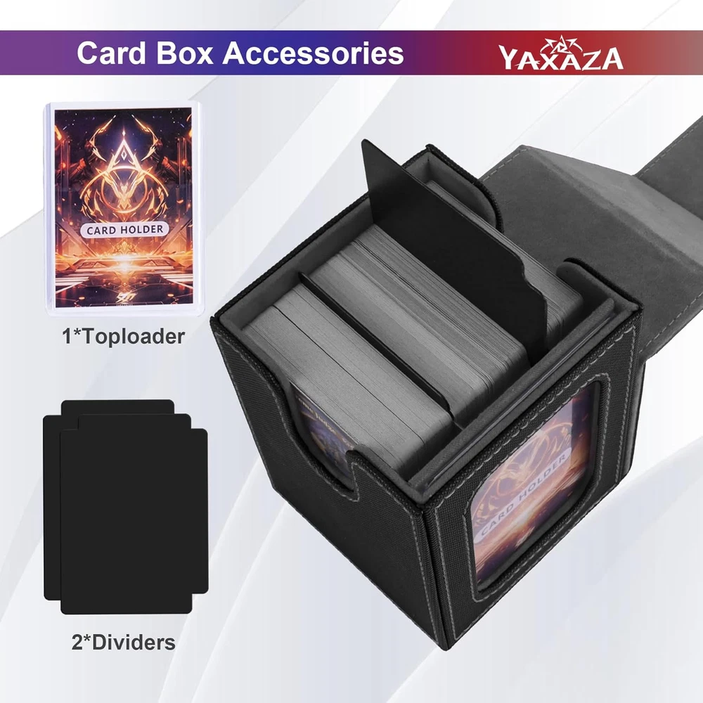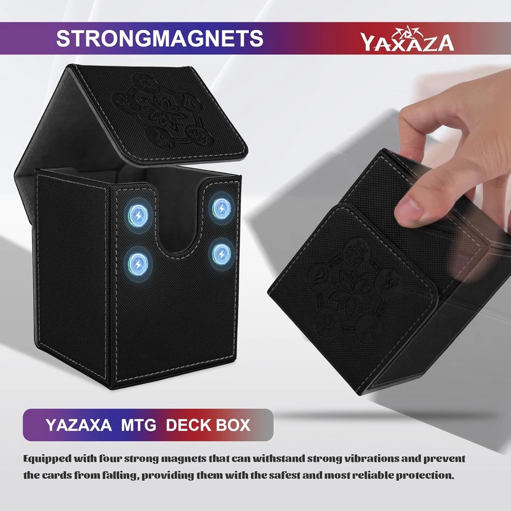 Strong Protection:YAXAZA mtg commander deck box equipped with a strong magnetic closure, ensuring the box remains securely shut and your cards are well-protected during transport; the microfiber lining not only cushions the cards but also ensures they slide in and out smoothly without catching or bending High-Quality Materials:The deck box mtg is crafted from premium pu leather, offering durability and a luxurious feel. Inside, this magic the gathering card box is lined with soft microfiber, providing a gentle surface that prevents scratches and wear on your cards Large Capacity:Card deck box designed to hold over 100 double-sleeved cards, ensuring ample space for your entire deck; the trading card storage box with generous dimensions, this deck box accommodates various card sizes and types, making it ideal for extensive collections Display Window Design:Magic the gathering deck box features a clear display window with a protective plastic cover, allowing you to prominently display and quickly identify your commander card; the window enhances the aesthetic appeal and functionality of the deck box by showcasing your deck’s key card Versatile Use:Suitable for multiple trading card games, including magic the gathering, pokemon, and yugioh, making it a versatile choice for collectors; designed to fit a wide range of card sizes, catering to various game formats and personal preferences Product Description YAXAZA MTG DECK BOX Strong Magnetism The magnetic closure keeps the box securely sealed, ensuring that cards won't scatter if the box is accidentally overturned or during transport PU leather card box PU leather is a synthetic material that mimics the look and feel of real leather. It is affordable, durable and easy to clean, making it a good choice for card lovers Strong Waterproof The deck box is designed to be water-resistant, making it a dependable option for daily use or for taking with you wherever you go YAXAZA MTG DECK BOX Add to Cart Add to Cart Add to Cart Add to Cart Add to Cart Customer Reviews 4.7 out of 5 stars 21 4.7 out of 5 stars 21 4.7 out of 5 stars 21 4.7 out of 5 stars 21 4.7 out of 5 stars 21 Price $24.99 $ 24 . 99 $24.99 $ 24 . 99 $24.99 $ 24 . 99 $24.99 $ 24 . 99 $23.74 $ 23 . 74 Material Faux Leather Faux Leather Faux Leather Faux Leather Faux Leather Color Black&Grey Black & Blue Black&Red Black &Purple Black&Grey Card dividers TWO TWO TWO TWO TWO Capacity 200+ double-sleeved cards 200+ double-sleeved cards 200+ double-sleeved cards 200+ double-sleeved cards 200+ double-sleeved cards Display Window One One One One —