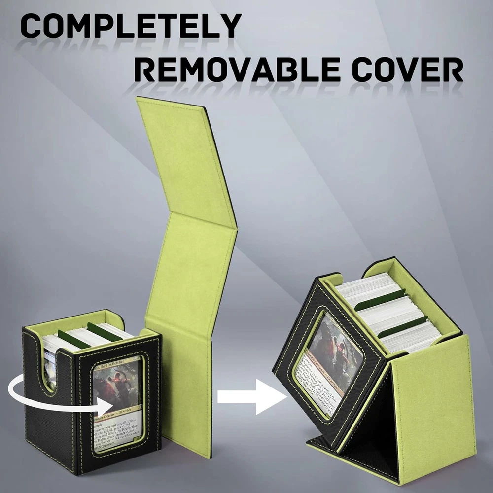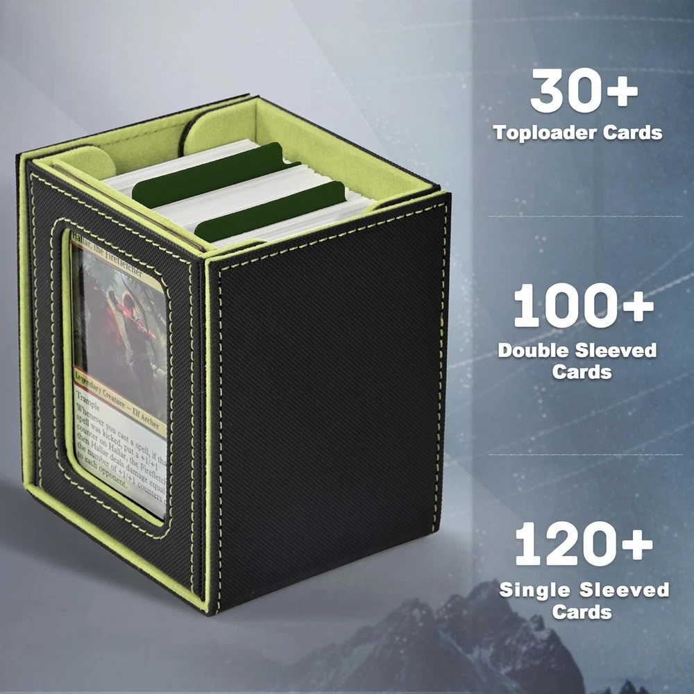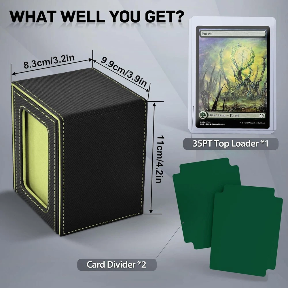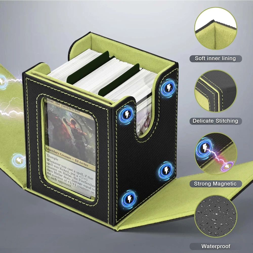 Card Capacity: 100 Units Country of Origin: China Material Feature: waterproof Material: Faux Leather gtin13: 705353115943 Batteries Required?: No Recommended Uses For Product: For Trading Cards Number of Items: 1 Item Package Quantity: 1 Included Components: 1deck box, 1top loader, 2Card Dividers Opening Mechanism: Lift-Off Lid Item Weight: 7.7 ounces Special Features: Portable Color: A5-Black&Green Batteries Included?: No Shape: Rectangular Item model number: V109T Number Of Pieces: 1 Type: Does not apply Closure Type: Flip Top Product Dimensions: 3.27"L x 3.9"W x 4.33"H UPC: 705353115943 Water Resistance Level: Waterproof Unit Count: 1.0 Count Special Feature: Portable Brand: Does not apply Style: Modern