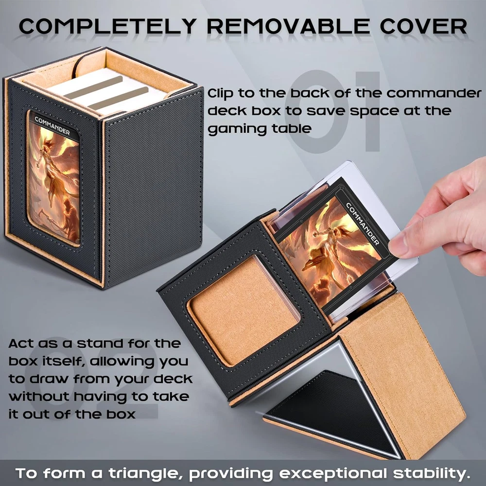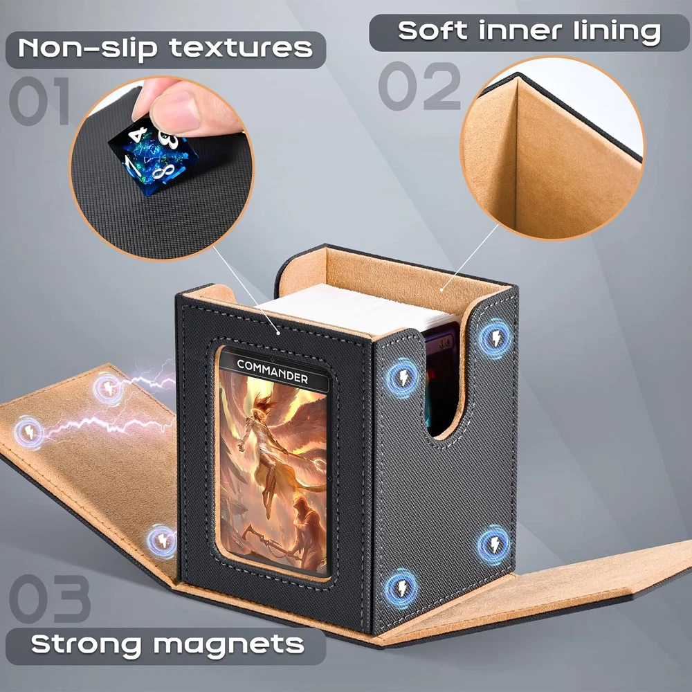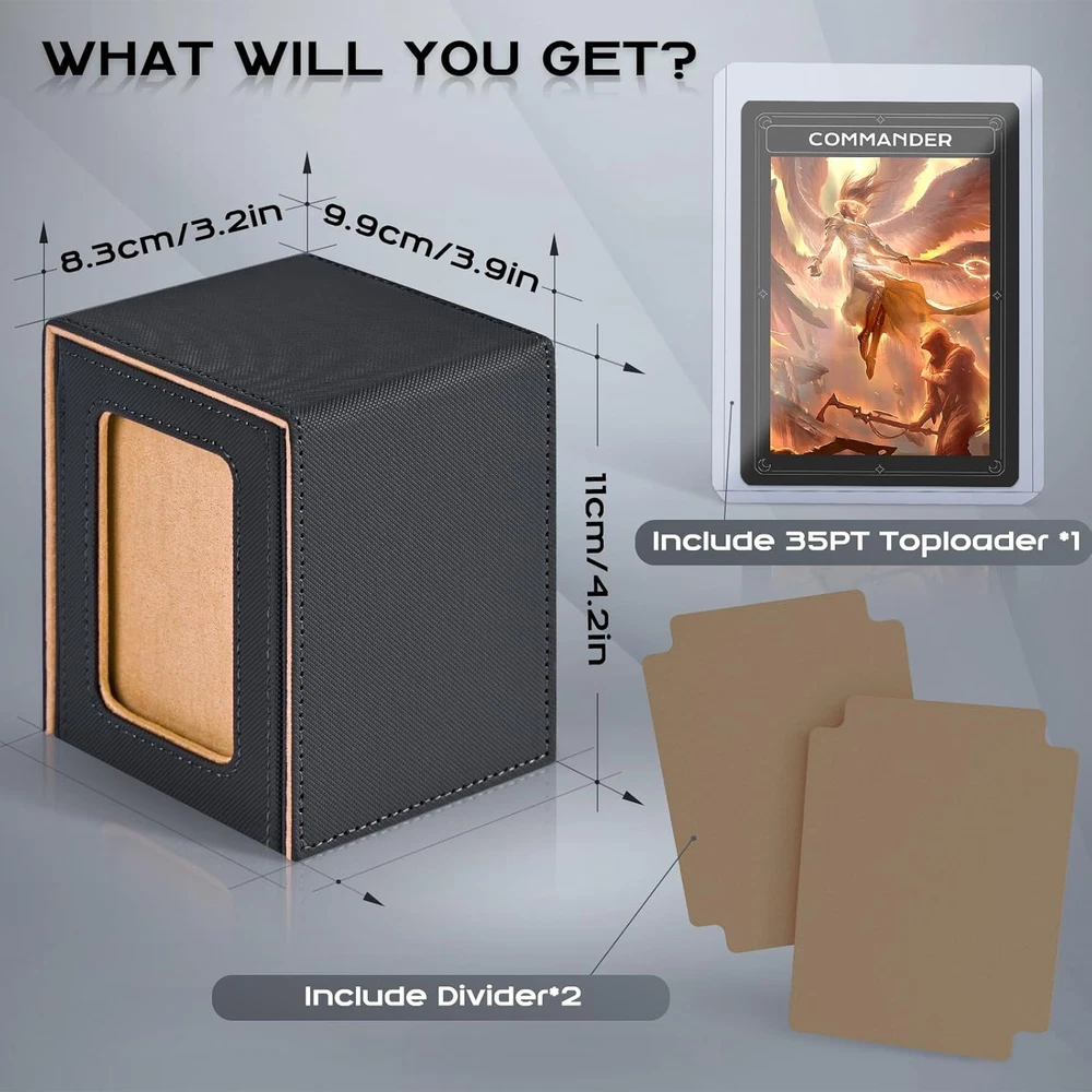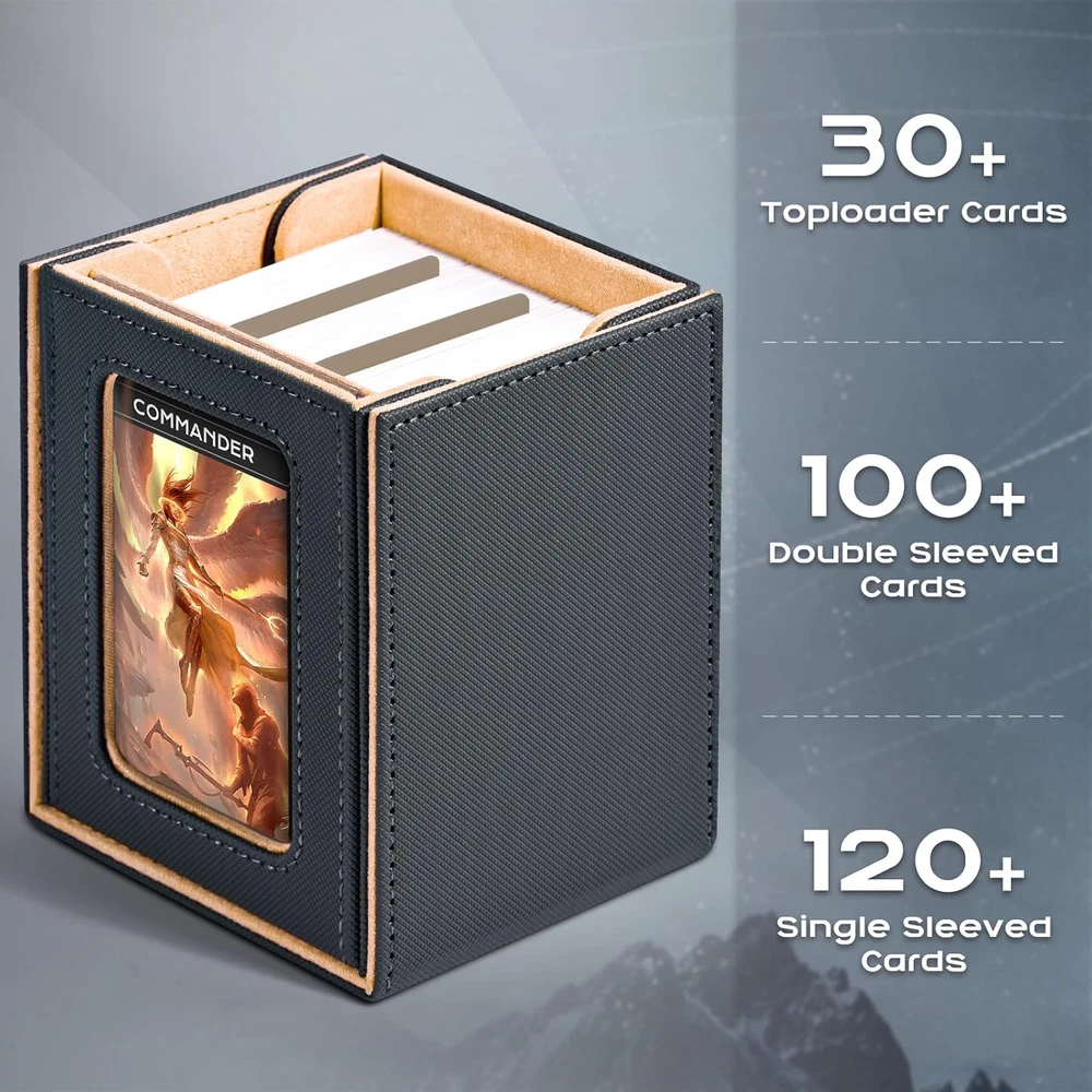 Patented Design:The display window on the lid adds a stylish touch to the deck box while allowing you to showcase your favorite card or artwork;This feature is especially appealing for collectors who want to display their prized cards(You can easily view the contents of the box without having to open) Durable Construction:Constructed from premium PU leather materials, ZLCA MTG Deck Box offers durability and protection for your cards;The robust design ensures that your cards remain safe during transport and storage, minimizing the risk of damage or wear Ample Storage:With a capacity to hold up to 230+ unsleeved cards, 120+ single-sleeved cards, or 100+ double-sleeved cards;The compact size and lightweight construction make it convenient to carry around, whether you're heading to a tournament or gaming night with friends Bonues Items Included:To better protect your commander character card, we provide you with a 35PT top loaders for cards, and two additional dividers are included to help you classify your cards more effectively Keep your cards neatly organized Compatibility with Various Games:While designed with TCG Commander decks in mind, this deck box proves to be versatile enough to accommodate cards for Shadowverse Evolve/PTCG/CCG/EDH/Sports cards Product Description ππΏπΆπ΄ πΆπ΄π π· π·πΈπΆπΎ π΅ππ Add to Cart Add to Cart Add to Cart Add to Cart Customer Reviews 4.9 out of 5 stars 241 4.7 out of 5 stars 287 4.7 out of 5 stars 455 4.7 out of 5 stars 455 4.7 out of 5 stars 669 β 4.7 out of 5 stars 11 Price $13.49 $ 13 . 49 $24.99 $ 24 . 99 $11.04 $ 11 . 04 $19.99 $ 19 . 99 $9.99 $ 9 . 99 β $99.99 $ 99 . 99 π΄ππππ π πππππ Divider * 2/ toploader * 1 35pt Magnetic Card Holder *1 Divider * 10/ toploader * 1 Divider * 10 Divider * 2 Divider * 2 Playmate * 1 πππ§π 3.9*3.2*4.3 inch 8.8*3.9*4.8 inch 11.3*3.7*4.3 inch 11.3*9.4*4.1 inch 4.1*3.5*3.1 inch 3.2*3.1*4.1 inch 16.2*7.6*3.6 inch πππππ£ππ πΆππππ 120+ 300+ 600+ 1800+ 120+ 100+ 1200+ πΉππ‘ πππ sleeved cards/ toploader sleeved cards/card holders sleeved cards/ toploader sleeved cards only sleeved cards only sleeved cards only sleeved cards/ small deck box π·πππ ππππ¦ β β β β β β β