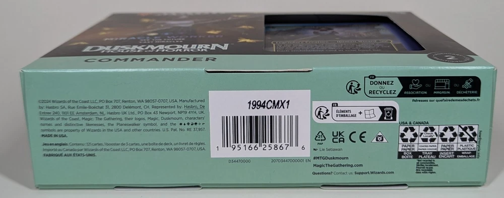 Item : The box pictured is the box you are buying. Factory Sealed. Shipping : Your item will ship the next business day via USPS Ground Advantage. Product Details: Usefate-shifting powers to cast miracles and see a future where you’re the one winning the game. Every Duskmourn: House of Horror Commander Deck includes 2 Traditional Foil Legendary Creature cards featuring spine-tingling Borderless art. Each deck also comes with a 2-card Collector Booster Sample Pack containing 2 cards from the Duskmourn: House of Horror set, including 1 alt-border Rare or Mythic Rare and at least 1 Traditional Foil card. Contents: Each Duskmourn: House of Horror Commander deck includes the following: 1 Ready-to-play 100-card deck, including: 1 Traditional foil borderless face commander 1 Traditional foil borderless feature dcommander 8 New-to-Magic cards 10 Non-foil double-sided tokens 10 Scheme cards for use in the Archenemy format 1 Deck box 1 Duskmourn: House of Horror Collector Booster Sample Pack 1 Life wheel 1 Strategy insert