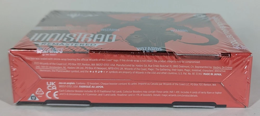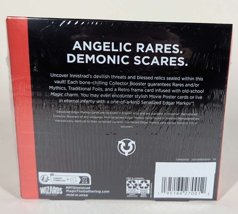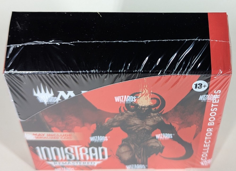 Item : The box pictured is the box you will receive. It is Factory Sealed. Product Details Return to the plane of glorious gothic horror and dig up fan-favorite reprints from every Innistrad set ever made with Innistrad Remastered. Cackle with delight at Showcase treatments from Innistrad’s past and behold all-new borderless art that’s hauntingly boo-tiful. Plus, every booster arrives nostalgia-packed with a Retro frame card! Uncover Innistrad’s most devilish threats and blessed relics. Collector Boosters are possessed with rare and/or mythic rare cards guaranteed, plus traditional foils and special treatments you won’t find anywhere else—like a Serialized Edgar Markov* card, the first vampire of Innistrad. A full Collector Booster display contains angelic rares and demonic scares—with plenty of nostalgia to spare. *Serialized Edgar Markov cards are localized in English only and are available in Innistrad Remastered Collector Boosters of any language. Non-serialized Edgar Markov cards found in Innistrad Remastered are mechanically identical to their serialized variants. 1 serialized Edgar Markov card can be found in <1% of boosters. Contents: 12 Innistrad Remastered Collector Boosters 15 Magic: The Gathering cards per booster Each Collector Booster may contain these cards: INR 1–491 Each Collector Booster includes 10-11 traditional foil cards 4 cards of rarity Rare or higher 3–6 Uncommon cards 4–7 Common cards 1 Land cards Headliner card in <1% of boosters.