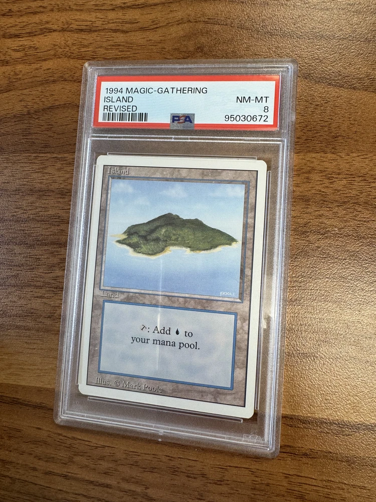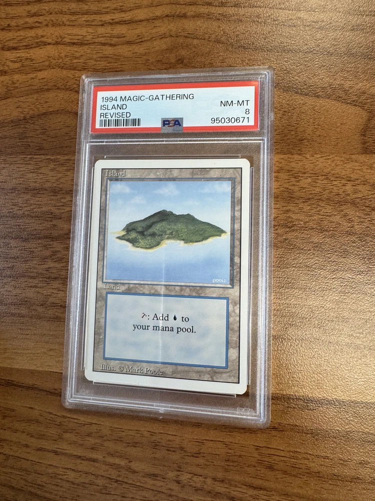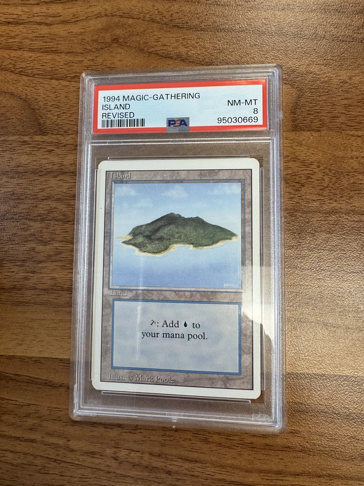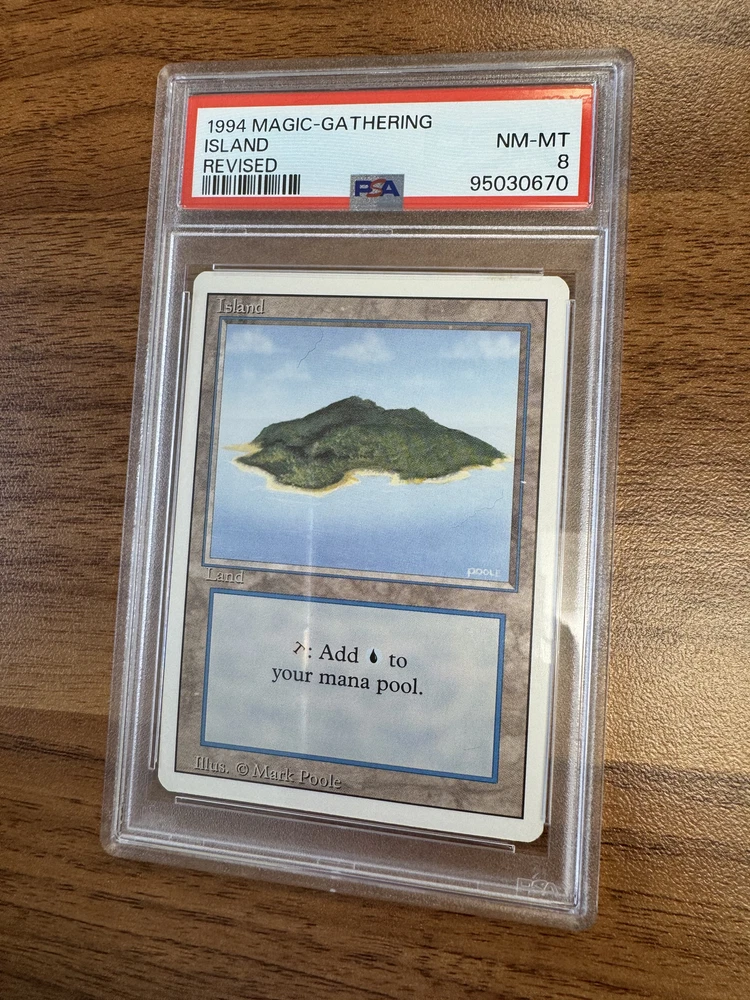 This MTG Island Revised Edition Regular Land PSA8 is a great addition to any Magic: The Gathering collection. With its beautiful artwork by Mark Poole and its rarity as a Land card, it's sure to impress both collectors and players alike. The card has been professionally graded by 275010 and has a grade of 275024, making it a valuable find for anyone looking to expand their collection.The card's certification number is 95030673 and it comes from the Revised Edition set. This Basic Land card is perfect for anyone looking to add some color to their deck. Whether you're a seasoned player or just starting out, this card is sure to impress.