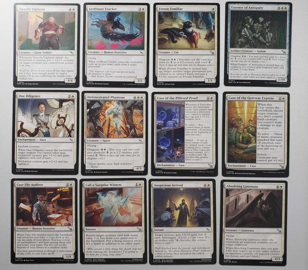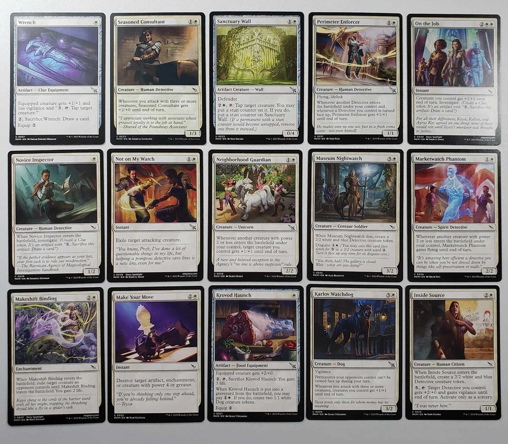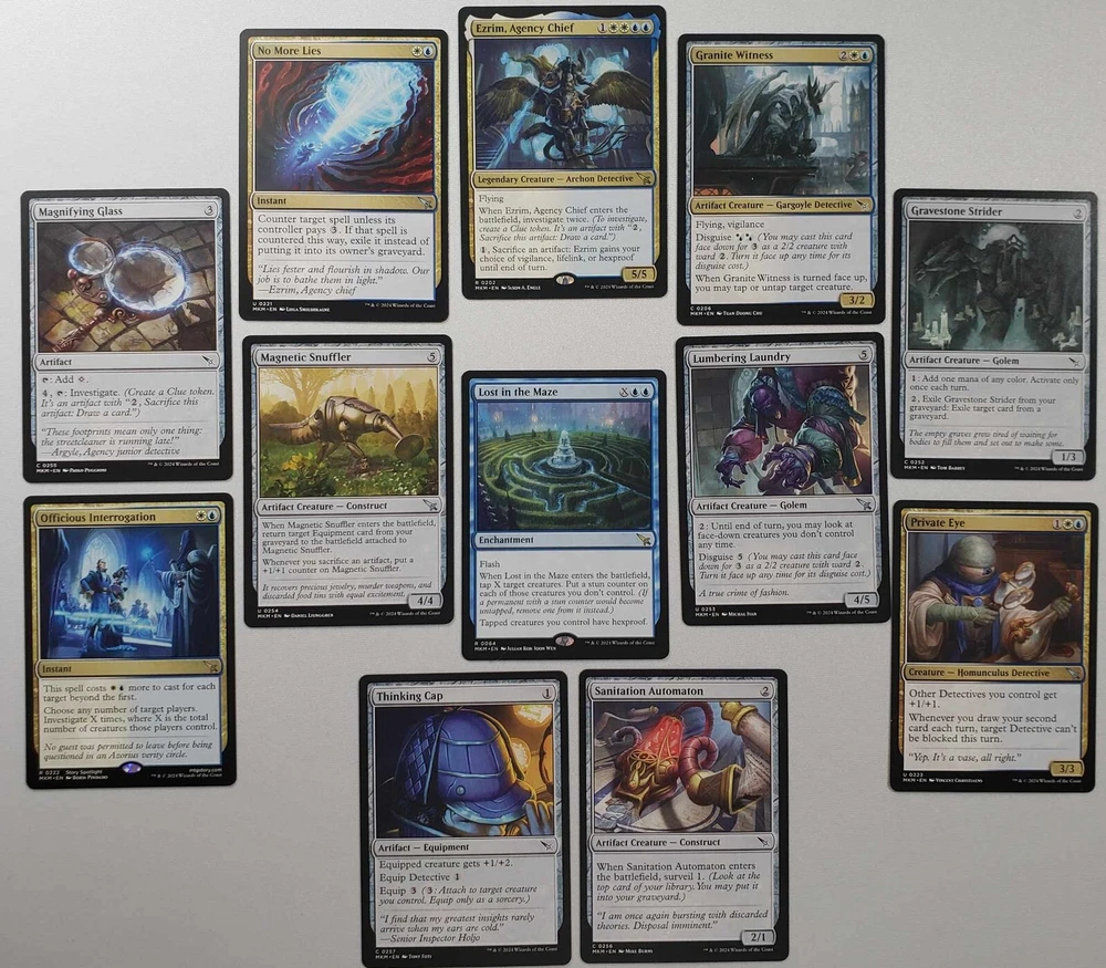 Magic the Gathering Commander Deck MKM Murders at Karlov Manor Edition Ezrim, Agency Chief (Blue & White) Each Commander deck is complete. It contains 100 cards and is legal for play at a sanctioned Magic the Gathering Commander event. Note that the version (Foil, Showcase, Extended Art, etc) of some cards you receive may vary from the ones pictured, but every version included is tournament legal. These decks are not legal in other formats; only Commander. UNRAVEL THE MYSTERY In a city that needs investigating, you’re the one on the job. Find out who committed the murders at Karlov Manor … before you become their next victim. Designed with brand new cards from the Murders at Karlov manor expansion set, this ready-to-play Commander deck showcases the detective noir theme of the set. MKM is a murder mystery; employ detectives, uncover clues, collect evidence, and solve the case! Special Offers are automatically applied to all items you add to your shopping cart from the BobmanMTG Store. View your shopping cart before checking out to see your savings. Deck List Commander (1) 1x Ezrim, Agency Chief Creature (36) 1x Absolving Lammasu 1x Agency Outfitter 1x Benthic Criminologists 1x Bubble Smuggler 1x Case File Auditor 1x Cold Case Cracker 1x Crimestopper Sprite 1x Defenestrated Phantom 1x Essence of Antiquity 1x Exit Specialist 1x Forensic Researcher 1x Forum Familiar 1x Furtive Courier 1x Granite Witness 1x Gravestone Strider 1x Griffnaut Tracker 1x Haazda Vigilante 1x Hotshot Investigators 1x Inside Source 1x Jaded Analyst 1x Karlov Watchdog 1x Living Conundrum 1x Lumbering Laundry 1x Magnetic Snuffler 1x Marketwatch Phantom 1x Mistway Spy 1x Museum Nightwatch 1x Neighborhood Guardian 1x Novice Inspector 1x Perimeter Enforcer 1x Private Eye 1x Projektor Inspector 1x Sanctuary Wall 1x Sanitation Automaton 1x Seasoned Consultant 1x Surveillance Monitor Instant (13) 1x Auspicious Arrival 1x Behind the Mask 1x Deduce 1x Eliminate the Impossible 1x Make Your Move 1x No More Lies 1x Not on My Watch 1x Officious Interrogation 1x On the Job 1x Out Cold 1x Reasonable Doubt 1x Sudden Setback 1x Unauthorized Exit Enchantment (10) 1x Burden of Proof 1x Case of the Filched Falcon 1x Case of the Gateway Express 1x Case of the Pilfered Proof 1x Curious Inquiry 1x Dramatic Accusation 1x Due Diligence 1x Fae Flight 1x Lost in the Maze 1x Makeshift Binding Land (34) 1x Branch of Vitu-Ghazi 1x Escape Tunnel 15x Island 15x Plains 1x Public Thoroughfare 1x Scene of the Crime Artifact (5) 1x Candlestick 1x Krovod Haunch 1x Magnifying Glass 1x Thinking Cap 1x Wrench Sorcery (1) 1x Call a Surprise Witness