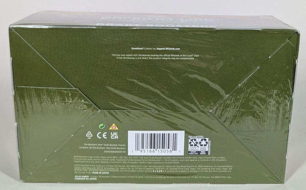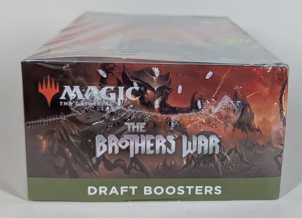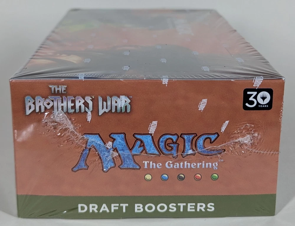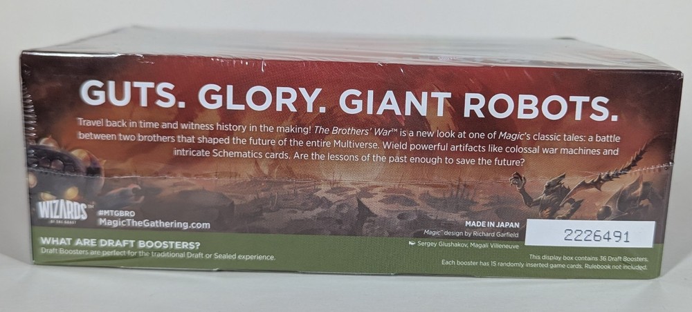 Item : The box pictured is the box you will receive. It is factory sealed. Product Details: The Brothers’ War Draft Booster Box contains 36 The Brothers’ War Draft Boosters. Each Draft Booster contains 15 cards and 1 token/ad card, including 1 card of rarity Rare or higher, 1 card of rarity Uncommon or higher, 3 Uncommon cards, and 10 Common cards. Traditional Foil Borderless Mythic Planeswalker in less than 1% of boosters. Land card replaces a Common in 25% of boosters. Traditional Foil of any rarity replaces a Common in 33% of boosters. Contents: 36 The Brothers’ War MTG Draft Boosters—the best boosters for drafting The Brothers’ War 15 Magic cards per booster At least 1 card of rarity Rare or higher in every pack 1 Traditional Foil card in 33% of packs Travel back in time to command powerful artifacts and giant robots
