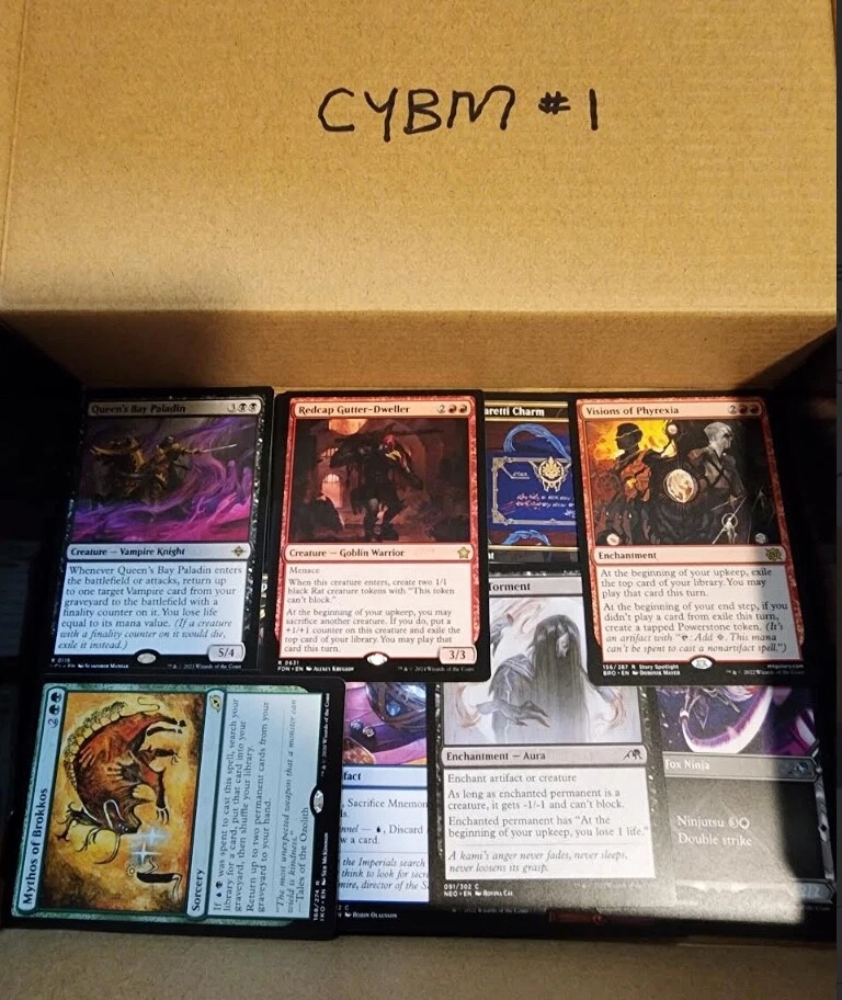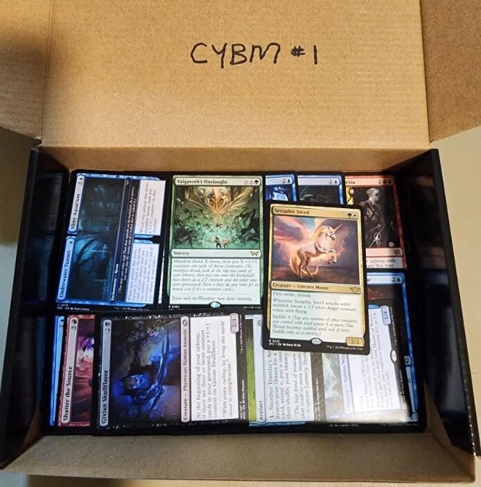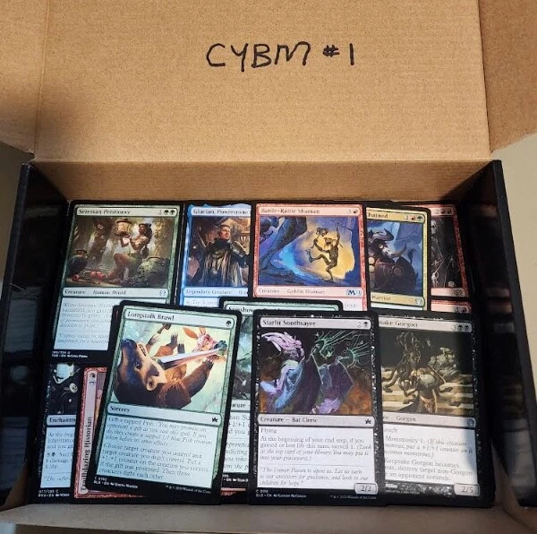 MTG cards bulk lot (box shown) FREE SHIP [Box ID: CYBM1] Not all cards sleeved (possibly: none sleeved). Cards are clean, generally unplayed (pack fresh) in NM and LP condition. A rare damaged or MP/HP may slip past us and be included: check our reviews to see if this is a common occurrence. We strive for all cards to be NM/LP. Picture above is actual product and box sold. Visible cards are in box. Value Note: The primary value is derived from the cards visible. The bulk is a bonus for each order and can vary from listing to listing Sales final, no returns. Thanks and let me know of any questions. Box size is 9"x6"x2". Thanks for stopping by! Rock Fortress Trading Box ID:CYBM1