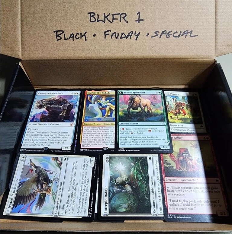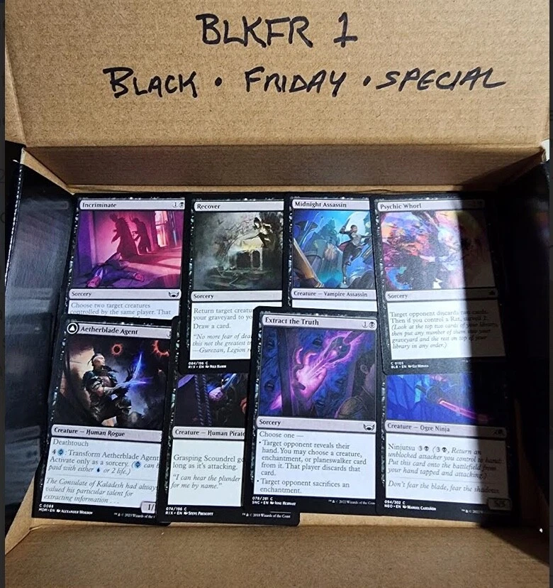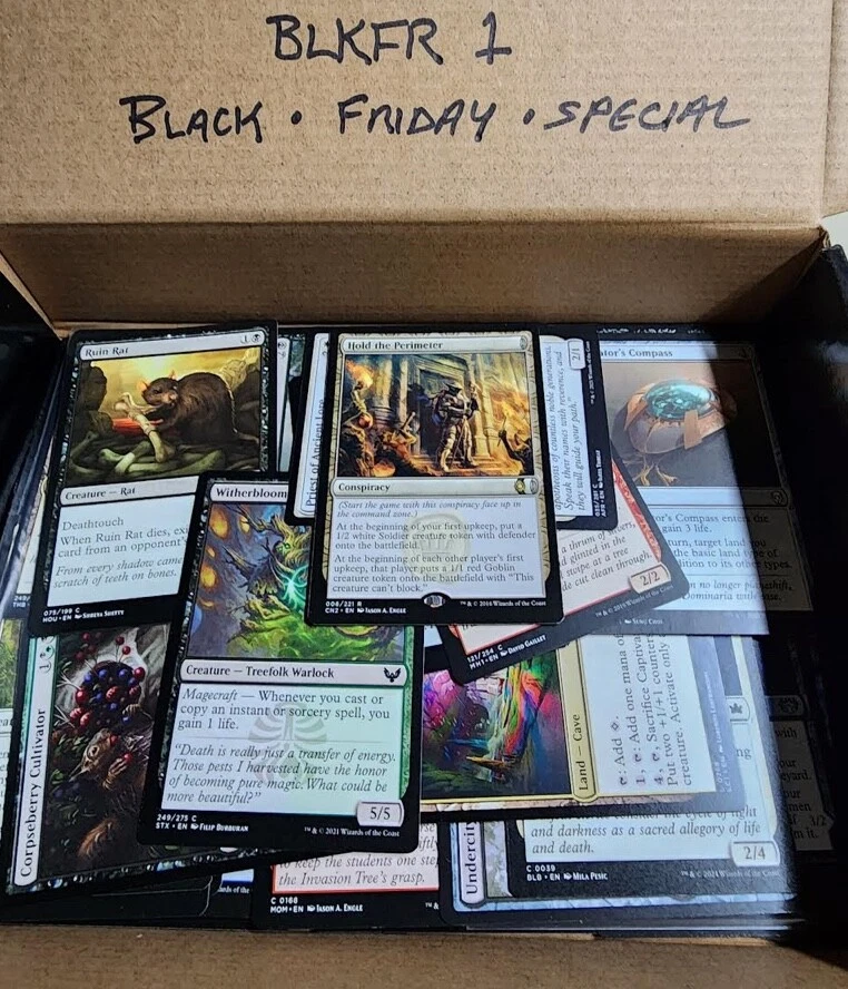 MTG cards bulk lot (box shown) FREE SHIP [Box ID: blkfr1] Not all cards sleeved (possibly: none sleeved). Cards are clean, generally unplayed (pack fresh) in NM and LP condition. A rare damaged or MP/HP may slip past us and be included: check our reviews to see if this is a common occurrence. We strive for all cards to be NM/LP. Picture above is actual product and box sold. Visible cards are in box. Value Note: The primary value is derived from the cards visible. The bulk is a bonus for each order and can vary from listing to listing Sales final, no returns. Thanks and let me know of any questions. Box size is 9"x6"x2". Thanks for stopping by! Rock Fortress Trading Box ID:blkfr1