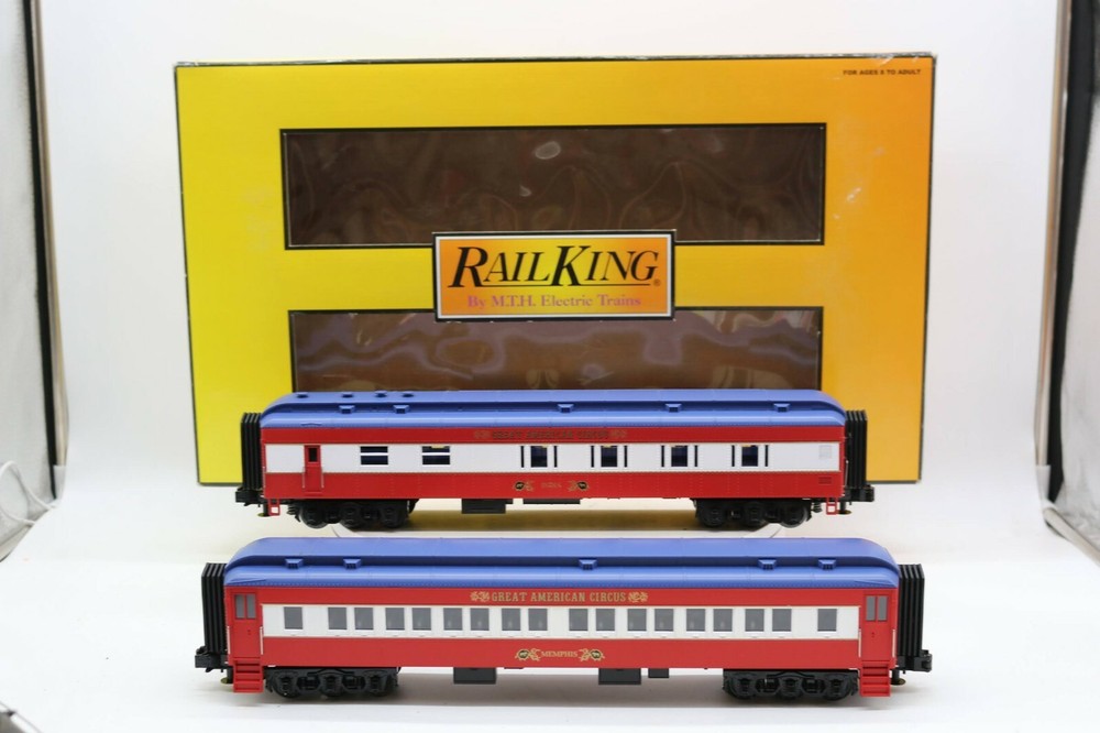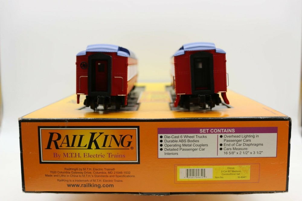 MTH 30-6941 RailKing O/O-27 Circus Madison Combo/Diner Set (Set of 2) EX PLEASE see photos for detailed condition!! There may be pieces that are missing or broken including, but not limited too, couplers, brake wheels, steps, ladders, railings, etc. May need detailed cleaning. PLEASE LOOK AT THE PHOTOS CAREFULLY BEFORE PURCHASING!! If you are purchasing more than one item from us and would like combined shipping, PLEASE request an adjusted invoice from us while still in the cart and BEFORE paying. eBay does not usually calculate combined shipping accurately and you might get overcharged. Please be aware that when we photograph items, we use lighting that will show the details well. Although we try to present the product as accurately as possible, the lighting may affect the overall look of the item by appearing lighter/darker or possibly a different hue than the actual item. Depending on the type of lighting you have in your home, there may be some differences between the photos and the actual item. If this is a concern of yours, please feel free to request additional photos made in natural lighting or ask for a more detailed description of the item PRIOR TO PURCHASE! PLEASE NOTE: We greatly appreciate your interest in our item for sale. We look forward to a pleasant, quick and satisfying transaction for everybody, so please note the following information before bidding. Thank you! ITEM DESCRIPTIONS: * We will try to describe items well and provide plenty of photos. Please review these carefully before bidding or purchasing. * Only the items pictured and described are what you will receive when purchased. * We will occasionally offer an item clearly marked "AS-IS". This means that we are not sure if it works because we are unable to test it for whatever reason. We will offer these at a discounted price than a similar "working" item. It is possible that these items will work fine, but it also is possible that these items are more useful for their parts. Please only bid on or purchase these items if you are well aware of this, as we will only provide refunds of actual item price (no shipping cost refunds) for these items. * If you have any questions that aren't addressed by the descriptions or photos, please feel free to ask before you bid. SHIPPING: * We usually do not offer shipping to international addresses, but ARE WILLING TO TAKE CONSIDERATIONS. * We try to pack items as carefully as possible, but damage may occur during shipping. If you receive an item that was damaged in shipping, please contact us and we will work with you to resolve the problem. * We will combine shipping costs for all items the same buyer purchases from us within 2 days. Please wait to pay for items until you're done shopping with us. Please contact us if you're expecting to buy more items from us, or to have us adjust the shipping costs. * We will usually ship items out within 24 hours of payment being received Sunday through Friday at noon. We will notify the buyer if there will be a delay in shipping for some reason. Please allow additional time for holidays and weekends when the post office is closed. If payment is received after noon (EST) on Friday, the item might not be shipped until the following Monday. * We do try to recycle shipping materials as much as possible. RETURNS: We abide by eBay's Money Back Guarantee. We definitely want our customers to be happy with their purchase! You may return an item within 30 days of receiving it with the following guidelines: * If the item is defective or damaged (unless we clearly marked the listing "AS-IS"), the buyer will receive a full refund after the buyer returns it and it is received by us. Customers who falsely claim their item is defective, damaged, or not as described in order to receive a full refund and free return shipping will be permanently blocked from making future purchases from us. * If the item is as described (including "AS-IS" items) and the buyer decides for any other reason than defective/damaged to return it, only the actual price of the item will be refunded once it has been returned and it is received by us. The buyer will be asked to pay all original and return shipping charges. This includes all reasons other than defective/damaged, including wrong size, wrong type, changed mind, etc. All "AS-IS" items will fall into this category of return. Please make sure the item is what you want before purchasing it. * Please contact us before initiating a refund request. FEEDBACK: We always leave feedback at the end of transaction. We consider the transaction to be over when we receive feedback from the buyer confirming the item arrived satisfactorily. If you are unsatisfied with your purchase please contact us before leaving neutral or negative feedback. WE APPRECIATE POSITIVE FEEDBACK IF YOU ARE SATISFIED WITH YOUR PURCHASE! THANK YOU FOR YOUR INTEREST IN THIS ITEM!