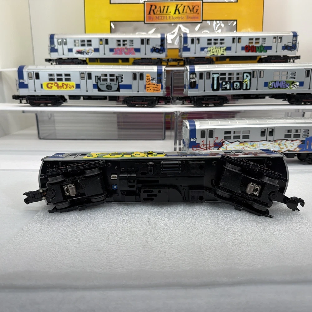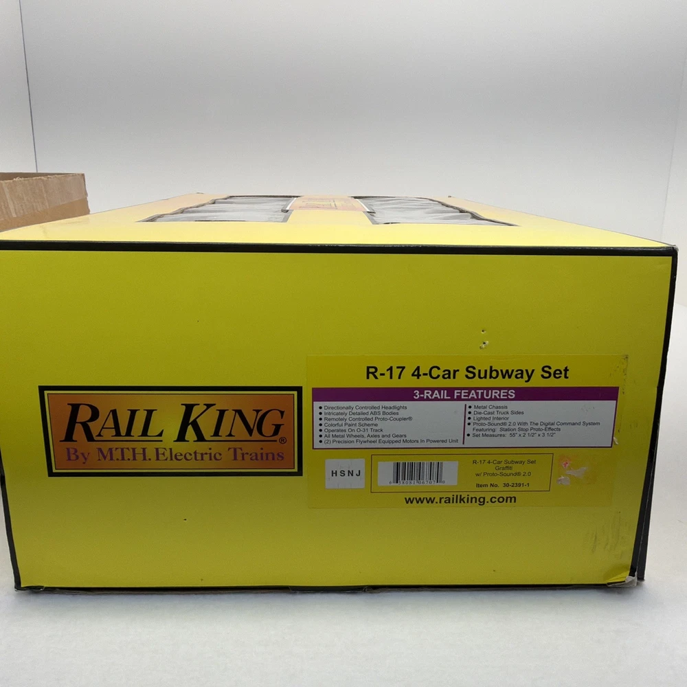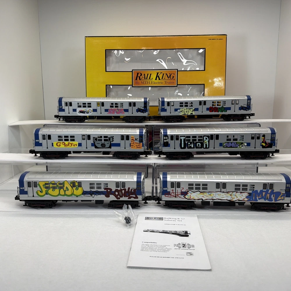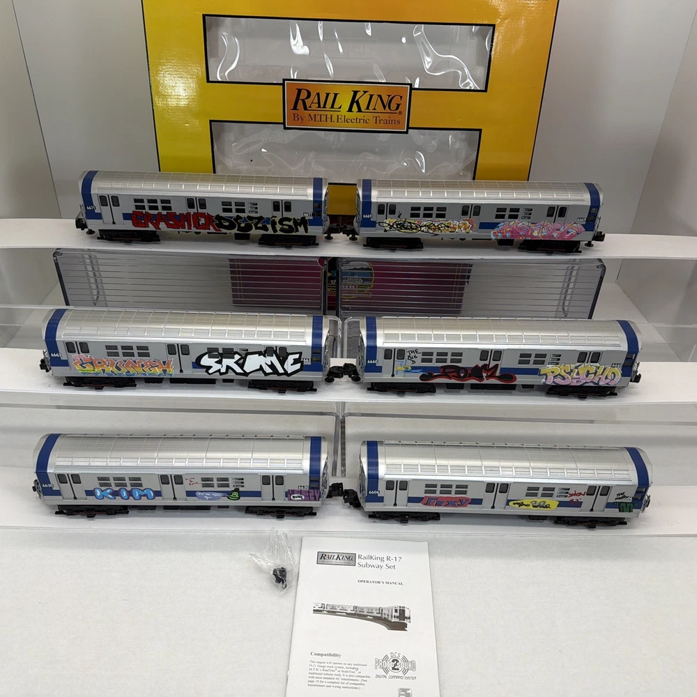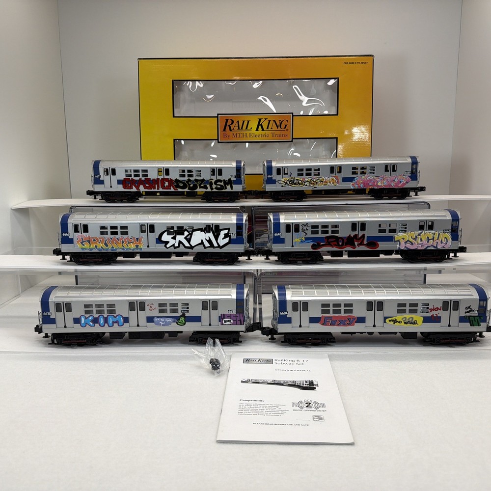 MTH RAILKING GRAFFITI R-17 6-CAR SUBWAY SET WITH PROTOSOUND 2 O GAUGE THREE RAIL POWER/DUMMY/DUMMY/DUMMY/DUMMY/DUMMY 4 CAR SET 30-2391-1 3 VOLT BOARD 2 CAR ADD-ON SET 30-2393-3 ORIGINAL BOX! USED!! BENCH TESTED WITH DCS AND ALL FUNCTIONS WORKING PROPERLY . DCS SHOWS 956 SCALE MILES. INSTRUCTION MANUAL.. NICE SOUND. 3 VOLT BATTERY TESTED OK. HARD TO FIND SET. WITH ADD-ON SET. MISSING ORIGINAL BOX FOR ADD-ON SET. ONE POWER UNIT. 5 DUMMY CARS. - Directionally Controlled Headlights - Intricately Detailed ABS Bodies - Metal Wheels and Axles - Remotely Controlled Proto-Couplerr - Authentic Paint Scheme - Operates On O-31 Track - All Metal Wheels and Gears - Illuminated Number Boards - (2) Precision Flywheel Equipped Motors In Powered Unit - Locomotive Speed Control - Metal Chassis - Die-Cast Truck Sides - Lighted Interior - Proto-Sound 2.0 With The Digital Command System Featuring:- Station Stop Proto-Effects - Unit Measures:82 1/2" x 2 1/2" x 3 1/2" Winning US bidder receives FREE SHIPPING USPS UPS! Canada Priority shipping is available . All other countries please email for a mailing quote. Thanks for looking I ship everyday!!!!
