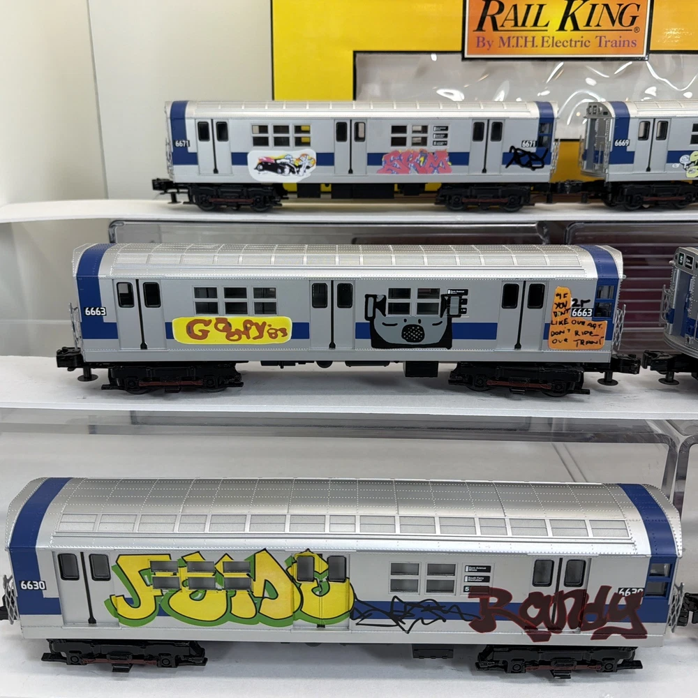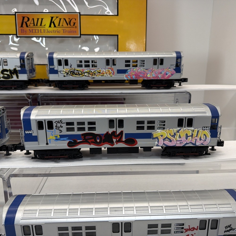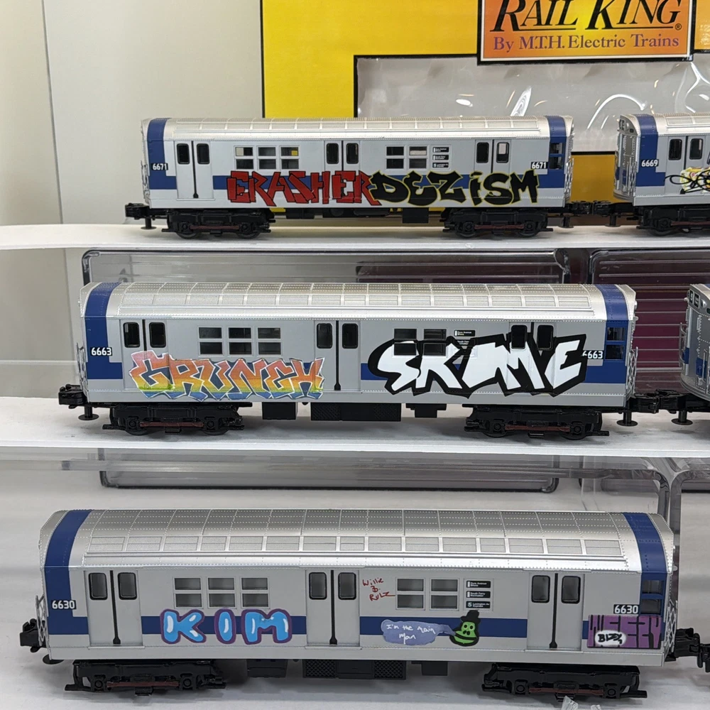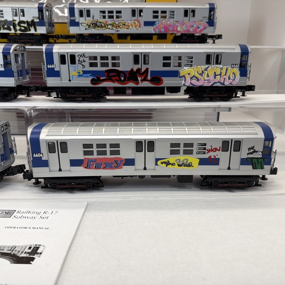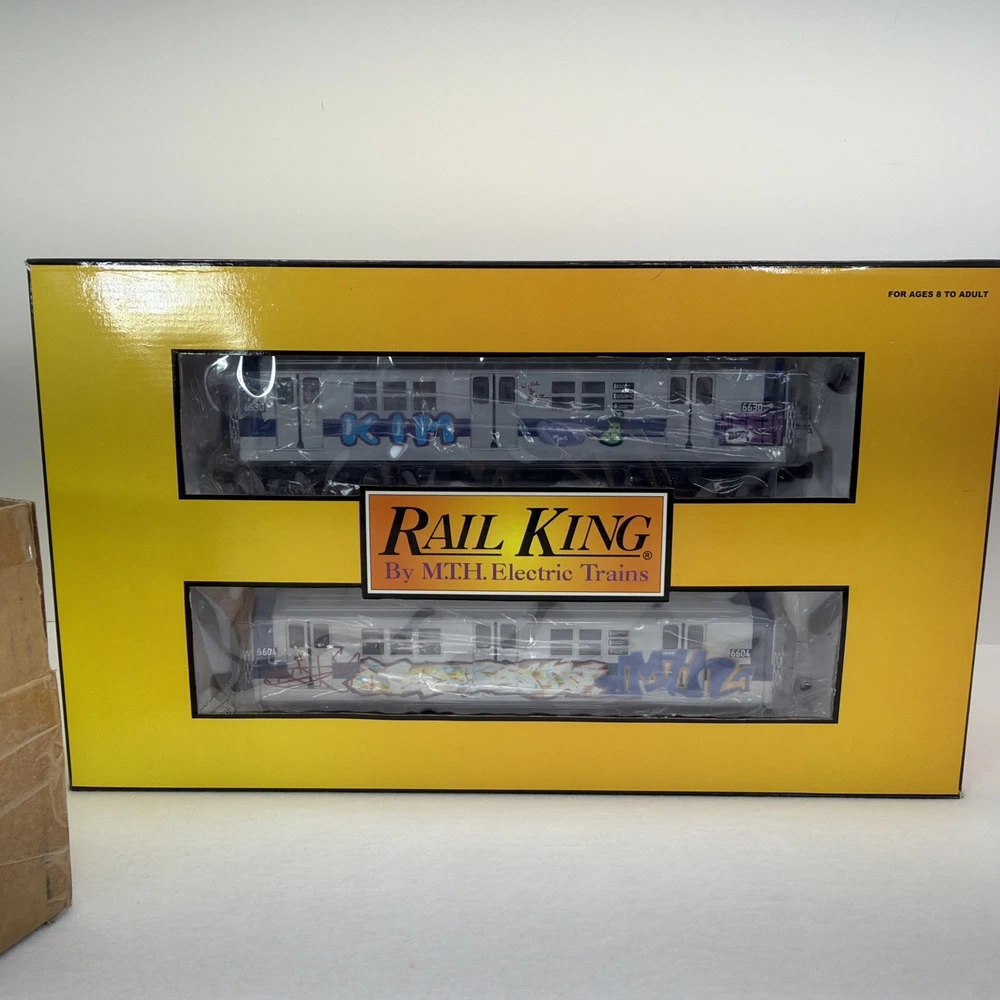 MTH RAILKING GRAFFITI R-17 6-CAR SUBWAY SET WITH PROTOSOUND 2 O GAUGE THREE RAIL POWER/DUMMY/DUMMY/DUMMY/DUMMY/DUMMY 4 CAR SET 30-2391-1 3 VOLT BOARD 2 CAR ADD-ON SET 30-2393-3 ORIGINAL BOX! USED!! BENCH TESTED WITH DCS AND ALL FUNCTIONS WORKING PROPERLY . DCS SHOWS 956 SCALE MILES. INSTRUCTION MANUAL.. NICE SOUND. 3 VOLT BATTERY TESTED OK. HARD TO FIND SET. WITH ADD-ON SET. MISSING ORIGINAL BOX FOR ADD-ON SET. ONE POWER UNIT. 5 DUMMY CARS. - Directionally Controlled Headlights - Intricately Detailed ABS Bodies - Metal Wheels and Axles - Remotely Controlled Proto-Couplerr - Authentic Paint Scheme - Operates On O-31 Track - All Metal Wheels and Gears - Illuminated Number Boards - (2) Precision Flywheel Equipped Motors In Powered Unit - Locomotive Speed Control - Metal Chassis - Die-Cast Truck Sides - Lighted Interior - Proto-Sound 2.0 With The Digital Command System Featuring:- Station Stop Proto-Effects - Unit Measures:82 1/2" x 2 1/2" x 3 1/2" Winning US bidder receives FREE SHIPPING USPS UPS! Canada Priority shipping is available . All other countries please email for a mailing quote. Thanks for looking I ship everyday!!!!