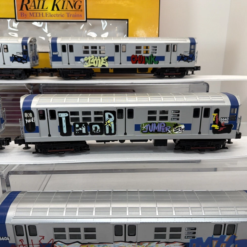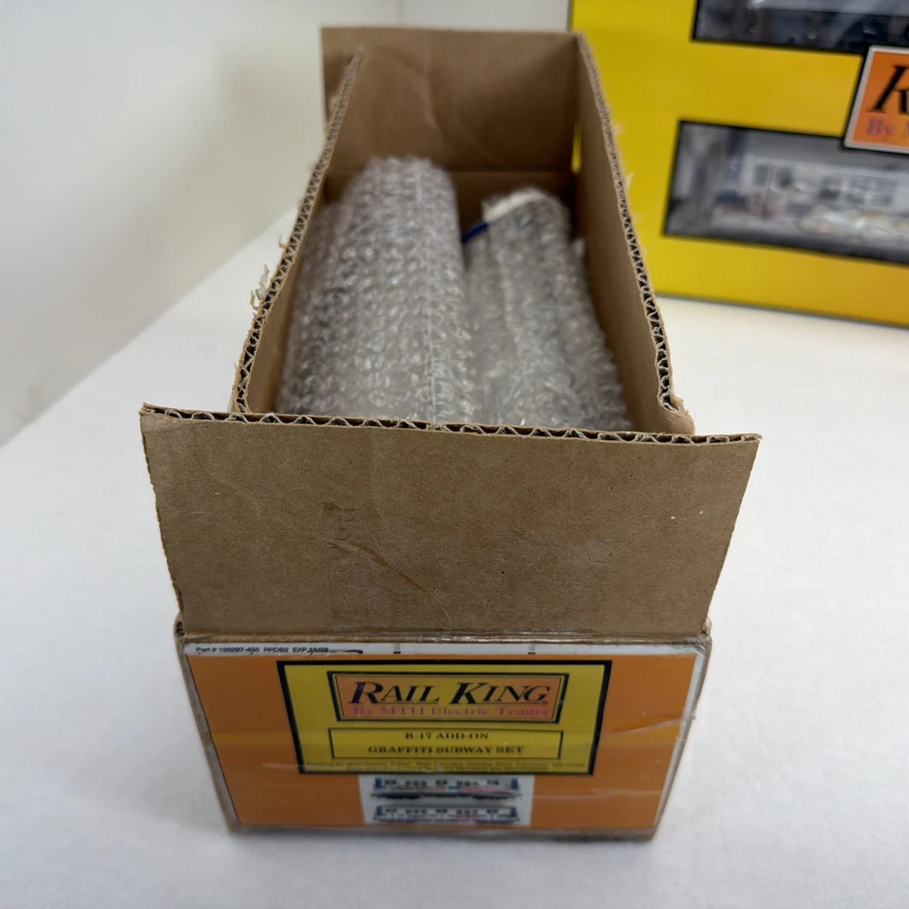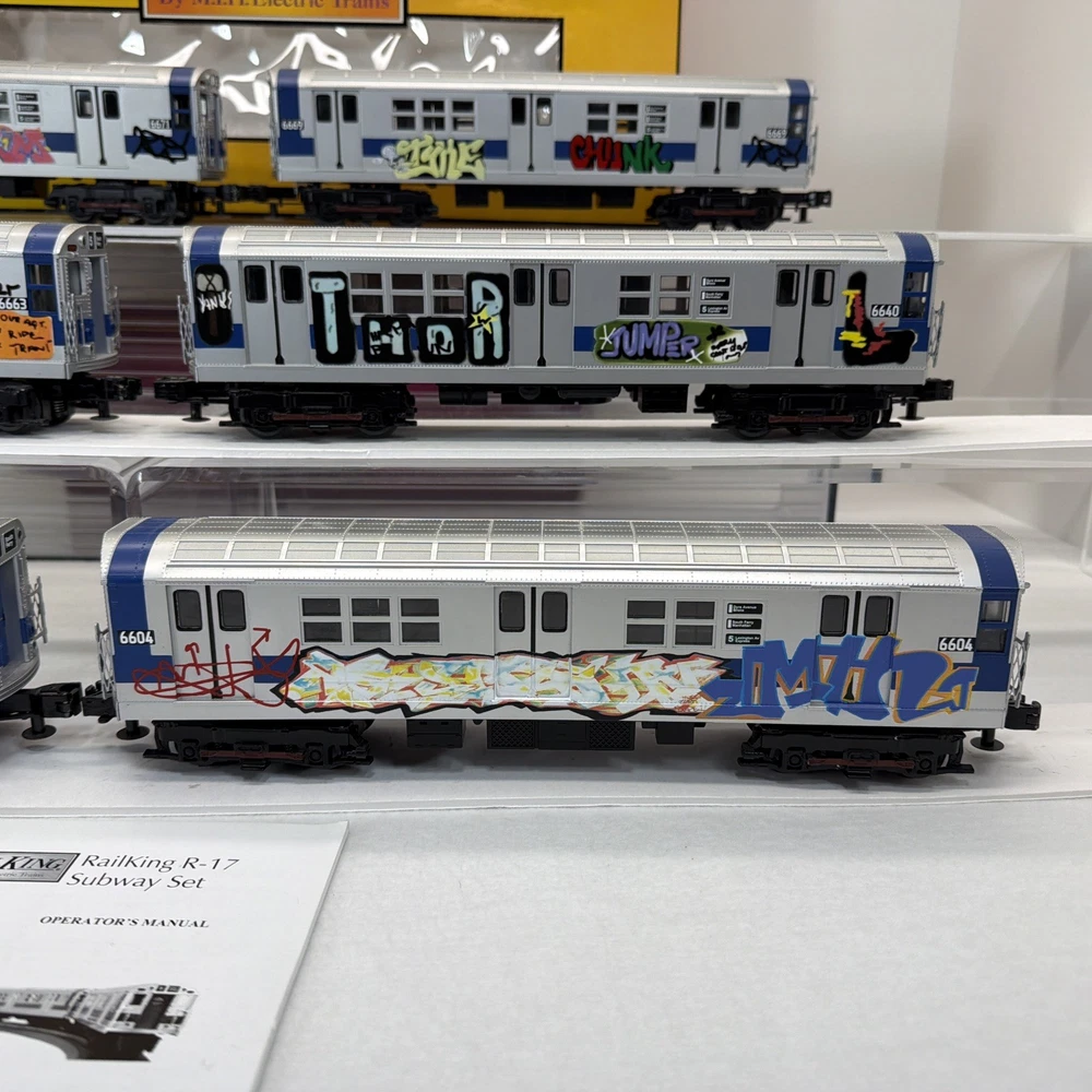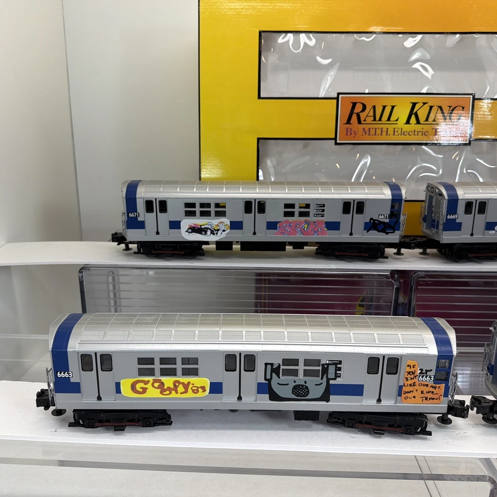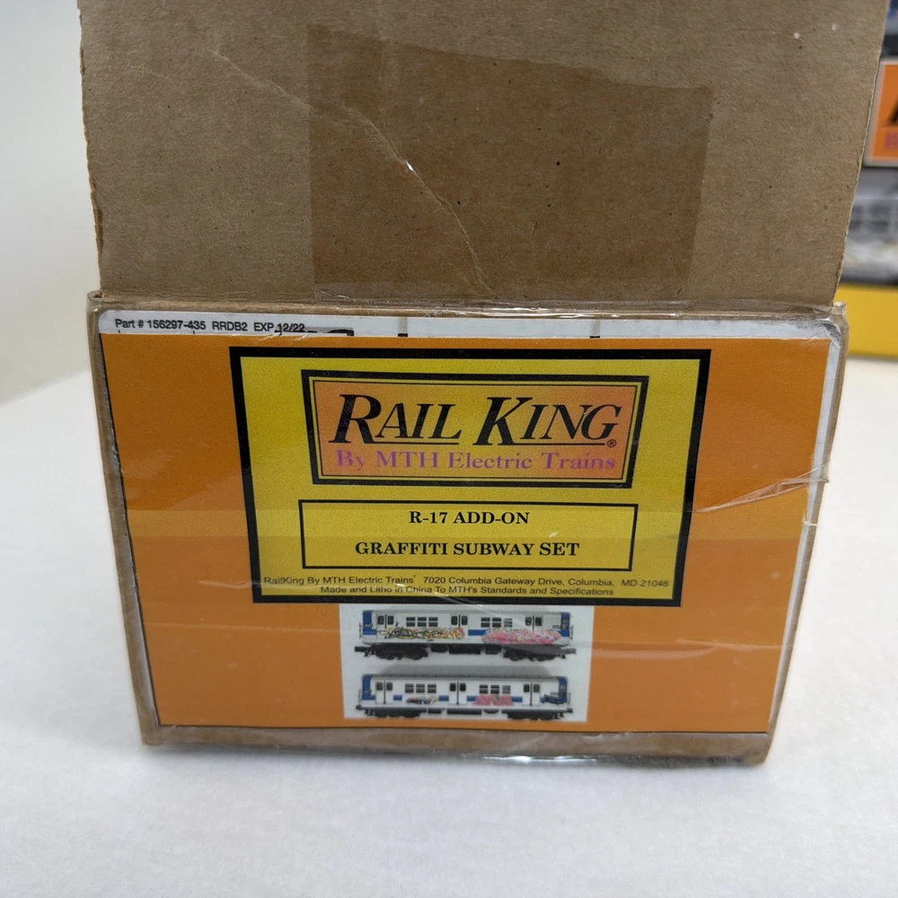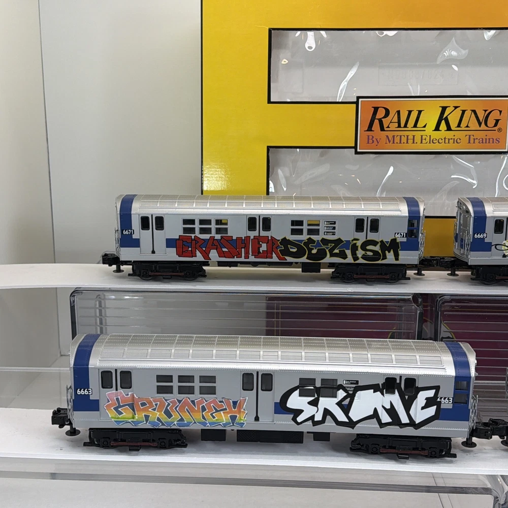 MTH RAILKING GRAFFITI R-17 6-CAR SUBWAY SET WITH PROTOSOUND 2 O GAUGE THREE RAIL POWER/DUMMY/DUMMY/DUMMY/DUMMY/DUMMY 4 CAR SET 30-2391-1 3 VOLT BOARD 2 CAR ADD-ON SET 30-2393-3 ORIGINAL BOX! USED!! BENCH TESTED WITH DCS AND ALL FUNCTIONS WORKING PROPERLY . DCS SHOWS 956 SCALE MILES. INSTRUCTION MANUAL.. NICE SOUND. 3 VOLT BATTERY TESTED OK. HARD TO FIND SET. WITH ADD-ON SET. MISSING ORIGINAL BOX FOR ADD-ON SET. ONE POWER UNIT. 5 DUMMY CARS. - Directionally Controlled Headlights - Intricately Detailed ABS Bodies - Metal Wheels and Axles - Remotely Controlled Proto-Couplerr - Authentic Paint Scheme - Operates On O-31 Track - All Metal Wheels and Gears - Illuminated Number Boards - (2) Precision Flywheel Equipped Motors In Powered Unit - Locomotive Speed Control - Metal Chassis - Die-Cast Truck Sides - Lighted Interior - Proto-Sound 2.0 With The Digital Command System Featuring:- Station Stop Proto-Effects - Unit Measures:82 1/2" x 2 1/2" x 3 1/2" Winning US bidder receives FREE SHIPPING USPS UPS! Canada Priority shipping is available . All other countries please email for a mailing quote. Thanks for looking I ship everyday!!!!