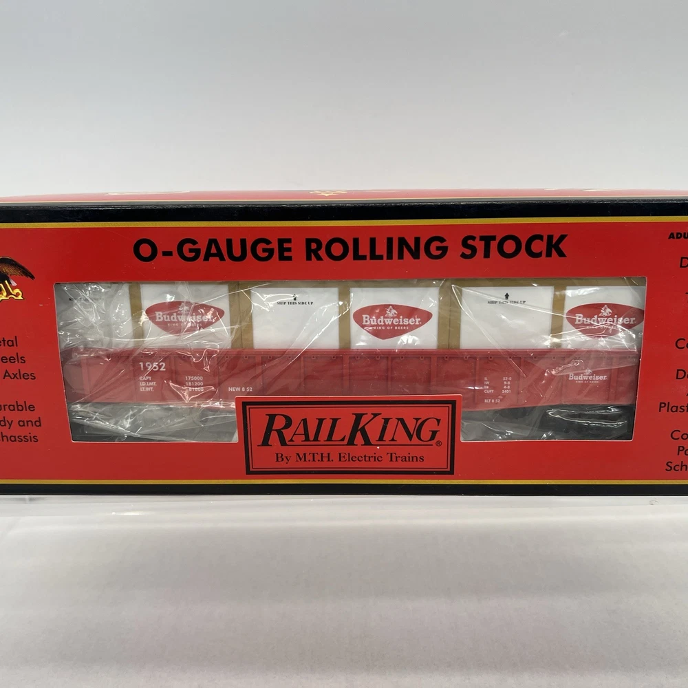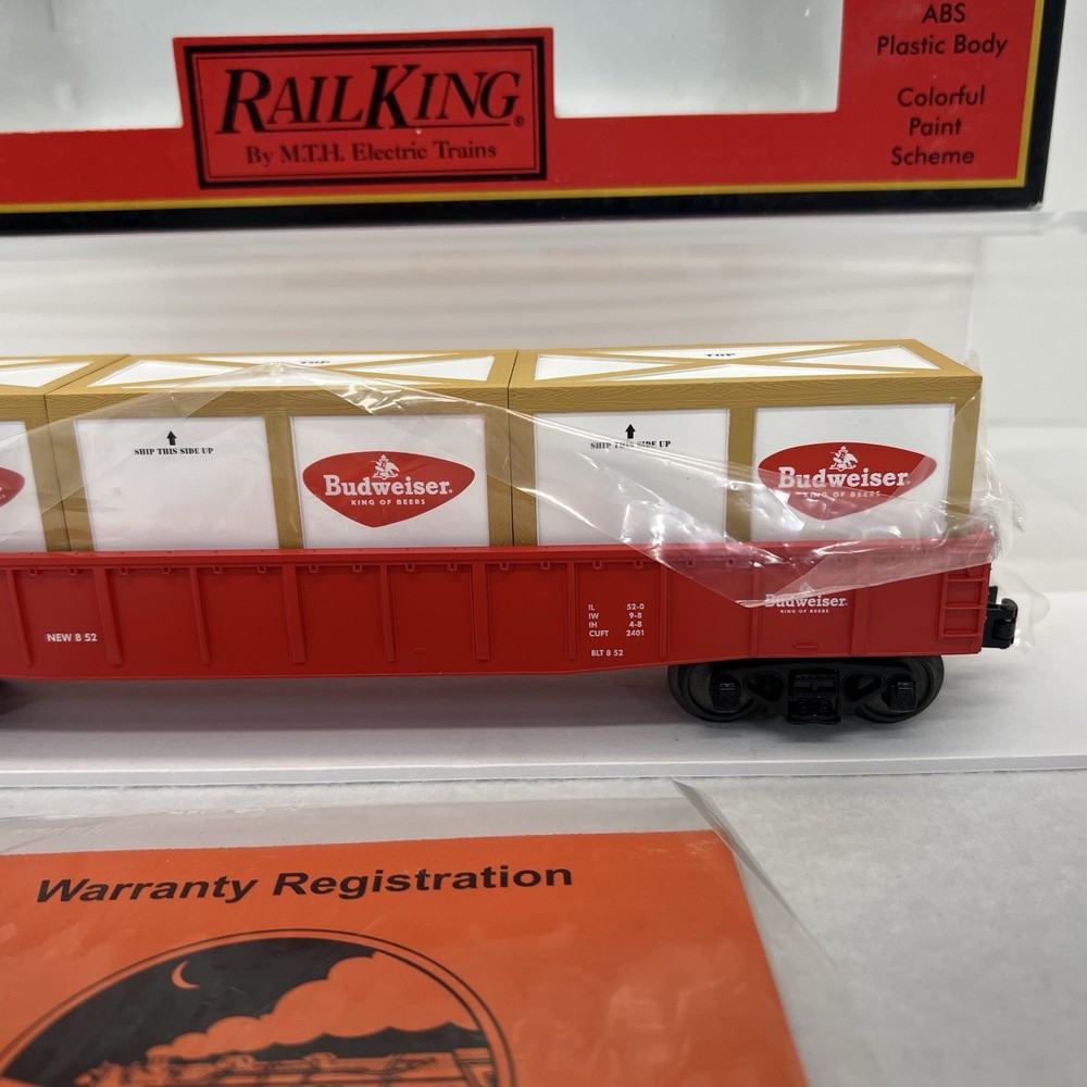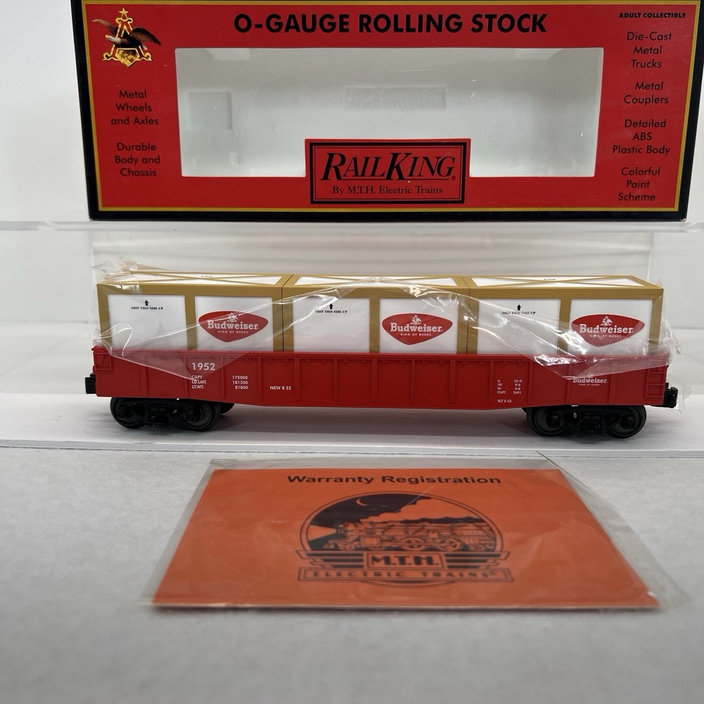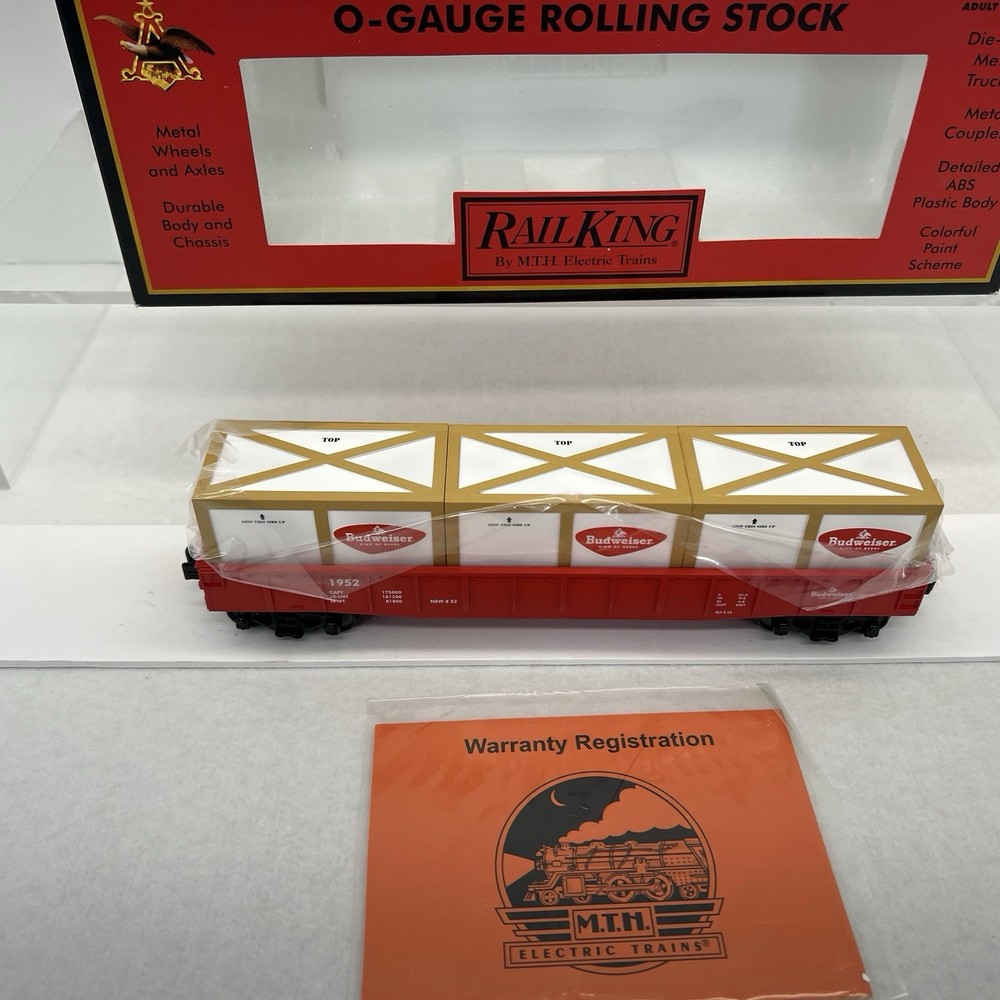 MTH RAILKING #1952 ANHEUSER BUSCH BUDWEISER GONDOLA CAR WITH CRATES O GAUGE 3 RAIL 30-72049 COMES IN ORIGINAL BOX. NEW. WILL BE PACKED TO ENSURE SAFE DELIVERY! Winning US bidder receives FREE SHIPPING USPS Priority UPS ! Canada Priority shipping is available . All other countries please email for a mailing quote. Thanks for looking! I ship everyday!!!!