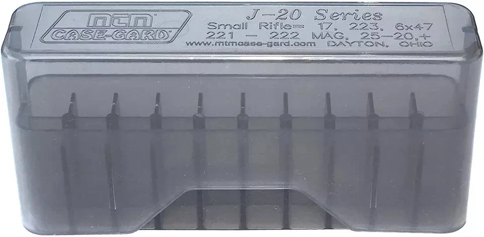 Made of virtually indestructible polypropylene. Will not warp, crack, chip, peel, expand or contract Refer Product Description section for cartridge sizes "Slip-Top" series is designed to keep 20 rounds secure in jacket or shirt pocket Keeps special loads separate Made in USA, with the rifle hunter in mind MTM Case-Gard J-20-XS ammunition cases are a favorite of rifle enthusiasts throughout the world. Made of virtually indestructible polypropylene that will not warp, crack, chip, peel, expand or contract. Cartridge Sizes : 17 / 221 / 223 Rem., 17 Fireball, 17 Mach 4, 204 Ruger, 218 Bee, 222 Rem. Mag., 300 Sherwood, 300 Whisper, 32 Ideal, 32 Win. S. L., 351 WSL, 6x47 6mm-223 Rem., 810 Cadet. All rounds are listed bullet up position. Lid is at 2.35" OAL.