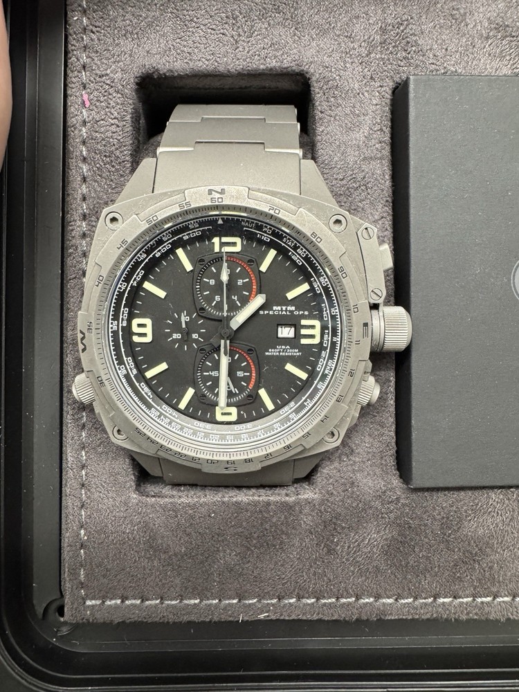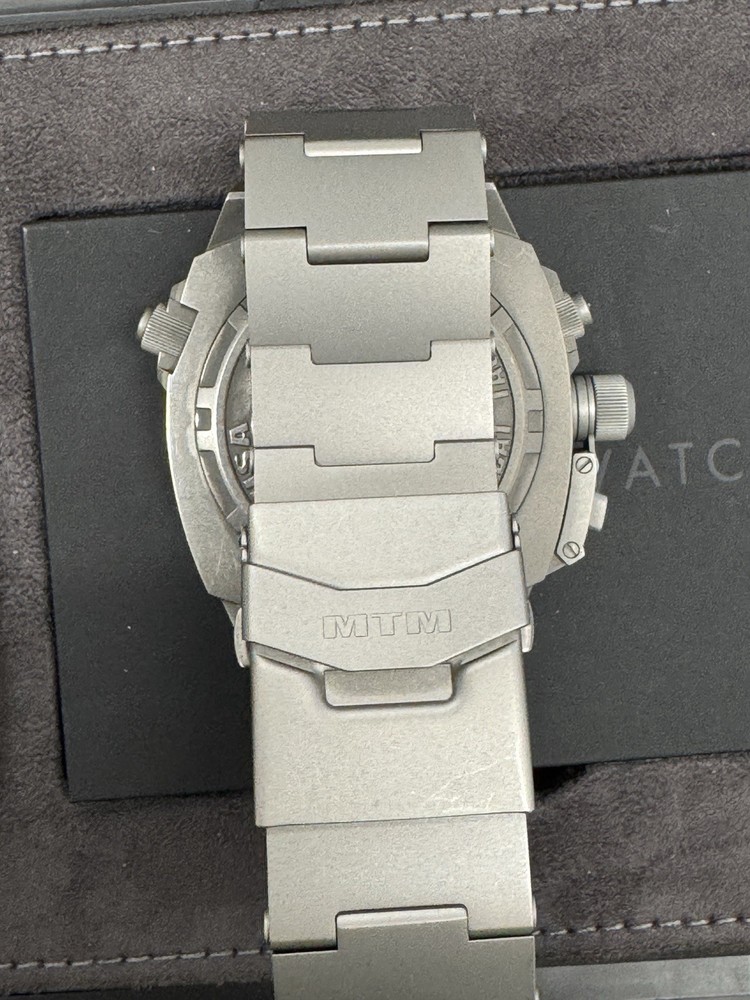 The MTM Special Ops Cobra 47 Titanium Chronograph is a high-quality wristwatch designed for men with a stylish and functional design. This limited edition timepiece features a gray bezel, black carbon fiber dial, and a durable titanium case with a grey sandblasted finish. The watch is water-resistant up to 200 meters and comes with a NATO strap for added versatility. With features like a screwdown crown, luminous hands, date indicator, and chronograph, this watch is ideal for pilots and aviation enthusiasts. The 47mm case size adds a bold touch to the overall design, making it a standout piece in any watch collection. Comes with OD MTM Nato strap, MTM titanium bracelet, MTM black rubber strap, and a Horus camo rubber strap. Worn maybe 6 times.