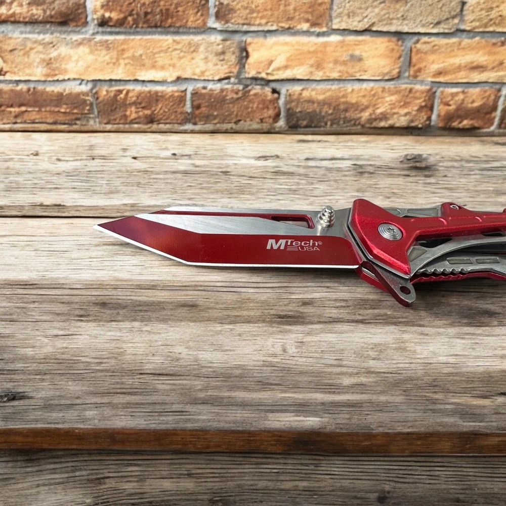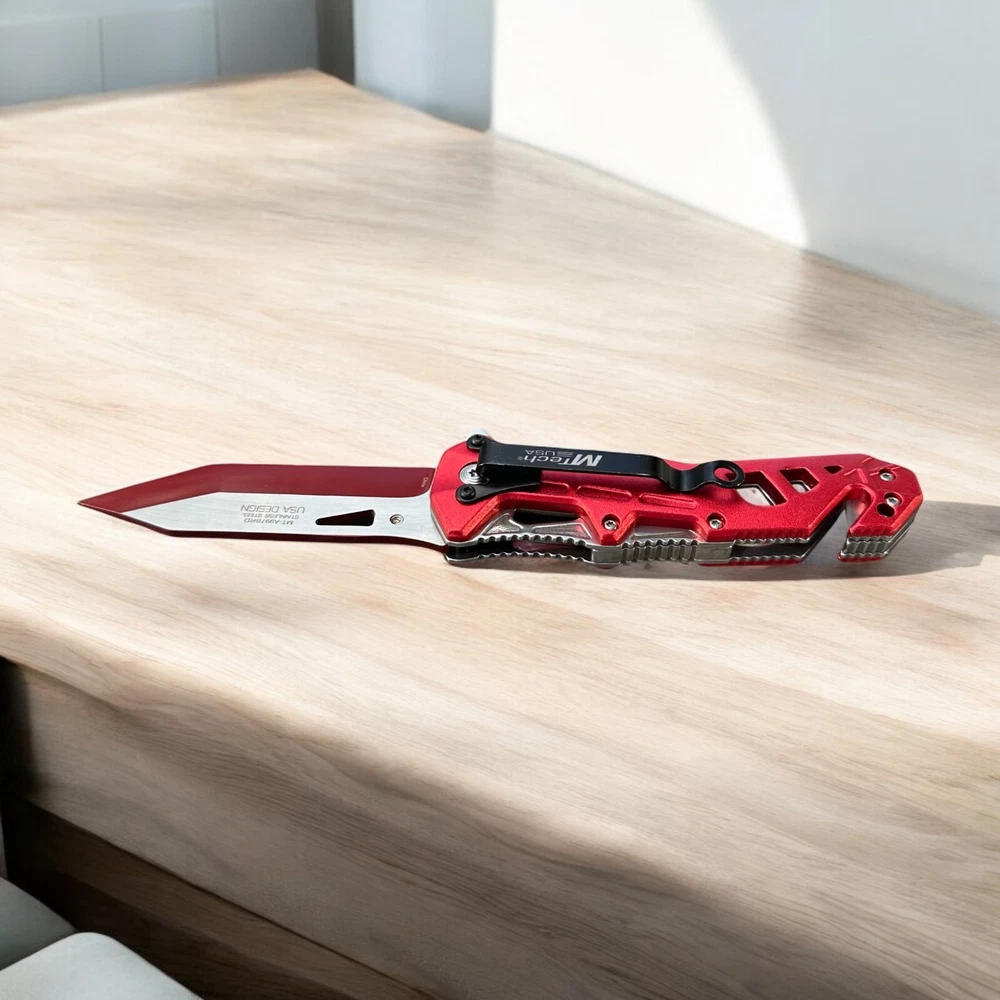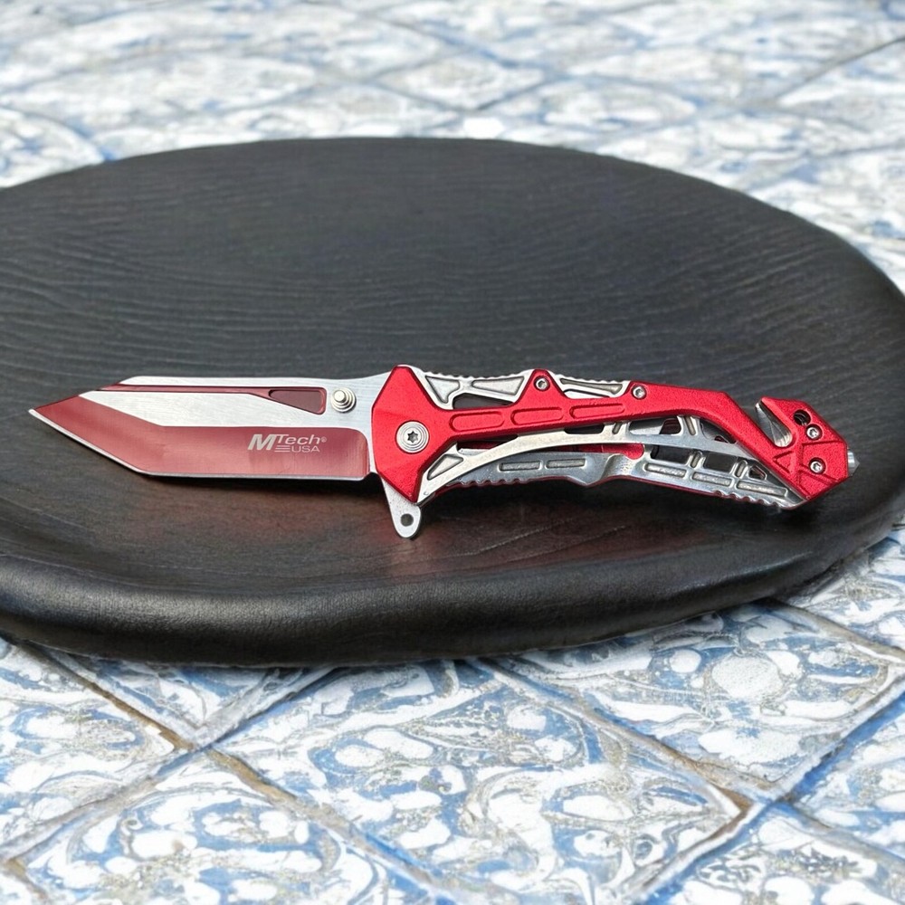 Turn heads while staying prepared with this striking MTech USA folding knife . Built for performance and designed with flair, this bold red and silver blade is the perfect mix of tactical function and standout style. πŸ”ͺ Blade Style: Two-tone tanto blade – designed for piercing and precise slicing with a rugged look 🧷 Deployment: Smooth one-handed open with thumb stud and flipper tab πŸ› οΈ Built-in Features: Glass breaker tip for emergencies Seatbelt cutter for rescue applications πŸ–οΈ Handle: Lightweight skeletal frame with red anodized aluminum overlays – strong, grippy, and futuristic πŸ“Ž Pocket Clip: Convenient deep-carry clip for easy transport Whether you're a first responder, outdoor adventurer, or knife collector, this MTech tactical folder is built to perform and built to impress. πŸ“¦ Ships brand new and securely packaged 🎁 A great gift for EDC enthusiasts, tactical gear fans, or anyone who appreciates a bold knife design Note: Buyer must be 18 years or older. Always follow local knife laws when purchasing.