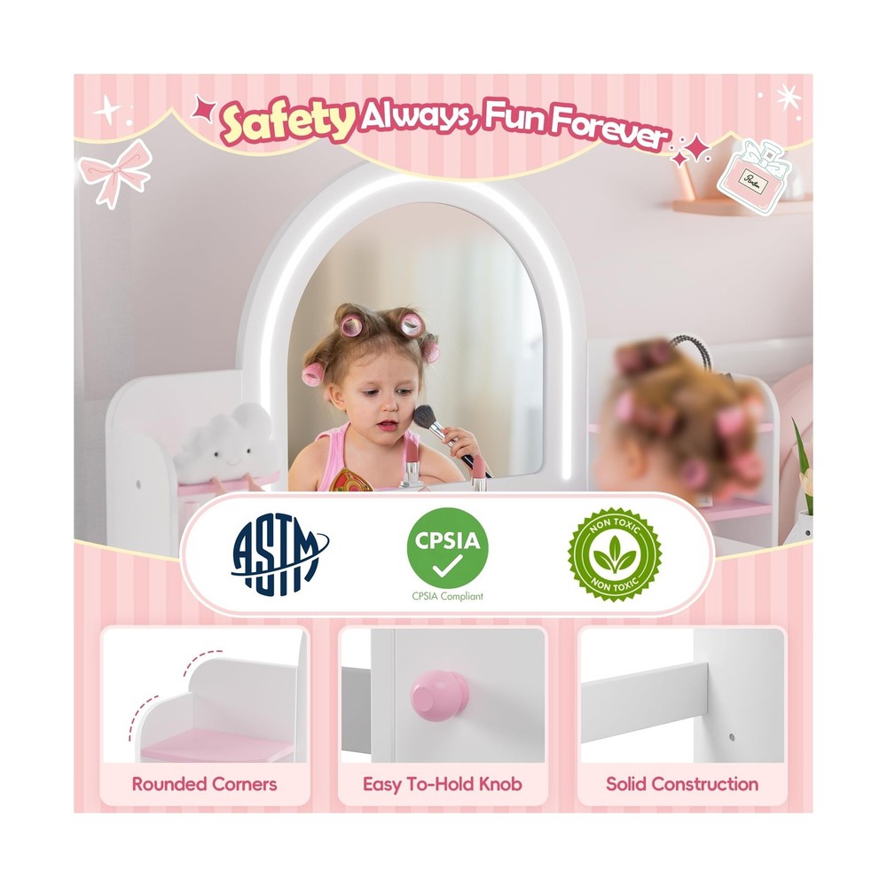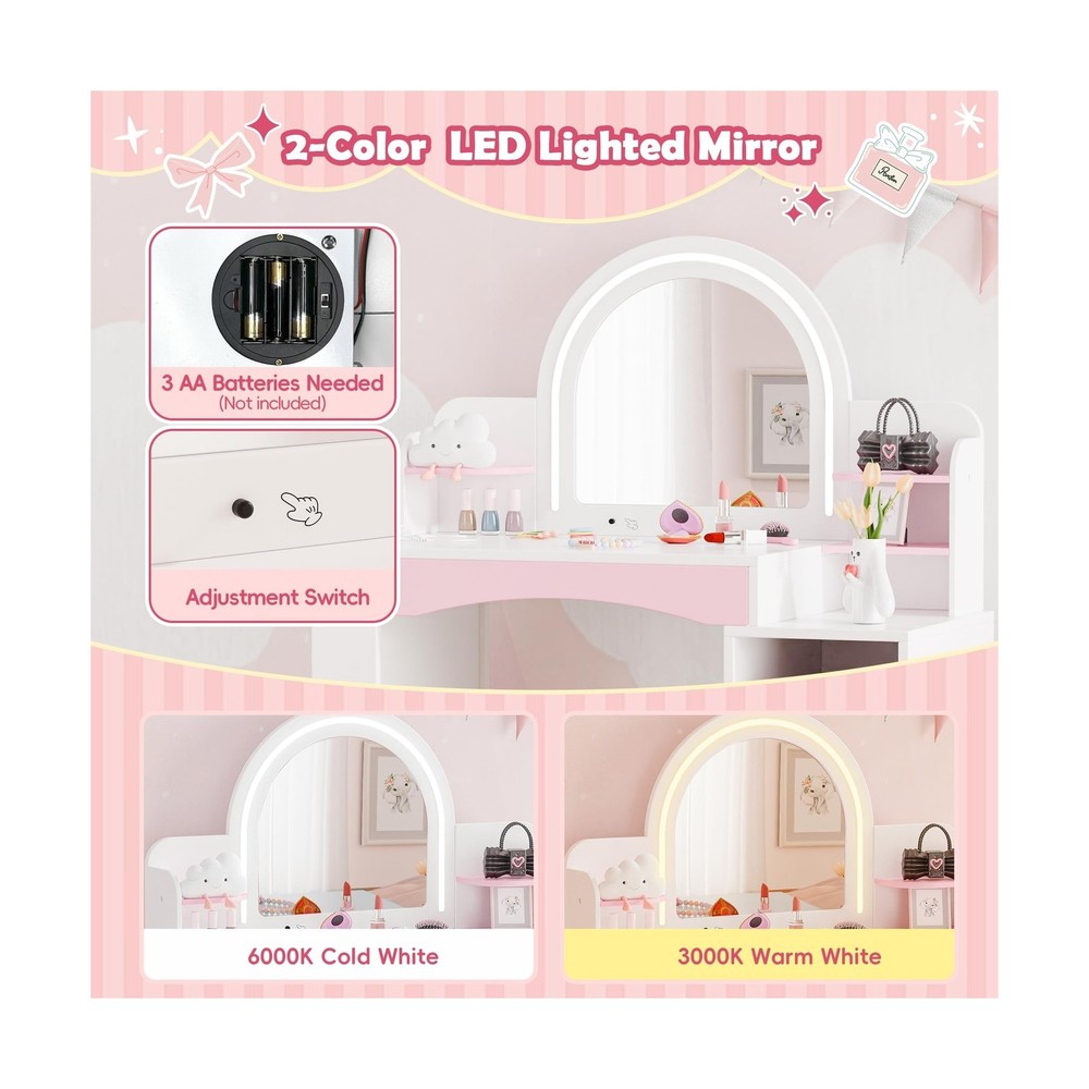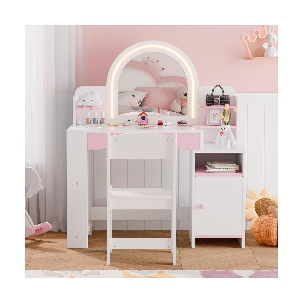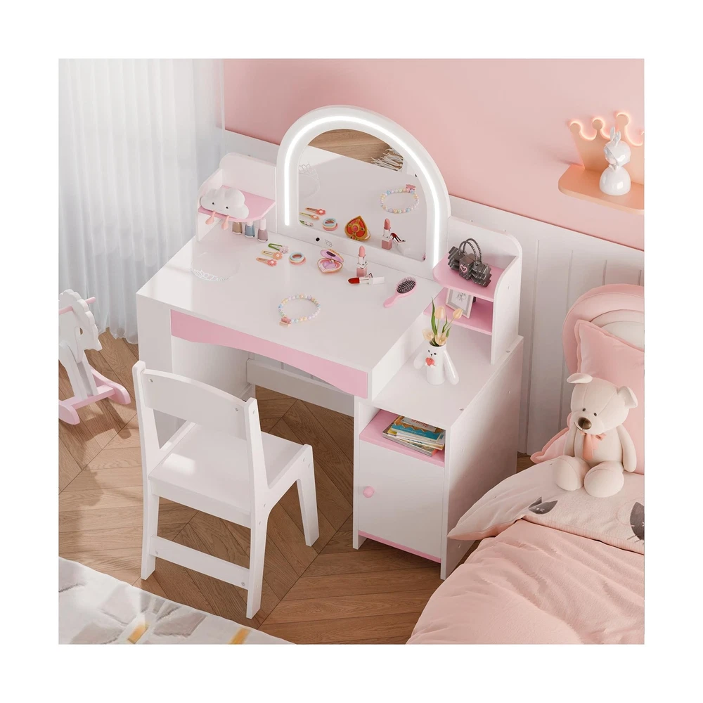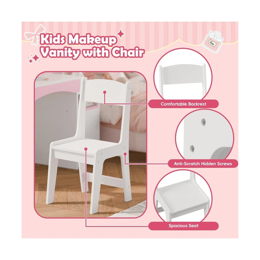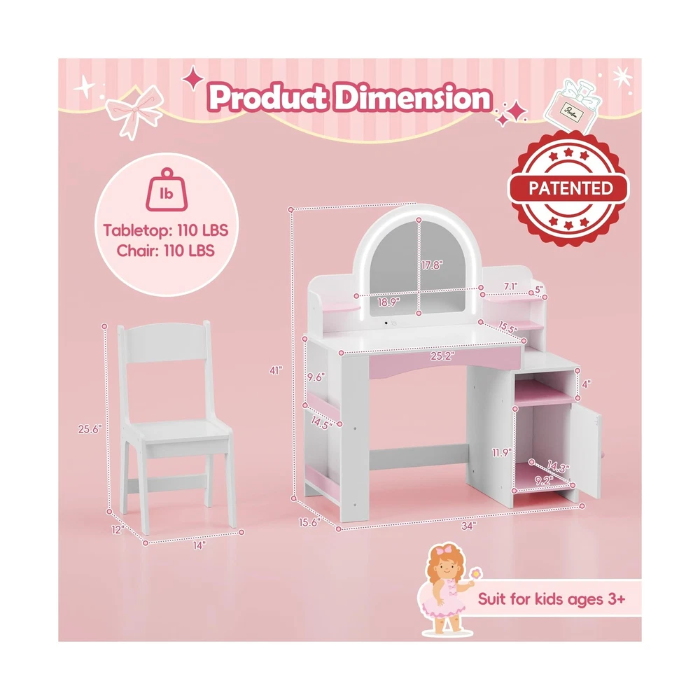 MU Kids Vanity with Lights, Princess Makeup Vanity Desk with Open Bookshelf, Storage Cabinet & Shelves, 2 in 1 Toddler Vanity Table & Chair Set with Lighted Mirror for Little Girls (White) Description Features: 2-Color LED Lighted Mirror: Discover the joy of dressing up with our childrens makeup vanity set, featuring a lighted mirror that offers two lighting options: 6000K cool white and 3000K warm white. This feature simulates a professional makeup environment, enhancing self-expression and playtime fun. Note: Requires 3 AA batteries (not included). Perfect Storage Solution: Our girls vanity set includes a unique bookshelf for books, encouraging a love for reading. With a three-tier shelf, ample tabletop space, a convenient drawer, and a closed cabinet, it provides ample room to organize cosmetics, toys, and books, fostering a tidy and organized play area. Safety-Focused & Durable Design: Our vanity is crafted from premium MDF. It is designed with safety and longevity in mind. The rounded corners and smooth, burr-free surface minimize the risk of accidents during play. Rigorously tested to meet ASTM F963-17 and CPSIA safety standards for your peace of mind. Ideal Gift for Little Girls: Every little girl dreams of being a glamorous princess. Our vanity table with a mirror allows your child to indulge in daily dress-up sessions. Its stylish and functional design will be a beloved addition to her room, making it a perfect gift for birthdays, Christmas, or any special occasion. Easy Assembly & Cleanup: Our kids vanity table comes with clear graphic instructions and all necessary accessories for a hassle-free assembly. Its a great opportunity for a fun parent-child activity. Cleaning is simple, ensuring the vanity stays looking its best. Product Details: Color: White Size: 16x35 Product Dimensions: 16"D x 34"W x 41"H Furniture Finish: Pink Brand: MU Frame Material: Engineered Wood Assembly Required: Yes Item Depth: 16 inches Seat Material Type: Plastic Manufacturer: MU Product Dimensions: 16 x 34 x 41 inches Item Weight: 45 pounds Item model number: MU-35 Date First Available: August 21, 2024 Delivery We Do Not Ship Outside of the Continental US. Return Policy All items qualify for returns within 30 days of receipt. Feedback We take our reputation seriously, we buy and sell online, so we understand the value of trust. If you are unsatisfied with your order, please contact us and we will work with you to resolve it to your satisfaction.