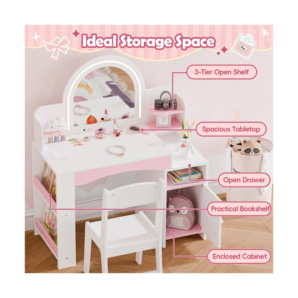 MU Kids Vanity with Lights, Princess Makeup Vanity Desk with Open Bookshelf, ...