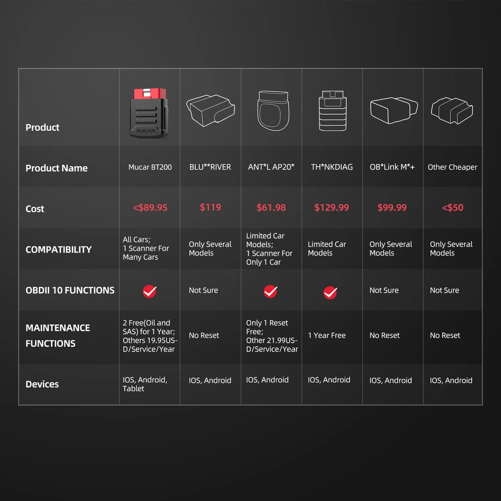 MUCAR BT200 Full System Diagnostic Tool OBD2 Scanner Bluetooth Wireless Car USA Why You Need MUCAR BT200? MUCAR BT200 is a portable and economical car fault diagnosis tool suitable for DIY individual users and small repair shops. MUCAR BT200 is composed of a diagnostic connector and an APP, connected to the vehicle diagnostic socket through the connector, and wirelessly communicates with a smart phone or tablet through Bluetooth, so as to install client software and diagnostic software on the smart terminal to perform car fault diagnosis, including reading the version Information, code reading, code clearing, reading data stream, special functions, etc. Supported models:compatible with all models supporting OBD II protocol after 1996 Supported Protocols:ISO 14230-4(KWP2000)/IOS 15765-4(CAN)/ISO 9141-2(IOS)/ISO14229(UDS)/SAEJ 1850(VPW&PWM) All Cars Lifetime Free Full System Diagnostic Tool With superior all systems diagnoses, this multipurpose obd2 scanner can be used to read all available systems’ECU information to facilitate the vehicle diagnosis.The complete systems vary from different cars and they usually include engine, transmission, ABS, SRS, SAS, TPMS, EPB and chassis / body / electrical equipment system etc. Examinate your car like a professional mechanical technician Read DTCs from the vehicle's all electronic control systems to locate problem areas, and offer solutions; Erase the codes easily after DTCs retrieving and certain repairs have been carried out and turn off fault Indicator lamp; Live data shows each sendor parameter item displayed in analog, text, waveform graph modes etc.; The active test used to access vehicle-specific subsystem and component tests. 15 Maintenance RESET Functions(Oil/SAS Free 1 Year) This OBD2 scanner is specially designed to provide you with quick access to the vehicle systems for various scheduled service and maintenance performances. There is some commonly-used special reset services are listed for your reference: 1.Oil Lamp Reset Service : allows you to perform reset for a new calculation of Engine Oil Life system once changed the oil. 2.EPB service: it is important in the maintenance of electronic braking system's safety and efficiency. 3.BAT battery service : allows the scan tool to evaluate the battery charge state, monitor the close-circuit current, register the battery replacement, and activate the rest state of the vehicle. 4.DPF service : specially works for Diesel Particulate Filter system with DPF regeneration, DPF component replacement teach-in and DPF teach-in after replacing the engine control unit. 5.SAS service: helps clear the fault steering angle sensor memories and plays an important role in the steering angle sensor calibration. 6.TPMS service : makes sense in displaying sensor IDs from the vehicle's ECU, inputting TPMS sensor replacement IDs and testing sensors. 7.IMMO Reset: 1 In order to prevent the car from being used by illegal keys, through the anti-theft key matching function, the car can only be used normally after the anti-theft device control system on the car recognizes and authorizes the remote control. 2 Anti-theft matching is required when replacing the ignition switch key, ignition switch, combination meter, engine control unit (ECU), body control module (BCM) and remote control battery 8.ABS Bleeding : ABS brake bleeding to get a firm brake pad after air exhaustion after repair ABS pump system 9.Sunroof Reset: The sunroof memory generally needs to be reset when the vehicle’s battery is replaced or the car dies 10.Suspension Reset: Try reset electronic suspension air ride with the massage system close all doors koeo flip through measage system go to suspension reset or on off 11.Gearbox Reset: Procedure Reset Transmission Adaptive Learning DIY. Start the car and drive. Once you perform this procedure the Engine Control Unit (ECU) and Transmission Control Unit (TCU) will work together to learn how you drive by monitoring your driving pattern. After you follow this programing method of the TCU / ECU drive the car. 12.AFS Headlamp Reset : 'AFS' means Adaptive Front lighting System (at night with the Bi-Xenon headlights) it swivels either side, pressing that button means they stay pointing straight ahead and don't turn when you turn the steering wheel 13.Injector Coding : Leaking injectors and some dead injectors can be missed even when an injector is disabled. Otherproblems with the ignition system and mechanical components also may not show an rpm loss when aninjector is turned off 14.Throttle Adaptation : The throttle body is a tube containing a pivoting flat valve (butterfly) that is used to control the amount ofair entering an engine. In an electronically fuel injected car, a throttle position sensor and air flow sensorcommunicate with the computer, which supplies the corresponding amount of fuel needed at the injectors. It must need re-learning throttle sensor position after clearing or repair 15.Gear Learning: The scan tool monitors certain camshaft position sensors signals to determine if all conditions are met to continue with the procedure for Engine running All Cars Lifetime Free 10 Mode OBDII/EOBD Functions: Mode 1--Read live data stream Mode 2--Read freeze frame data Mode 3--Read DTCs(diagnostic trouble codes) Mode 4--Clear dtcs Mode 5--Oxygen sensor monitoring Mode 6--System monitoring Mode 7--Read pending DTCs Mode 8--Control operation of on-board system Mode 9--Read vehicle information Mode 10--Request emissions-related diagnostic trouble codes with permanent status after a clear/reset emission-related diagnostic information. Support Cover Up to Over 115 Major Vehicle Manufacturers From America, Europe and Asia MUCAR BT200 can be detect almost all vehicles in America, Europe, and Asia Pacific regions with OBD port. Examples are as follows: Support 126+ Car Brands and 1000+ Vehicles USA : For BXGM,For CHRYSLER, For AUSTFORD, For GM,USAFORD EUROPE : For ASTONMARTIN,For AUDI,For BENZ,For BMW,For BXF