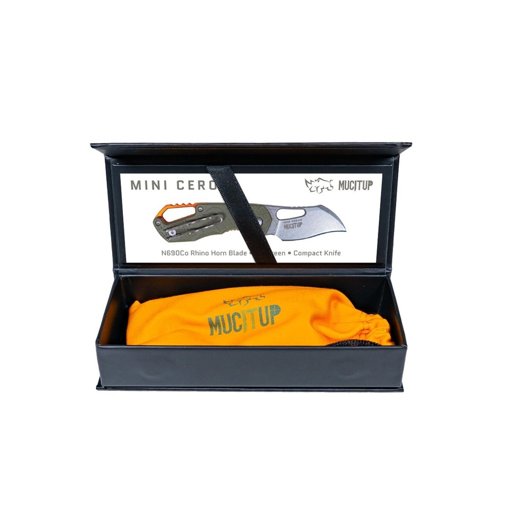 MUCITUP Mini Ceros Gen 2 Folding Knife – N690Co, Rhino Horn Blade, Orange You ever looked at a blade and thought, “Dang, that thing looks like it could gore a grizzly and still slice tomatoes”? Yeah, welcome to the Mini Ceros Gen 2 —featuring our signature Rhino Horn blade shape forged in N690Co steel , the kind of steel that laughs at abuse and keeps its edge like it’s guarding the last slice of brisket. This isn’t some plastic-handle, gas-station embarrassment. No sir. Gen 2 is geared up with anodized aluminum accents in a bold orange that looks like it’s been dunked in fire and dared to cool off. Smooth-as-butter ball bearing action means the flip is so easy, you’ll find yourself opening it just to feel better about your life choices. And yes, it proudly wears the Mini Ceros name on both sides of the blade , because a knife this good deserves to sign its work. What you’re getting: Blade Steel: N690Co – wicked sharp, corrosion-resistant, built for real-world chaos Blade Shape: Rhino Horn – part drop point, part beast, all business Opening: Ball Bearing Flipper – smooth enough to make your other knives jealous Handle: Orange Anodized Aluminum Accents – strong, stylish, unapologetic Lock: Liner Lock Jimping: Yep, right where your thumb wants it Clip: Of course Engraving: "mini ceros" on both sides – because subtlety is overrated Whether you're dressing game, opening mail from your ex, or just want to look like the kind of guy who doesn’t take crap from squirrels—this blade delivers. It’s compact. It’s tough. It’s “ruggedly dashing.” It’s a Mini Ceros Gen 2 —and if you don’t carry it, Muc’s not mad… just disappointed. SHIPS FROM TEXAS - SAME OR NEXT BUSINESS DAY! Remember, stay sharp, stay ready, shoot straight!