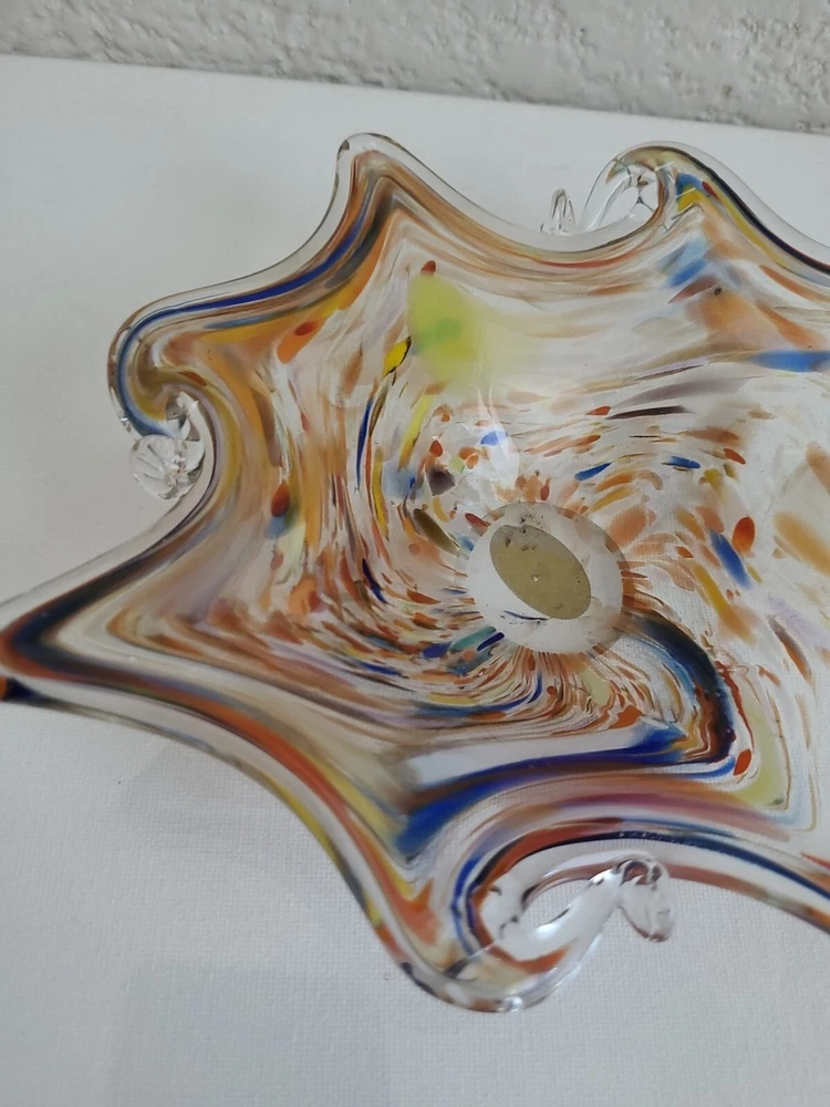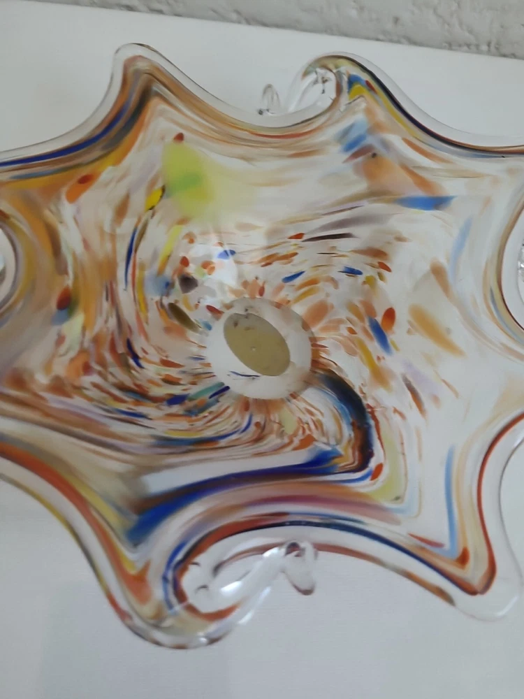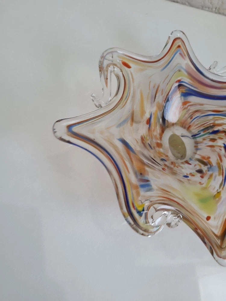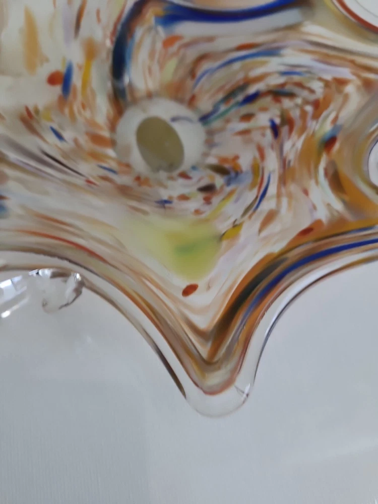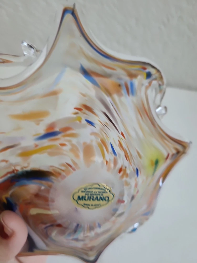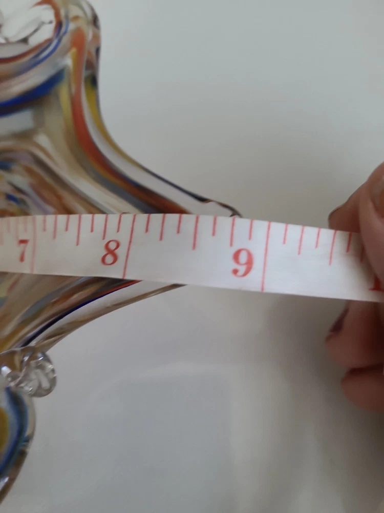 This Murano hand blown glass vase is a stunning piece of art glass. Made in Italy, the vase showcases intricate multicolor designs that are a hallmark of Murano glassmaking. It has been signed by the artist and is a vintage piece, adding to its uniqueness. The vase measures 9 inches and would make a great addition to any collection of decorative pottery and glassware.