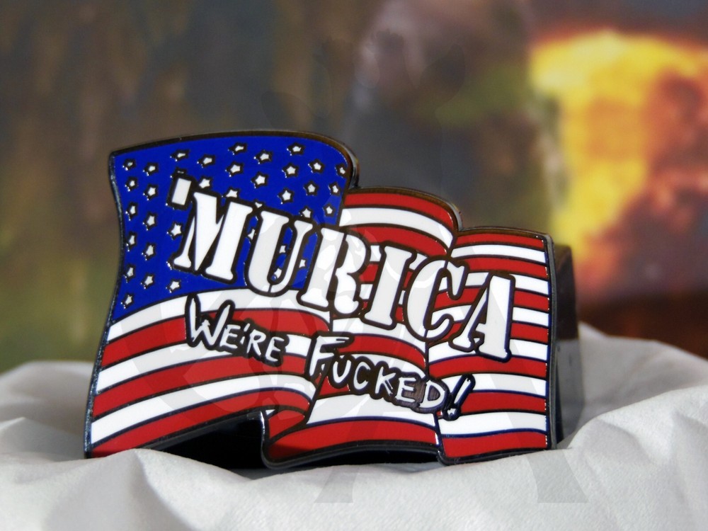 'MURICA: We're F*cked! THIS PIN WAS MADE AS A NOVELTY AND THE IDEA DID NOT COME FROM ANYTHING POLITICAL. These pins are hard enamel and measure about 2 inches tall. The back of the pin has two rubber clutches to keep the pin secure. Grade Descriptions: A: Perfect/Near perfect condition (no flaws/cosmetic issues) B: Minor cosmetic imperfections (very slight missing color fill/slight bumps in the color fill) C: Cosmetic imperfections/possibly loose posts on the back