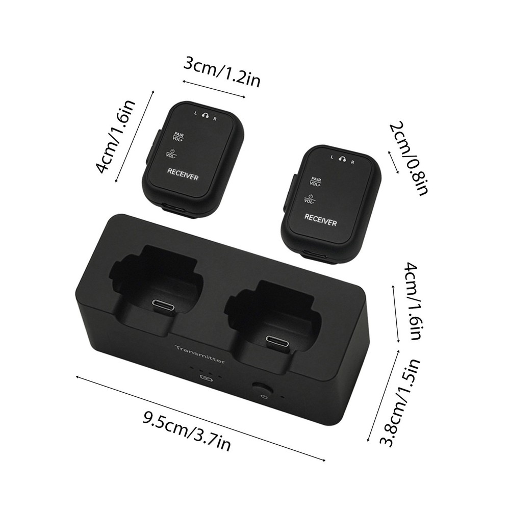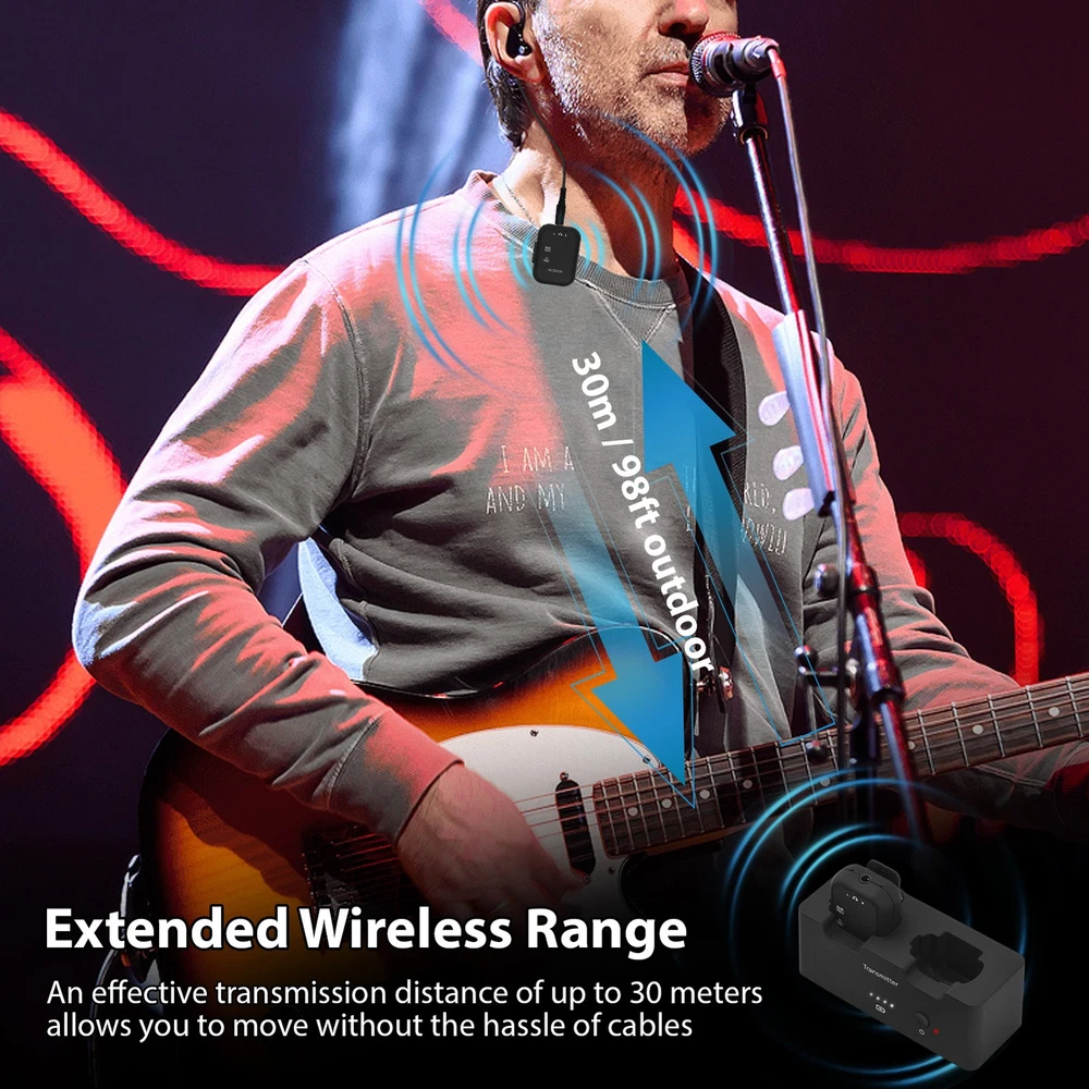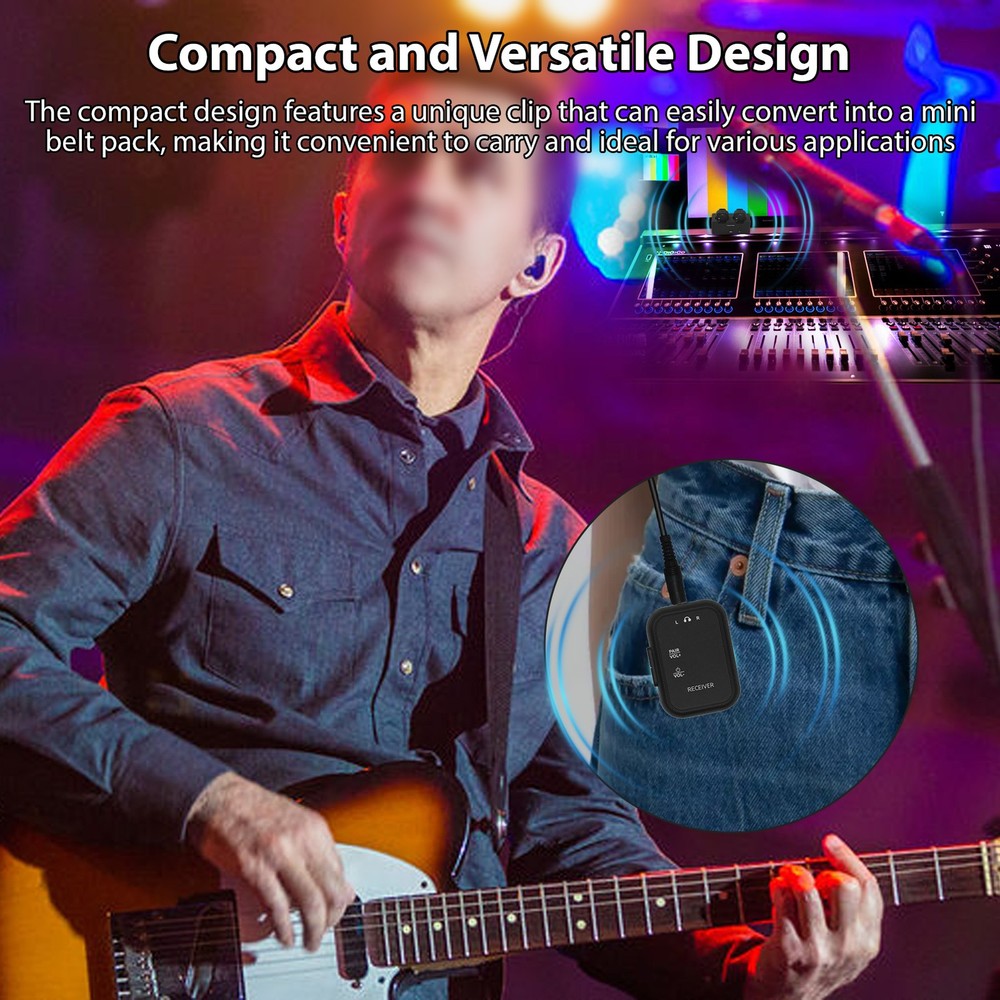 Feature: 1. High-Quality Audio Transmission: Experience lossless professional sound quality with our wireless in ear monitor system, utilizing a 2.4GHz frequency band to support 24bit/48KHz sampling rate for crystal-clear audio delivery. 2. Extended Wireless Range: Enjoy a remarkable effective transmission distance of up to 30 meters with our wireless audio transmitter and receiver, allowing you to move without the hassle of cables. 3. Compact and Versatile Design: The compact design features a unique clip that can easily convert into a mini belt pack, making it convenient to carry and ideal for various applications, whether on performance stage or in studio settings. 4. Multiple Device Connectivity: Our rechargeable transmitter receiver supports simultaneous connections with multiple receivers, enabling seamless integration across up to 4 devices, ensuring collaborative use in diverse environments. 5. User-Friendly: The wireless IEM system is equipped with LED indicators for real-time monitoring of stereo status, battery life, volume levels, and mute status, along with adjustable volume control on the receiver for precise sound management. Specification: Sampling Rate: 24bit/48KHz Wireless Frequency Band: 2.4GHz Effective Distance: 30m/98ft outdoor transmission distance Frequency Response: 20-20KHz+ 1dB/-3dB Battery Type: Built in rechargeable lithium battery Transmitter Battery Capacity: 1800mAh Receiver Battery Capacity: 200mAh Battery Voltage: 3.7V Product Material: Plastic ABS Product Color: Black Transmitter Size: 9.5 * 3.8 * 4cm/3.7 * 1.5 * 1.6inch Transmitter Weight: 75g/2.6oz Receiver Size: 3 * 2 * 4cm/1.2 * 0.8 * 1.6inch Receiver Weight: 15g/0.6oz Package List: 1 * Transmitter 2 * Receiver 1 * USB Charging Cable 1 * Instructions Manual