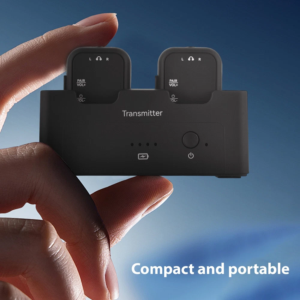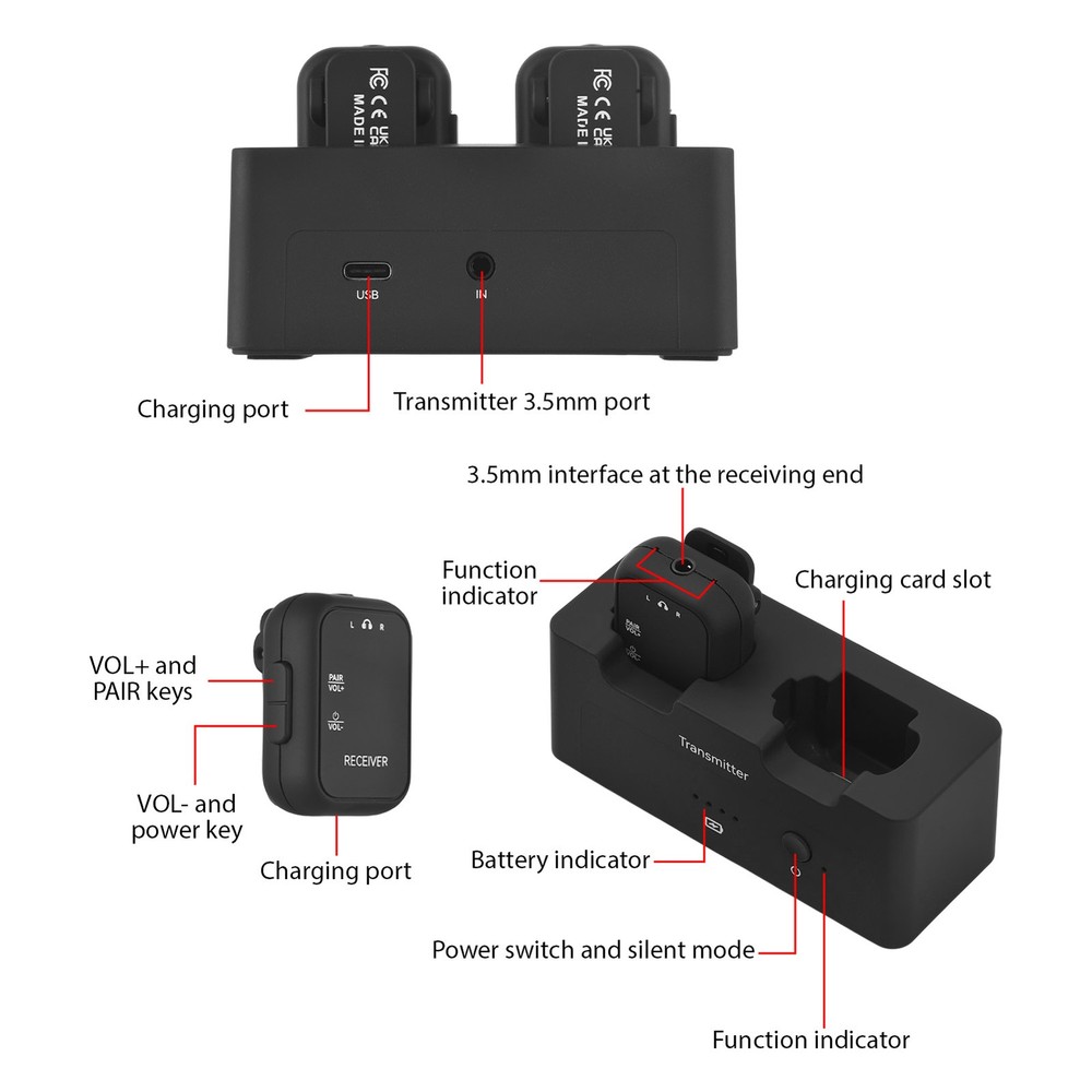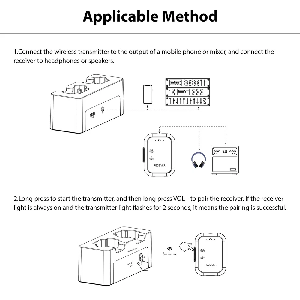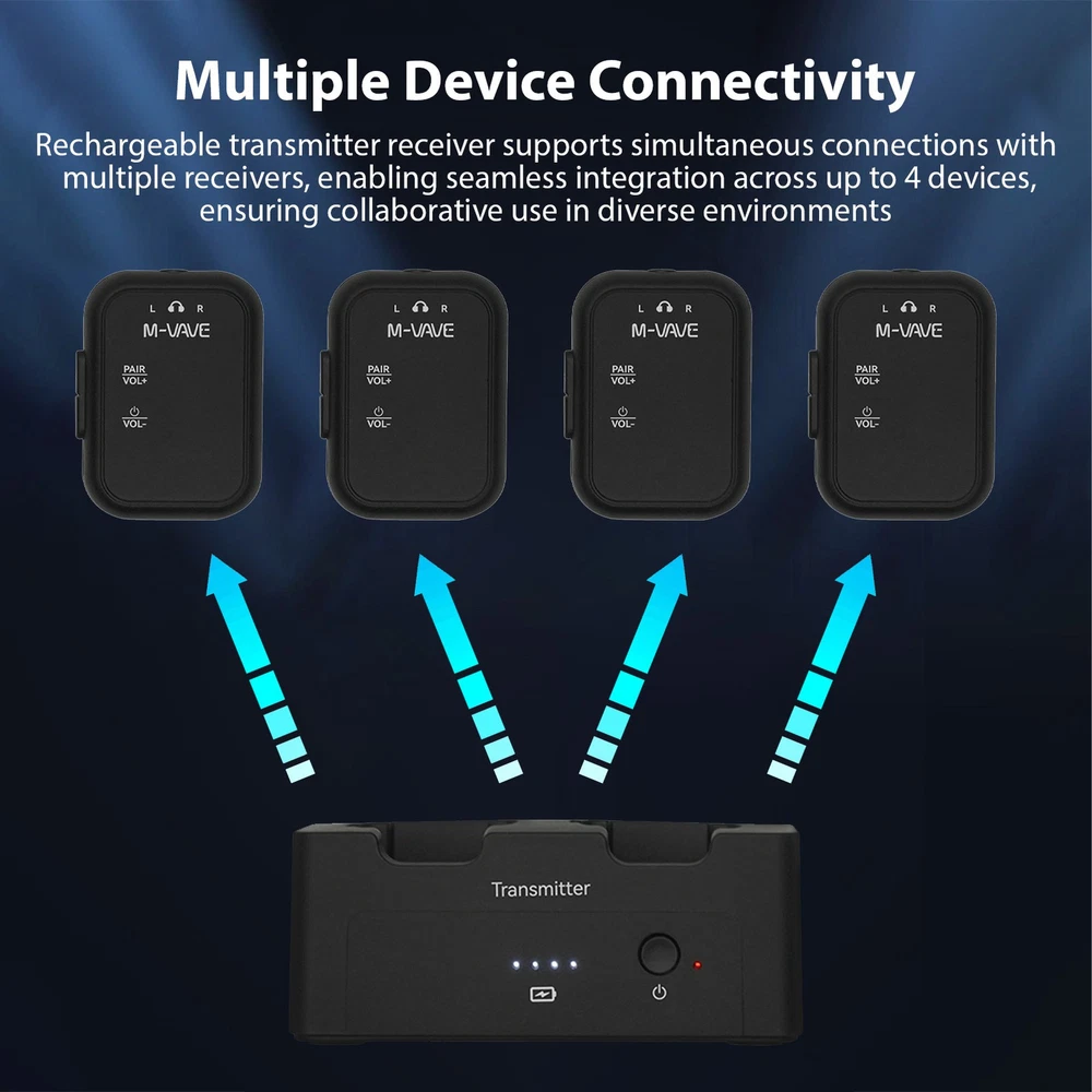 Feature: 1. High-Quality Audio Transmission: Experience lossless professional sound quality with our wireless in ear monitor system, utilizing a 2.4GHz frequency band to support 24bit/48KHz sampling rate for crystal-clear audio delivery. 2. Extended Wireless Range: Enjoy a remarkable effective transmission distance of up to 30 meters with our wireless audio transmitter and receiver, allowing you to move without the hassle of cables. 3. Compact and Versatile Design: The compact design features a unique clip that can easily convert into a mini belt pack, making it convenient to carry and ideal for various applications, whether on performance stage or in studio settings. 4. Multiple Device Connectivity: Our rechargeable transmitter receiver supports simultaneous connections with multiple receivers, enabling seamless integration across up to 4 devices, ensuring collaborative use in diverse environments. 5. User-Friendly: The wireless IEM system is equipped with LED indicators for real-time monitoring of stereo status, battery life, volume levels, and mute status, along with adjustable volume control on the receiver for precise sound management. Specification: Sampling Rate: 24bit/48KHz Wireless Frequency Band: 2.4GHz Effective Distance: 30m/98ft outdoor transmission distance Frequency Response: 20-20KHz+ 1dB/-3dB Battery Type: Built in rechargeable lithium battery Transmitter Battery Capacity: 1800mAh Receiver Battery Capacity: 200mAh Battery Voltage: 3.7V Product Material: Plastic ABS Product Color: Black Transmitter Size: 9.5 * 3.8 * 4cm/3.7 * 1.5 * 1.6inch Transmitter Weight: 75g/2.6oz Receiver Size: 3 * 2 * 4cm/1.2 * 0.8 * 1.6inch Receiver Weight: 15g/0.6oz Package List: 1 * Transmitter 2 * Receiver 1 * USB Charging Cable 1 * Instructions Manual