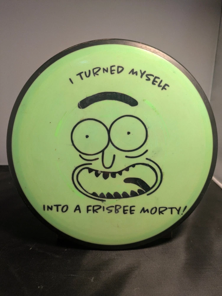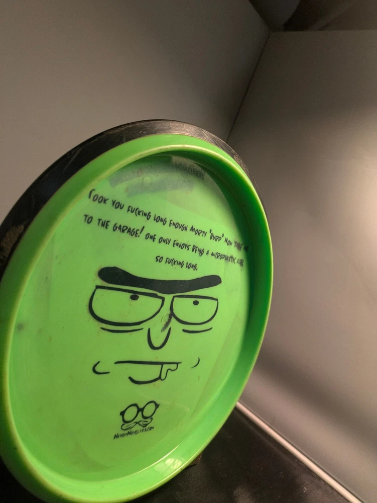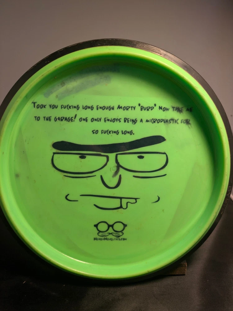 Add the Pre-beat, smart ass Frisbee Rick to your bag. An earlier attempt at a double sided dye, inspired by the green disc that will most likely end up blending into a lovely bush somewhere. But fear not there is a lovely note for whoever happens to find the pleasant surprise. This disc is also ink free. Disk Condition - 7/10 Flat(1)..2..3..4..(5)Dome - 1/5 Soft(1)..2..3..4..(5)Firm - 4/5