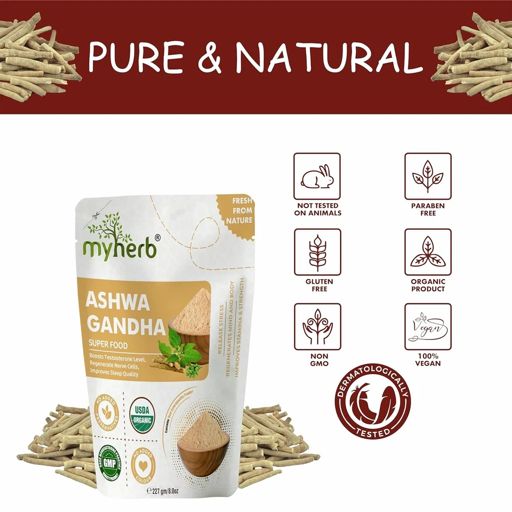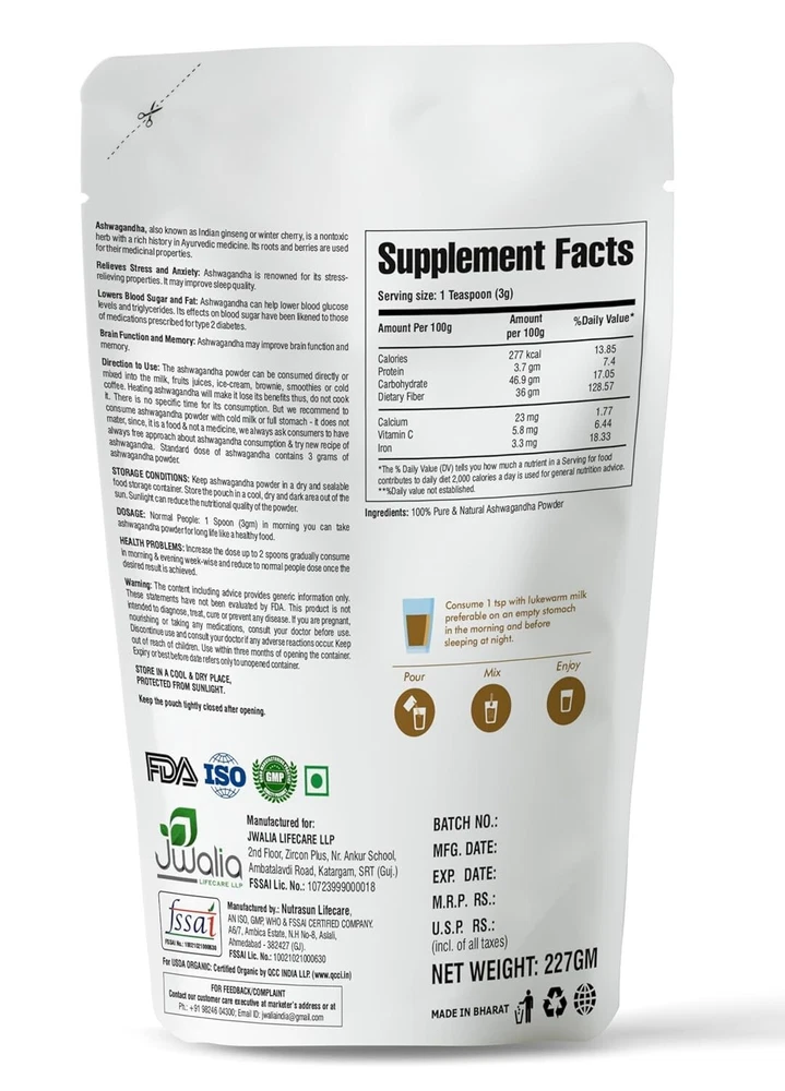 Product Description 100% Organic, Free from pesticides, chemicals or additives Processed in gluten free environment and processing unit Processed in Dry Environments-Ashwagandha grows ideally in dry and gluten free environments. These dried conditions are used for preservation of Ashwagandha roots. WORKS AS A SKIN TONER-A toner is an essential part of any woman’s skincare regimen and Ashwagandha is a wonderful skin toner which helps in cleansing the skin and shrinking the pores. Reduce Stress & Anxiety Ashwagandha is best known for its stress lowering effects. The medicinal herb appears to help lower levels of cortisol, a hormone produced by your adrenal glands in response to stress. Muscle Growth & Strength Supplementing with Ashwagandha may also increase muscle mass and strength. Inflammation & Help Fight Infection Ashwagandha may also help lower inflammation and boost your immunity