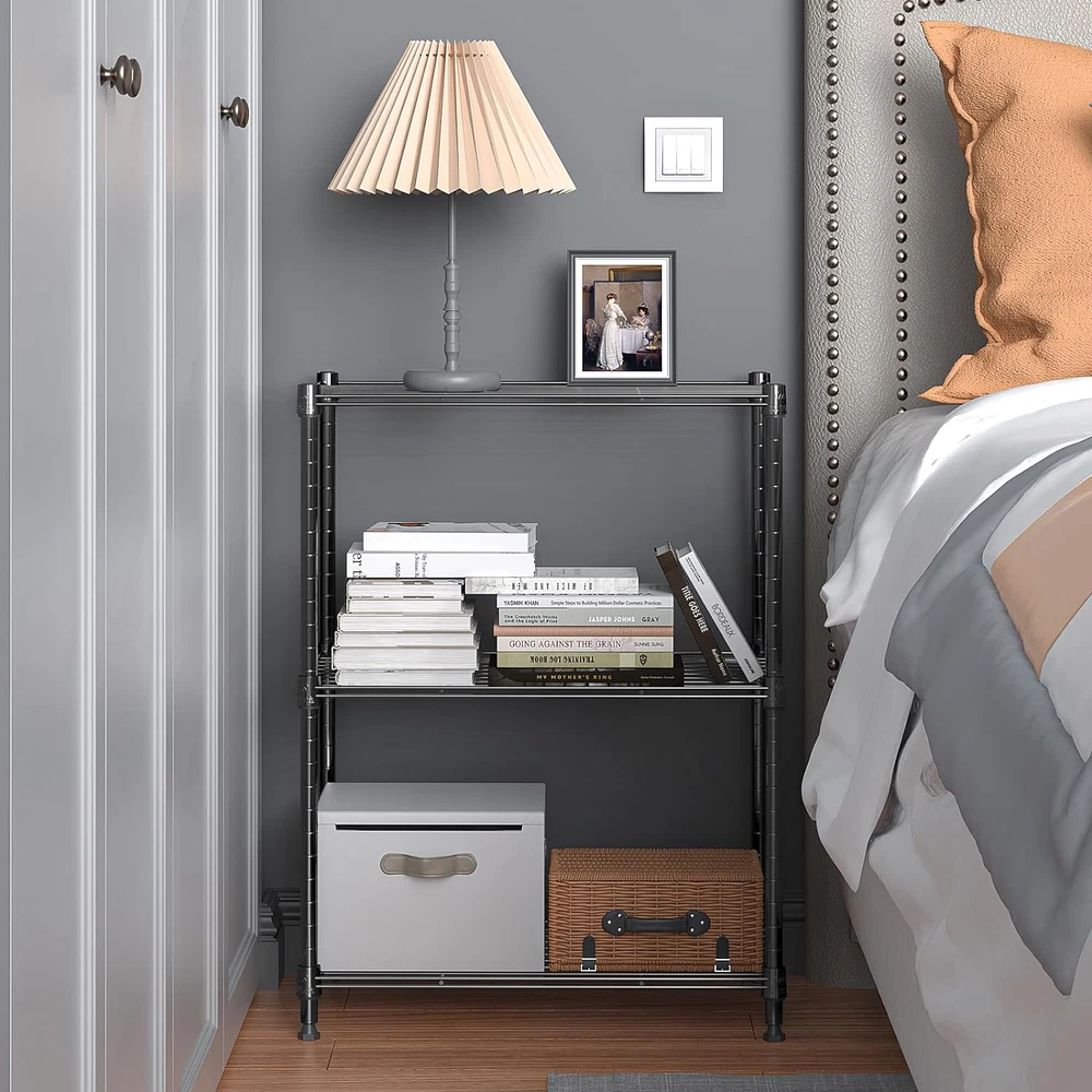 Carbon Steel 【Multifunctional Versatility】The storage shelves (11.8"D x 17.7"W x 26.3"H) are suitable for room, balcony kitchen, office, and garage shelving scenarios. 【Reliable Stability】Superior Carbon Steel and 15.9mm pipes enable this metal shelving to be sturdy and durable. Each shelf holds up to 150 lbs and the maximum entire unit weight capacity is 450 pounds. 【Adjustable Height for flexibility】Adjust the height of each shelf to accommodate items of various sizes based on your shelf storage needs. Enjoy the fun of DIY and more flexibility. 【Convenient Assembly】No tools required. Follow the instructions and the storage shelf can be set up quickly and effortlessly. 【Thoughtful Support】Quick response and solution can be provided within 24 hours. If you have any questions regarding missing parts and assembly, feel free to message us via Buyer Message. Product Description Fasten the plastic clip to the groove, and press it to make it more stable. The direction of the clip is indicated by an arrow and TOP. The four clips should be kept at the same height. Adjust the position of the plastic clips to adjust the height of each shelf. Slip the shelf into the pole and gently press it. The shelf cone is smaller at the top and larger at the bottom. Adjust the level (bottom) to ensure stability. (In case the ground is not flat.)