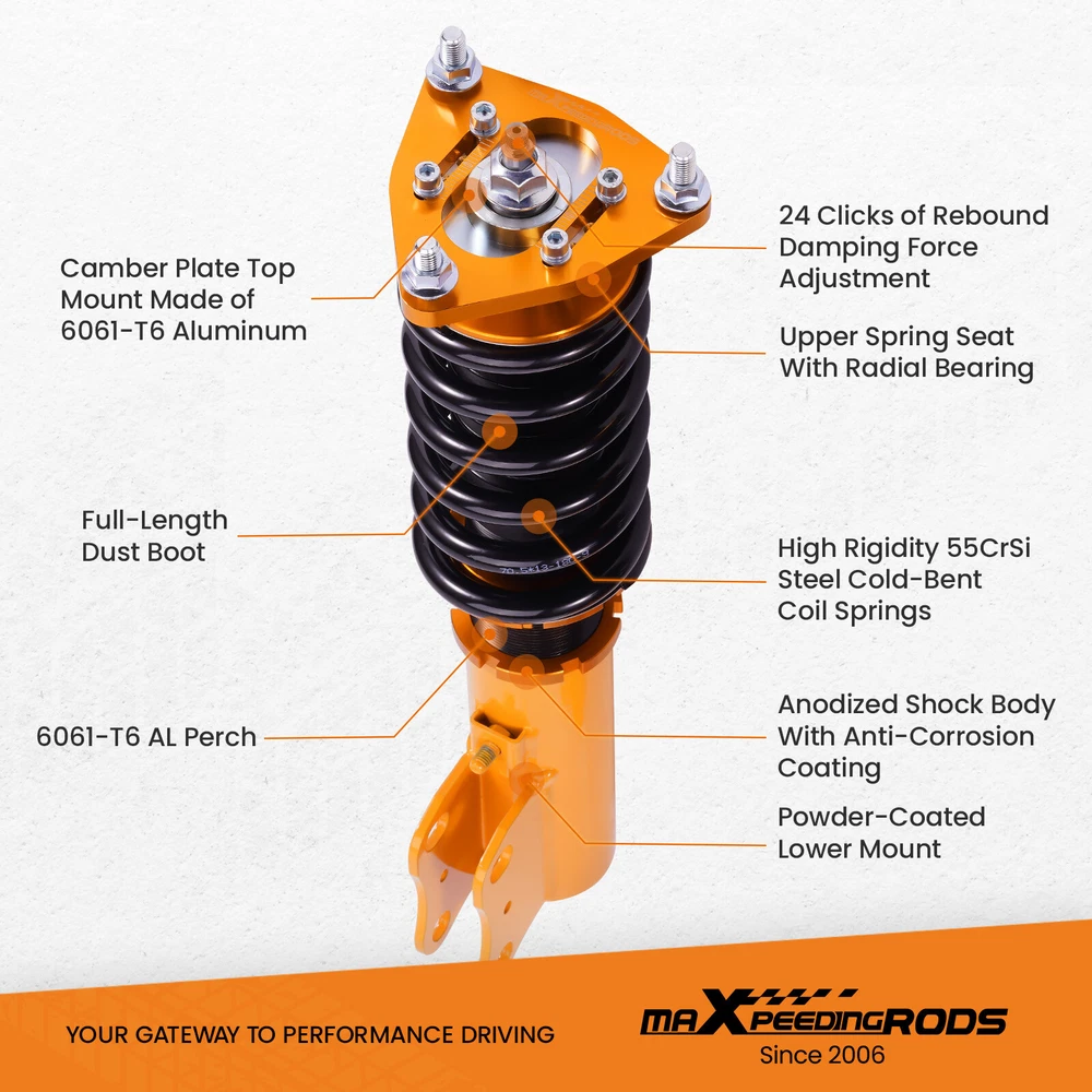 zjpss LOGO Home Contact us Promotion WHY CHOSE US Manufacturer We know our products Easy Return Quick, Simple Guaranteed Fitment Always the correct part PRODUCT DISPLAY MaXpeedingrods 24 Click Coilovers Suspension Shocks for Mitsubishi Lancer 08-16 Fast Shipping International Shipping 30 Days Return Policy Secure Shopping DESCRIPTION Maxpeedingrods' street coilovers are designed and developed for all motoring enthusiasts that want excellent handling without sacrificing comfort. This suspension system is ideal for daily driving and occasional, light track use. High quality components are adopted to ensure product durability and stability. Each application is fully test fitted and completely road tested to guarantee all our customers perfect performance and comfort expectations. Features 24 Clicks of Rebound Adjustments – With 24 clicks of rebound damping, you can now optimize your vehicle’s performance! With a wide setting capability, adapt from the roads, to off road, street or highways. Independent ride height adjustable – Easily adjust the height of your ride! This coilover also allows for height and preload adjustments. This means you can reach optimal suspension tuning while maintaining a stable, comfortable ride at all times. Advanced Twin-Tube Technology – The use of base valve enables to keep gas pressure low, allowing for a more comfortable ride. Low gas pressure avoids stress on seals and keeps friction low. Compared to the inverted type, friction can be suppressed. Applications For Mitsubishi Lancer (CX/CY) 2008-2016, except Lancer Evolution For Mitsubishi Outlander Sport (GA) 2011-2020 Specifications - Top mounts:pillow ball top mount front,standard rubber top mount rear. - Damping: 24 levels rebound damping adjustable - Front Spring Rate: 9kg/mm (504 lbs/in). - Rear Spring Rate: 6 kg/mm (336 in/lbs). - Adjustable Height: Yes lowering 1" to 3" - Shock type: Twin tube - Spring Preload: 7-10 mm - Color: Gold Package included 1 x Set of Coilover Spring Kit (2 Front + 2 Rear) 1 x Pair of wrenches for height adjustment ★ 30-day Money Back & 12-Month Replacement Guarantee. Please feel free to contact us if there is any question. 24 precise levels of damper adjustment; Pillow-Ball Top Mount Provides Sharp And Precise Handling; Independent ride height and spring preload adjustments; Lightweight aluminum shock body and 6061-T6 forged aluminum / carbon steel brackets; Twin-Cylinder Design - Allows Sufficient Stroke Within The Shock Absorber; 1 Year Warranty from Date of Purchase. SHIPPING US Domestic Shipping Notice - All items will be dispatched within 24hrs(Mon-Fri) Our carrier collects all the parcels at 4:30am PDT, any payment paid after 5:00am PDT will be shipped the next day at 4:30am PDT. If you paid Item Shipped On Est.Delivery Time Before Apr. 1st at 4:30am Apr. 1st at 5:00am Apr. 5th - Apr. 7th After Apr. 1st at 4:30am Apr. 2nd at 5:00am Apr. 6th - Apr. 8th If our estimated delivery time and eBay’s are contradictory,please refer to the standard delivery time of ours. Estimated Delivery Time From To Service Est.Delivery Time US US UPS or Fedex Ground 3-5 Business days Outside of US DHL FedEx 4-7 Business days Tracking number will be updated in 24 hours after shipment Please provide the following shipping information for your order Full physical address Telephone number Otherwise your shipment will be deferred. We are not responsible for any shipping lost caused by wrong shipping information Shipping rate If our ebay item listing doesn't show the shipping cost to your place. Please contact us to calculate the shipping fee for you. International Shipment For international shipment, we do not cover any import taxes or duties. Import tax is charged by the government, not us. Our item price and shipping cost do not include any import tax which will be charged by the shipping company when you got the parcel. Please be noted that is not the extra shipping fee. ` NO hidden charge!!! WARRANTY Free 2 Year Warranty: All AutoModPlanet products have 2 year warranty (unless otherwise stated). In the very unlikely event that you have a problem with our product, please contact us via eBay messages. Easy Return: If you are unhappy with your purchase for any reason, you can return it to us in an un-used condition in the original packaging within 30 days of purchase and we'll give you a refund or exchange. The refund/Exchange will not include postage/eBay costs. Please note you MUST contact us to obtain a Return Authorization Number before returning any part. Any parcel without the Return Authorization Number will be rejected. If your item is faulty or was incorrect, you must contact our sales representative before returning the parcel and we will endeavour to solve the problem effectively. Video or picture is required to show the item condition before we issue the Return Authorization Number. Important notice: 1. Any returned item(s) without Return authorization number will be rejected. 2. Please return your item(s) in original packaging and ensure that all packages are securely wrapped 3. We will not accept responsibility for loss or damage of goods during transit, please ensure that the insurance cover option is taken where possible 4. Upon receipt, all products will be inspected at our discretion in 3-5 business days. Then, the updated result will be informed. If you have made a mistake on purchase and wish to cancel the order before it is dispatched please contact us by ebay massages or email as quickly as possible. Note: All parcel will be collected by carrier at 8:00am on Monday to Friday. FAQ Will this fit my car? We have used the eBay compatibility list as a guide for buyers to use, but the eBay data system is not accurate and incomplete sometimes. Please make sure you have read through the whole listing and paid attention to “note” and “notice”. If there is any uncertain, please use the eBay message to check with our sales first. How much does delivery cost and how l