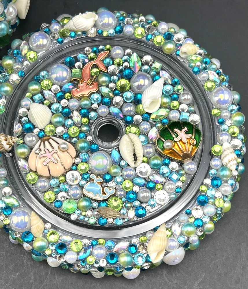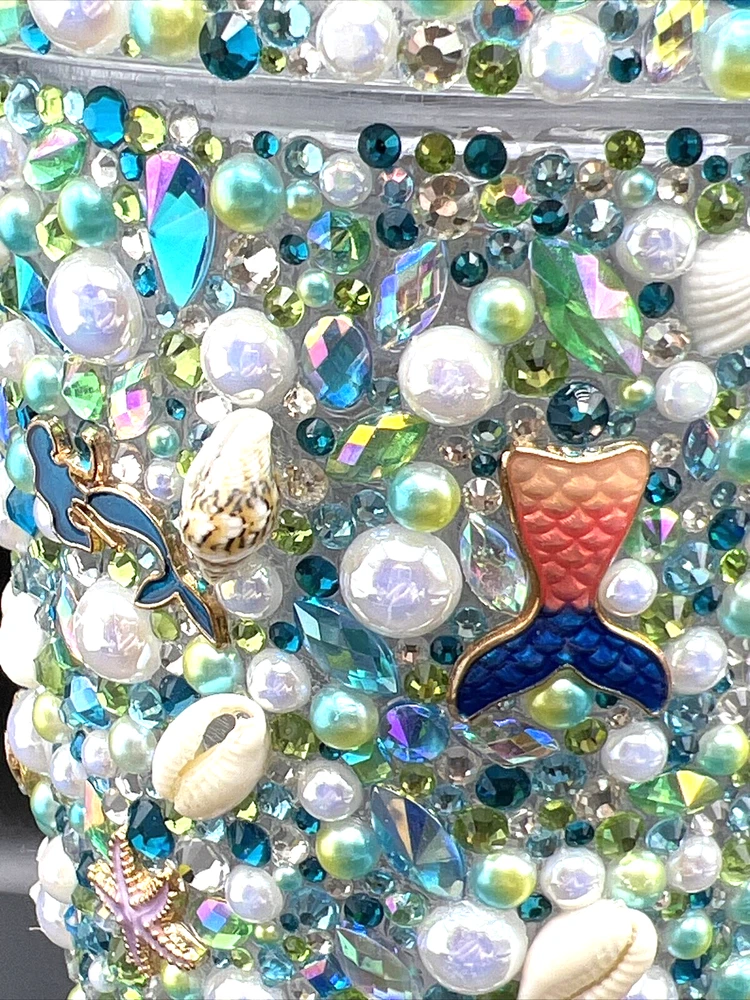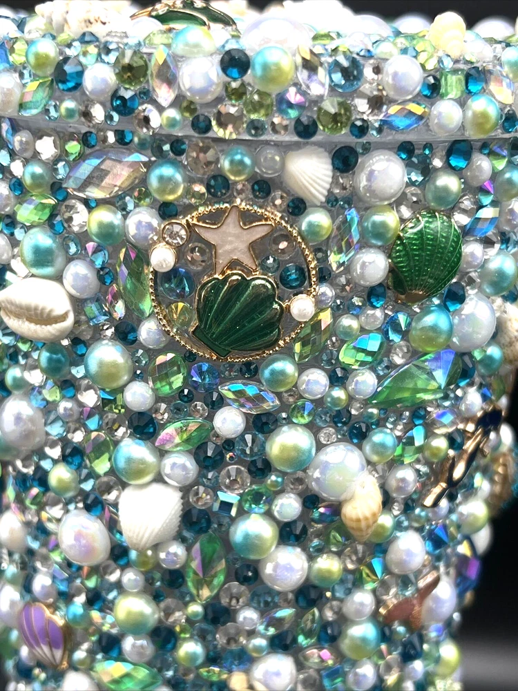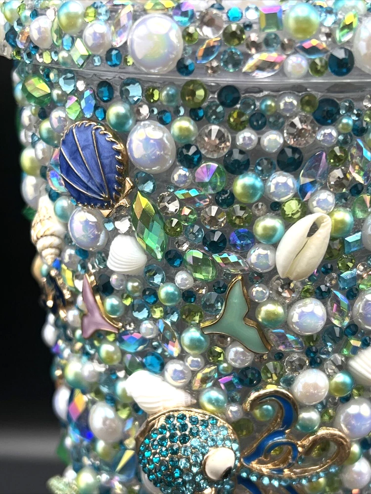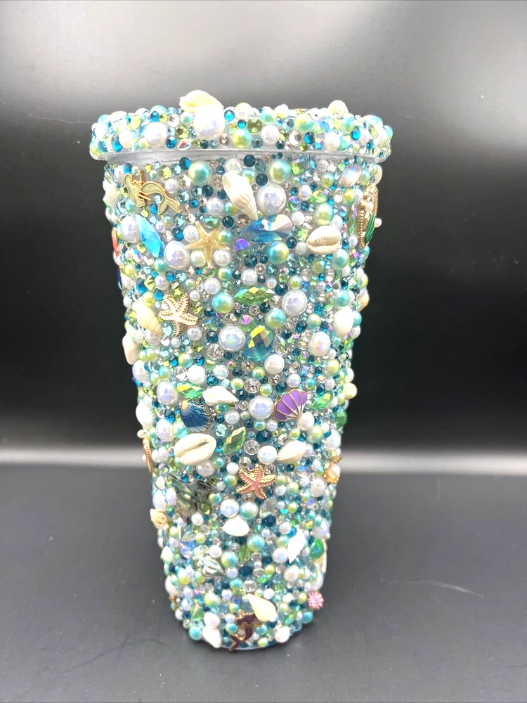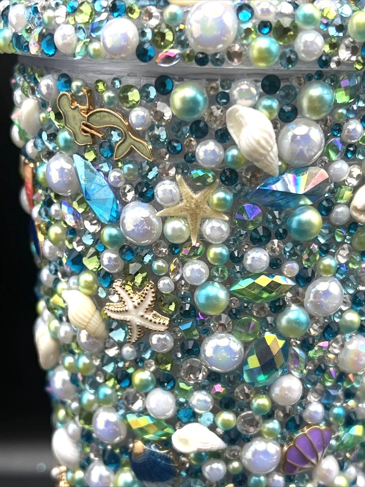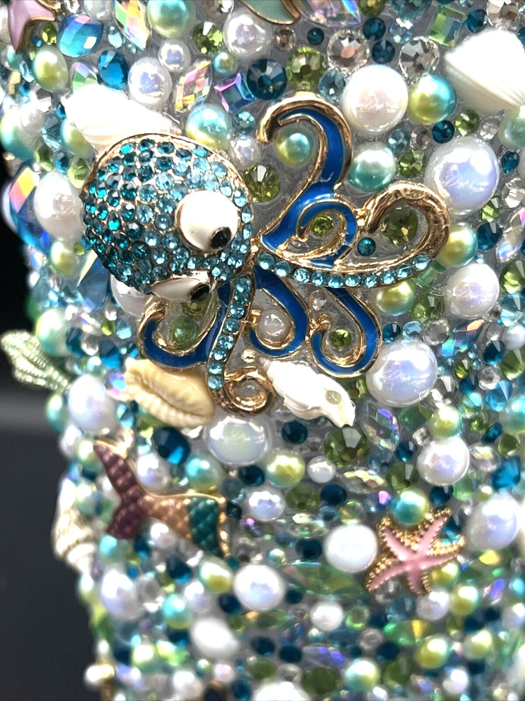 This 32 oz. Maars Drinkware Insulated Travel Tumbler is perfect for people on the go who want to take their favorite hot or cold beverage with them. The tumbler comes with a twist lid that helps keep the drink safe and secure. The sea things pearls and rhinestones pattern is perfect for those who love underwater sea characters. Measuring approximately 9 inches in height and about 5 inches wide, this tumbler is made of acrylic material that is durable and long-lasting. This tumbler is perfect for people who love to travel and want to stay hydrated while on the go. Each piece was hand placed on this Tumbler and is stunning to look at . Would make a great gift for a sea lover . The Octopus is a stand out on this piece . I will pack with care and get it to you ASAP Thanks for looking !