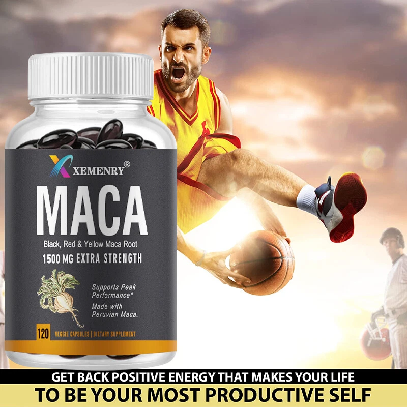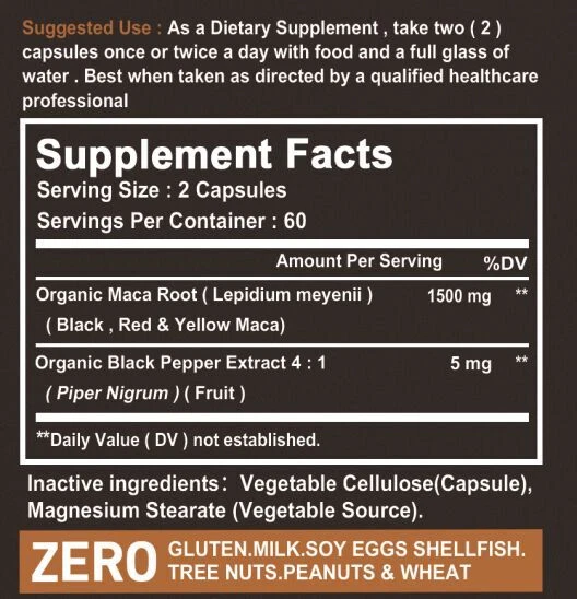 Effects: Energy & Endurance, Men's Health Ingredients: Maca Root, Black Pepper Directions: Take 2 capsules once daily after a meal. Shipping: Ships within 48 hours on working days. Shelf life: 2 years Description: PREMIUM QUALITY MACA ROOT SUPPLEMENT - Our Triple Strength 1500 mg Maca Root Capsules provide a pure, potent dose. Made from red, yellow, and black maca roots from the Peruvian Andes, they are traditionally used to support peak performance, strength, and endurance. SUPERFOOD - Maca root is a plant-based superfood that helps balance hormone levels, boost energy, and promote overall well-being. Perfect for athletes, weekend warriors, and anyone who wants to stay physically active. HIGH QUALITY - Our maca is made from organic maca root that goes through a process called gelatinization, which utilizes heat and water to make our maca easier to digest. Our maca capsules do not contain gluten, milk, soy, tree nuts, peanuts, or wheat. Document