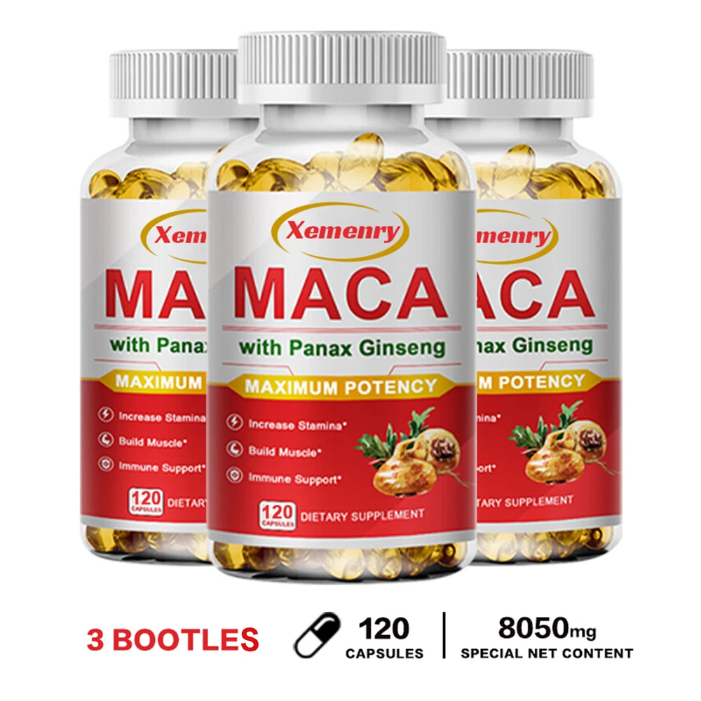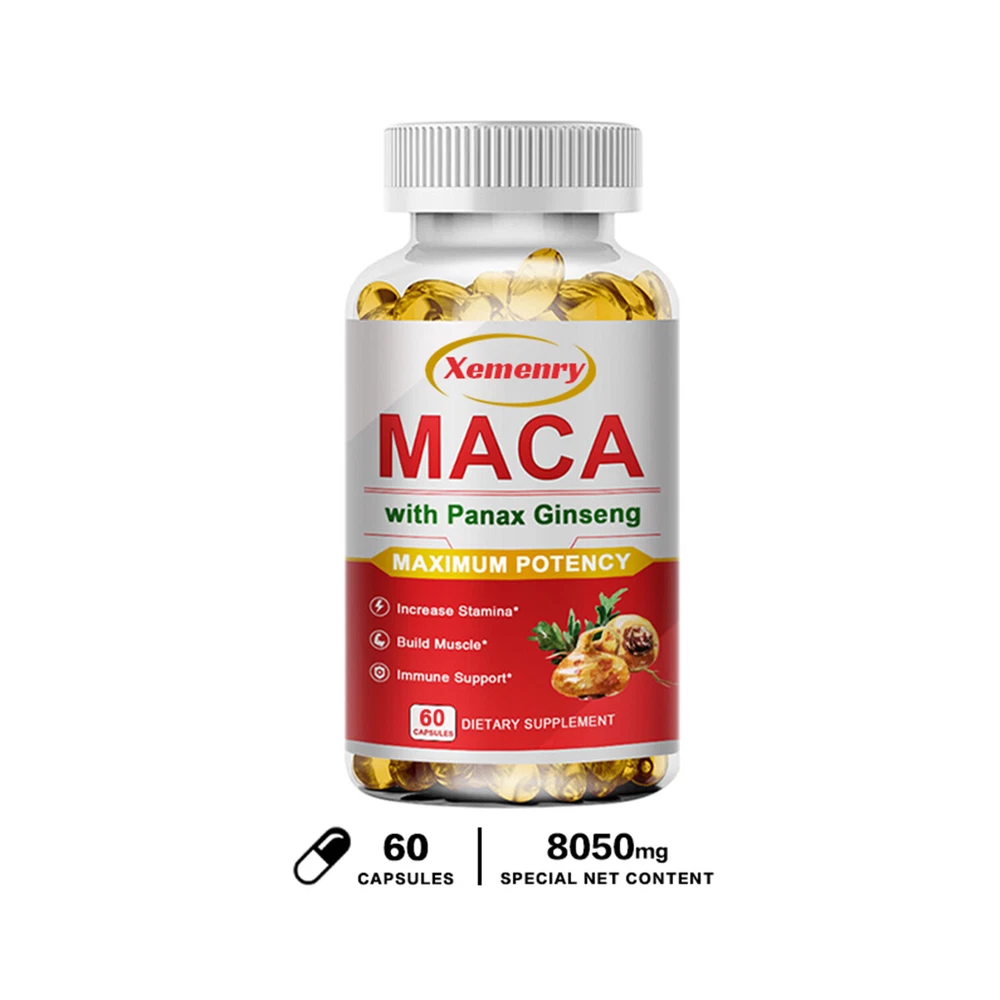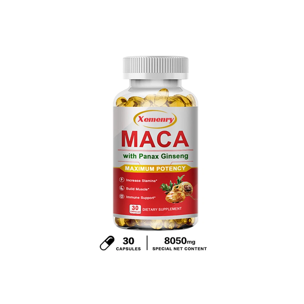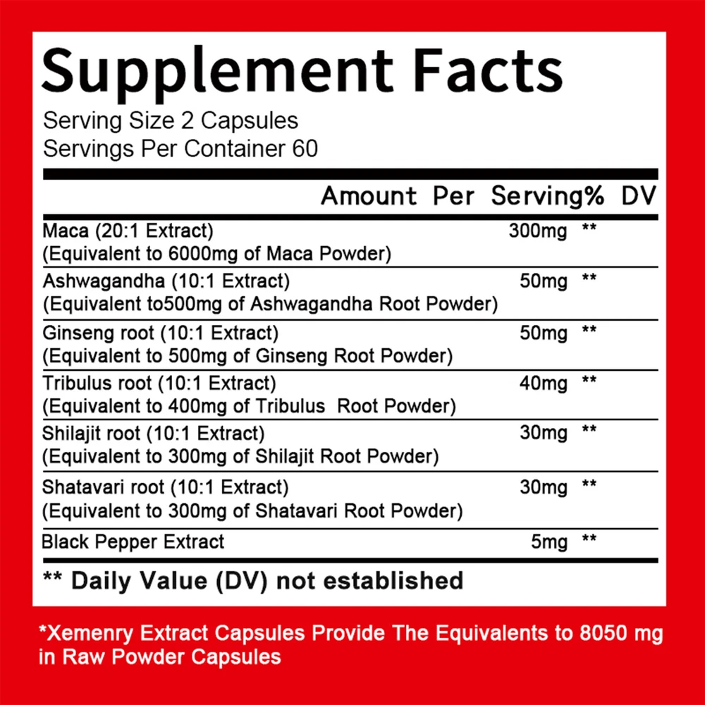 Effects: Testosterone Booster, Energy & Endurance Ingredients: Maca, Ashwagandha, Ginseng, Tribulus Directions: Take 2 capsules once daily after a meal. Shipping: Ships within 48 hours on working days. Shelf life: 2 years Description: Multiple Premium Ingredients - Our capsules are a powerful blend of natural ingredients. Includes ingredients such as Maca, Ashwagandha, Tribulus and Black Pepper. These ingredients work synergistically to aid strength, muscle mass, energy production, and the immune system. Making it ideal for those looking to improve athletic performance or improve overall physical endurance. COMPLETE HEALTH BENEFITS - This powerful formula is packed with benefits designed to support your overall health. From building strength and endurance, to balancing hormones and improving mood, maca root can transform your daily life. Document