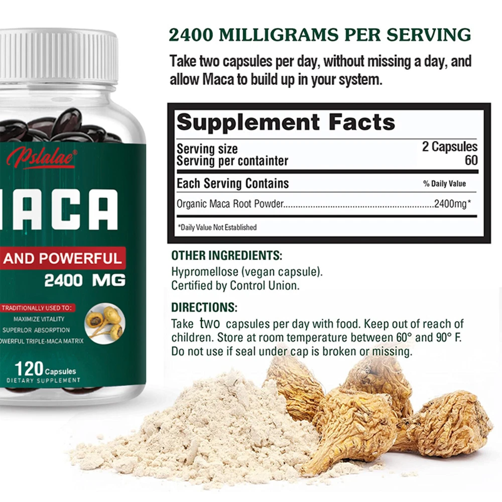 Effects: Energy & Endurance, Testosterone Booster Ingredients: Maca Directions: Take 2 capsules once daily after a meal. Shipping: Ships within 48 hours on working days. Shelf life: 2 years Description: COMPLETE NATURAL HEALTH SUPPORT: Maca is an ancient superfood known for supporting body energy, endurance and performance. Great for athletes, health enthusiasts and anyone looking for a natural energy boost. These capsules support energy, endurance, hormonal balance, improved mood and overall health. Maximize your energy: get power-ups! When you're low on energy or feeling sluggish, maca root extract in capsule form can help boost your energy levels. Boost energy and build strength during workouts. HIGH QUALITY - Produced in a GMP certified facility using non-GMO ingredients and rigorously third-party lab tested to ensure maximum purity and precise potency. Document