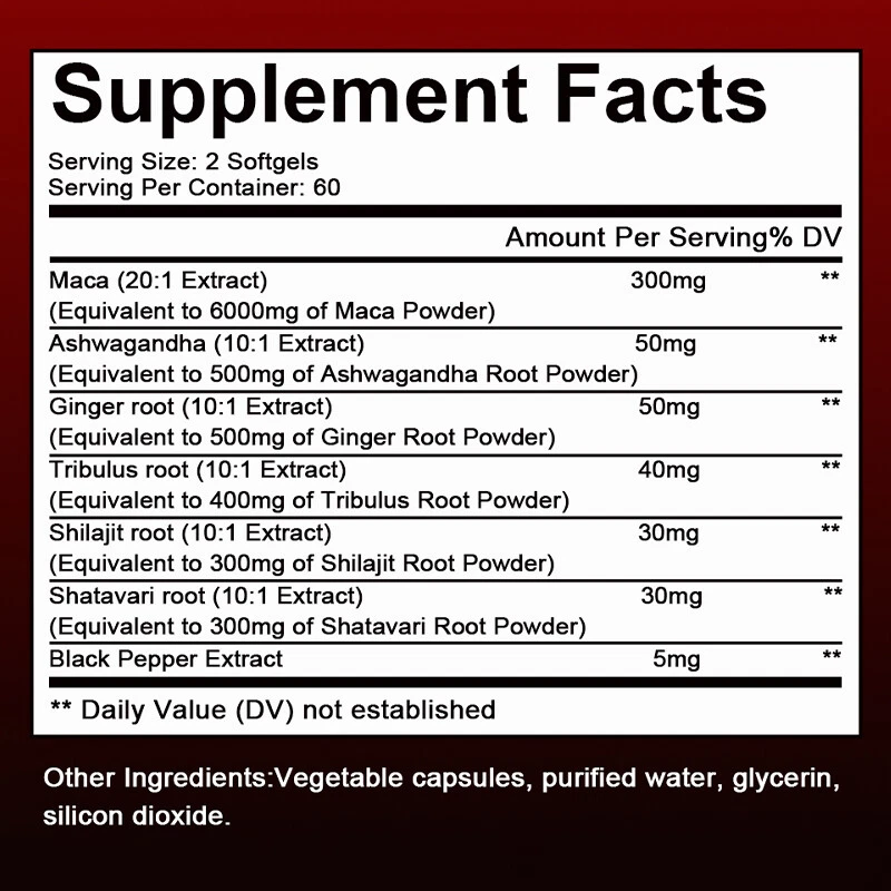 Administration: Oral Features: Natural, Organic, Salt-Free, Sugar-Free Production Date: 07/2024 Ingredients: Ashwagandha, Ginseng, Maca, Tribulus, Black Pepper Department: Men Shelf Life: 2 years Brand: Tecepec Scent: None Item Weight: 1.45/2.09/3.06oz Active Ingredients: Maca Root Formulation: Capsule Main Purpose: Bodybuilding, Immune Support, Mood Support, Muscle Growth, Sexual Health, Blood Flow FDA Registration Number: 18296790194 Country/Region of Manufacture: Unknown Expiration Date: 07/2026 Type: Extract Type of Diet: Vegan Number of Pills: 30/60/120