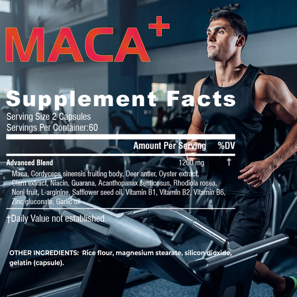 Effects: Testosterone Booster, Energy and Endurance Ingredients: Maca, L-arginine, Rhodiola, Cordyceps Directions: Take 2 capsules once daily after a meal. Shipping: Ships within 48 hours on working days. Shelf life: 2 years Description: ADVANCED FORMULA: Contains a variety of premium ingredients such as Maca, Cordyceps, Arginine, Rhodiola, vitamins and more to boost nitric oxide production, support nutrient delivery during workouts, muscle recovery and endurance for optimal results. ENHANCED ENERGY & ENDURANCE: Natural energy production, improved mood, strength and overall vitality, supporting optimal physical and mental performance. Perfect for those seeking enhanced wellness and hormonal support. TRUSTED QUALITY: Our supplements are manufactured in a GMP certified facility, ensuring the highest safety and quality standards. Non-GMO, gluten free, and contains no artificial colors, flavors or sweeteners. Document