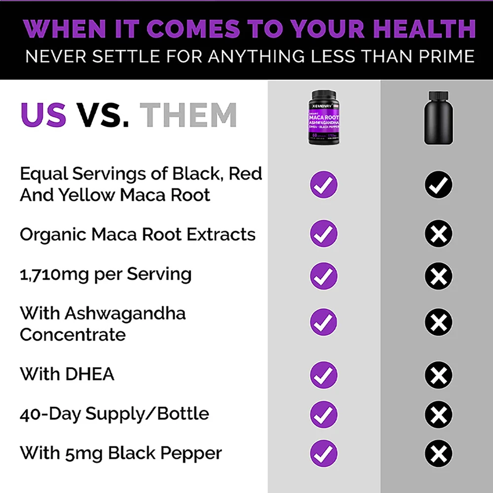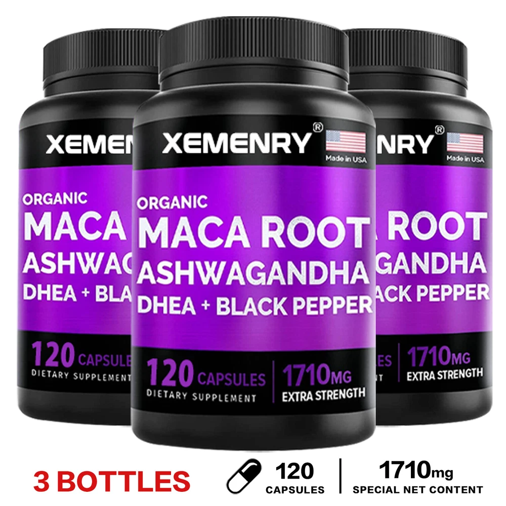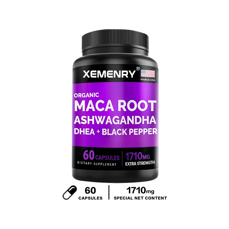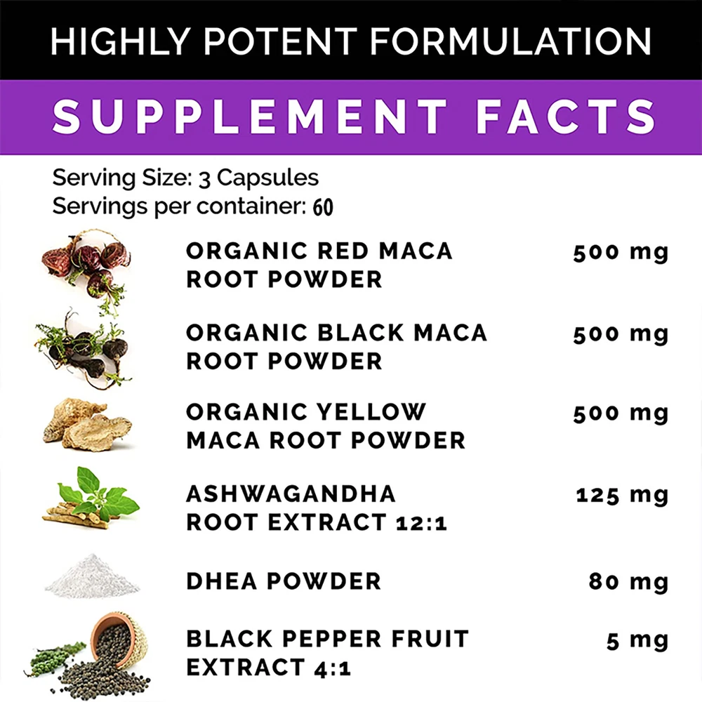 Effects: Energy & Endurance, Testosterone Booster Ingredients: Maca,Ashwagandha Directions: Take 2 capsules once daily after a meal. Shipping: Ships within 48 hours on working days. Shelf life: 2 years Description: Hormone Balance: Red, Black, and Yellow Maca Roots, and Ashwagandha all help balance and regulate hormone levels, including reproductive health, and improve symptoms of imbalances. Energy Boost: These blends have a natural energizing effect, helping to improve endurance, physical performance, and overall vitality. Helps improve the body's resilience and ability to cope with stress. Document