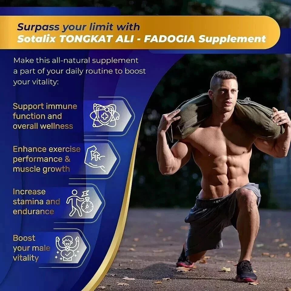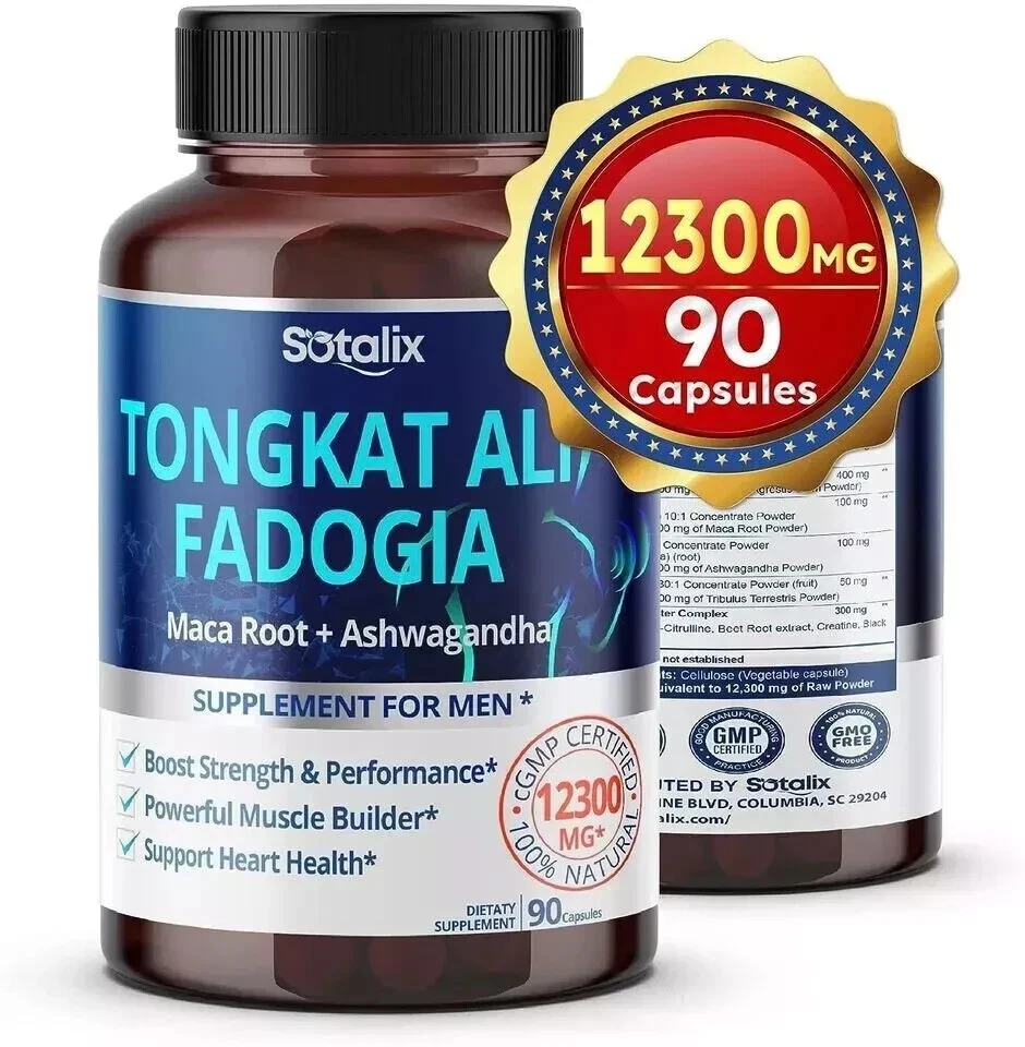Premium Tongkat Ali 200:1 Extract (Longjack) 4780mg Ultra Potency with Maca Root Ginseng Tribulus Terrestris Ashwagandha - High Strength For Men Women-90 day supply (90 Count (Pack of 1)) About this item 💥 UNLOCK YOUR FULL POTENTIAL: Each of these capsules is packed with 4780mg of concentrated herbal powder to ensure maximum performance. Taking one capsule of Tongkat Ali supplements every day will increase your energy level naturally, balance the immune system, improve muscle strength, and promote restful sleep. It's perfect when combined with a daily workout, the positive changes in your body will become apparent - increased strength, improved health, and enhanced durability. 💥 HIGH CONTENT INGREDIENT: Sotalix Tongkat Ali contains a super-concentrated 200:1 Tongkat Ali (Longjack) extract, which offers superior nutritional value and maximum advantages for your overall health. Other brands are just using fresh Tongkat Ali powder or less than 10:1 extract. So, it’s 20X MORE EFFECTIVE than other Tongkat Ali products. 💥 UNIQUE COMBINATION - 6IN1: The Sotalix Tongkat Ali Supplement offers a distinctive blend of 6 top-quality ingredients in every capsule that brings better efficiency for you. Tongkat Ali, Maca Root and Panax Ginseng have powerful effects in supporting muscle growth and increasing workout performance. Meanwhile, the combination of Tribulus Terrestris, Horny Goat Weed, and Ashwagandha works to boost energy levels and promote intensity. 💥 100% NATURAL EXTRACT - SAFE AND EFFECTIVE: Sotalix Tongkat Ali has been tested by 3rd-party labs. It contains only pure vegetarian ingredients and is completely free of harmful chemicals. If you follow a vegetarian diet, our supplement is the perfect option for you. So you can safely use it without having to worry about the origin of the product. 💥 ENSURING YOUR SATISFACTION: We take pride in producing only the highest quality supplements. Your gratification and health are our top priority, which is why all of our products are created in a GMP-certified facility. And before being put on the market, our products have undergone multiple rigorous tests by ISO 17025 accredited labs. Feel results or all your money back no questions asked.
