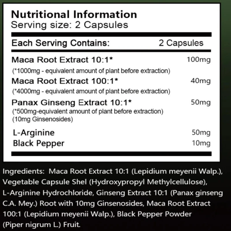 Store Categories Store Categories Other Maca Root Capsules - Pure Natural with Ginseng 60/120 Capsules - Fast Shipping Product Description Description 💪🏼 ENDURANCE, PRE-WORKOUT, AND MORE: Black Maca is an ideal supplement for athletes, bodybuilders, weekend warriors, and anyone who wants to stay physically active. Suitable for both men and women, this maca root provides essential energy-boosting support to help build muscle mass, increase strength, increase endurance, and improve athletic performance. Additionally, Black Maca is rich in vitamins and minerals that are necessary for muscle repair and fighting fatigue. Payment Policy Shipping Policy Returns Policy Payment Policy eBay Accepts The Following Payment Methods: 1.Visa 2.Mastercard 3.PayPal 4.Apple Pay 5.Google Pay 6.American Express Card Shipping Policy All the items will be dispatched within 3 business day after the payment is clear. Shipping may be delayed during special holidays We are not responsible for any custom duty or import tax. Returns Policy 1. If you need return, please contact us with Email before open a case, let us know the detailed problem and send us some pictures for confirmation. 2. All returned items must be in the original packaging and provide us tracking number, specific reason for the returns. Copyright © 2023 Dianxiaomi