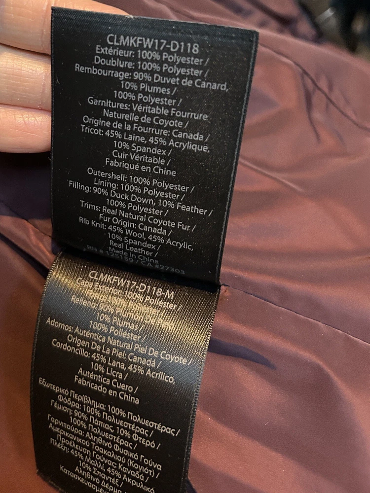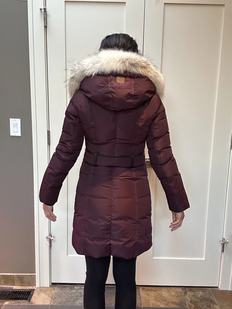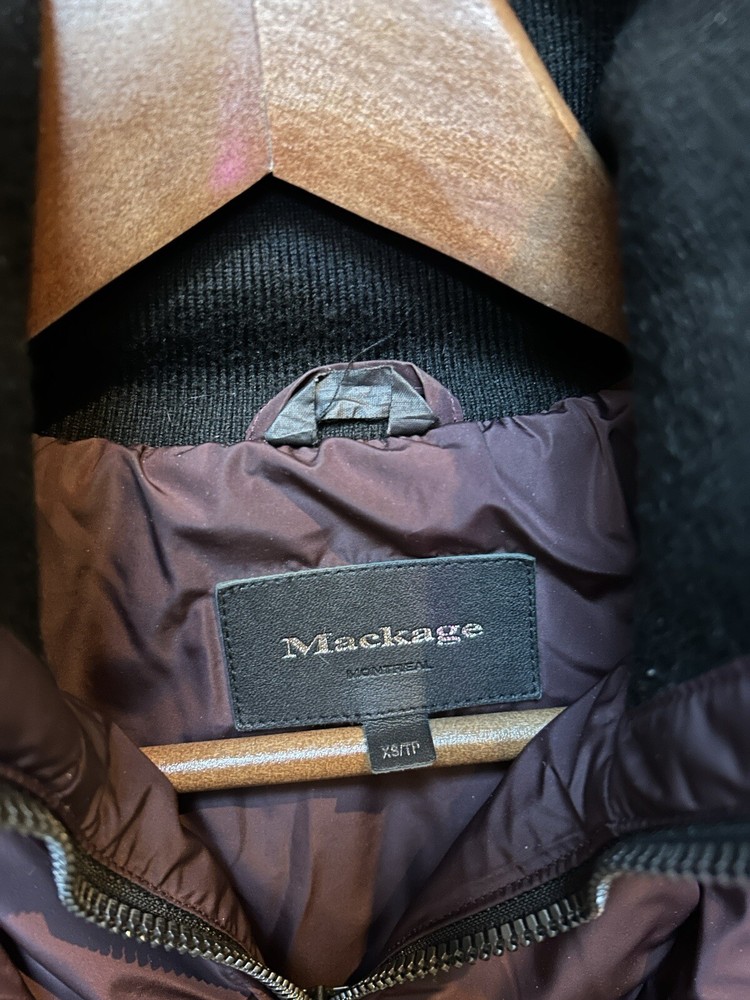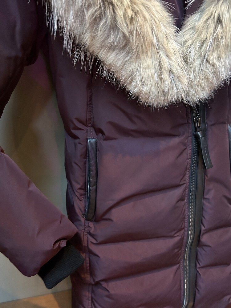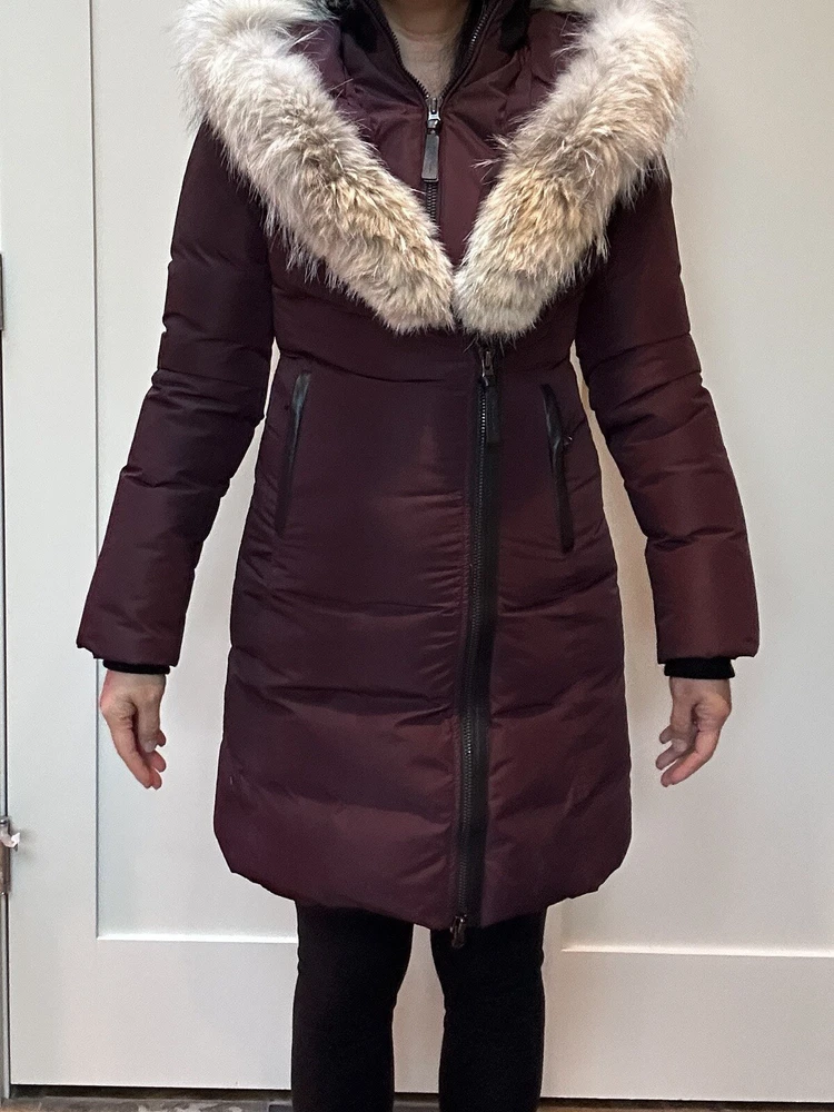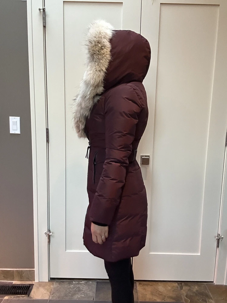 Stay warm and stylish with this Mackage Down Burgundy Coat in size X-small. Made with high-quality polyester outer shell and cozy down insulation, this parka is perfect for tackling cold winter days. Featuring a luxurious coyote fur trim and a flattering burgundy color, this coat is a must-have for any fashion-forward woman's wardrobe. Perfect for everyday wear or special occasions, this coat combines practicality and elegance effortlessly. Please see picture with green circles. One area with some dark discoloration, but not highly noticeable. Another area with light areas that maybe dry cleaning can clear. Model in photo is too big for the jacket! :-) But for perspective, model is 5’3” and about 135 pounds.