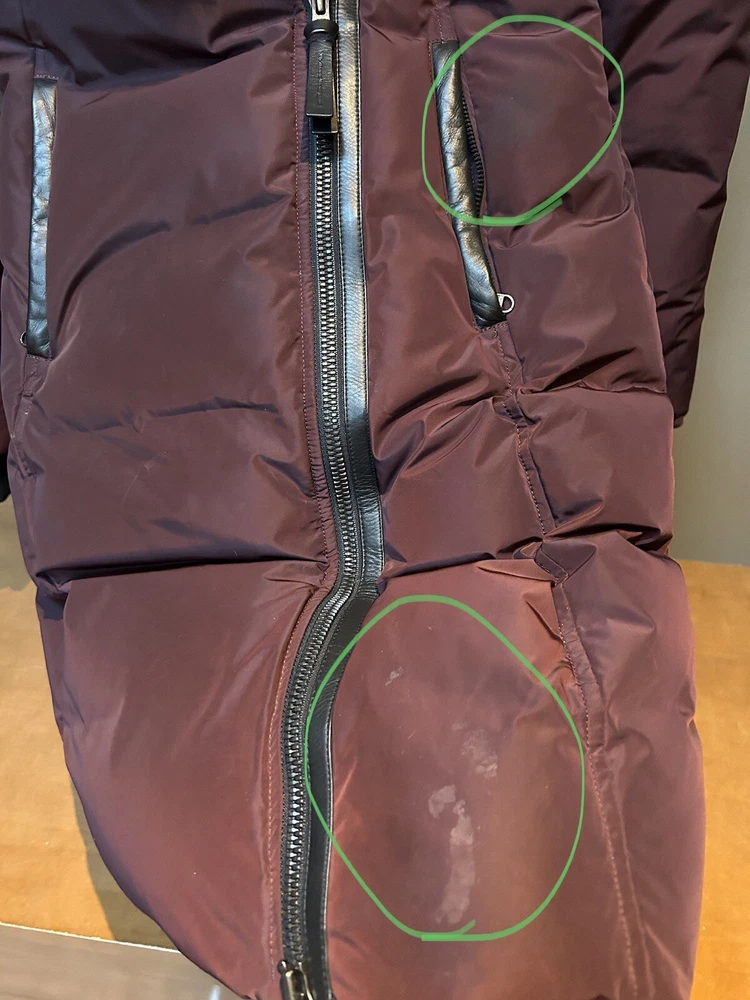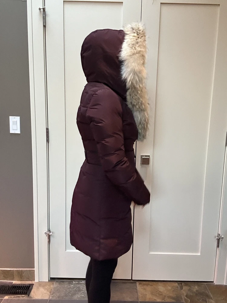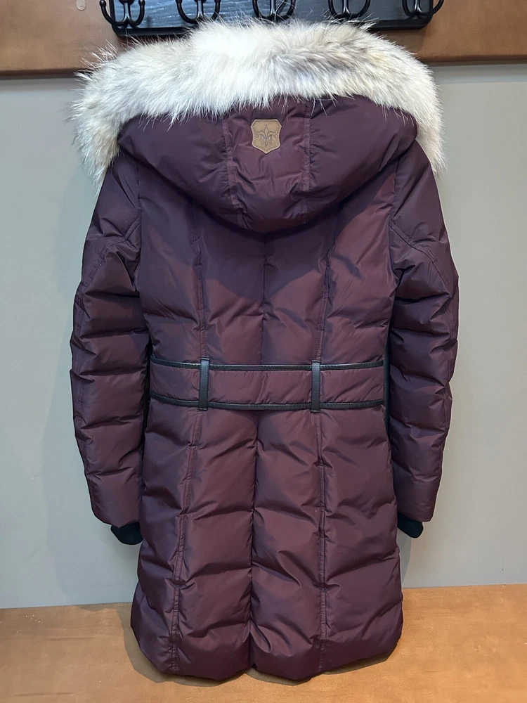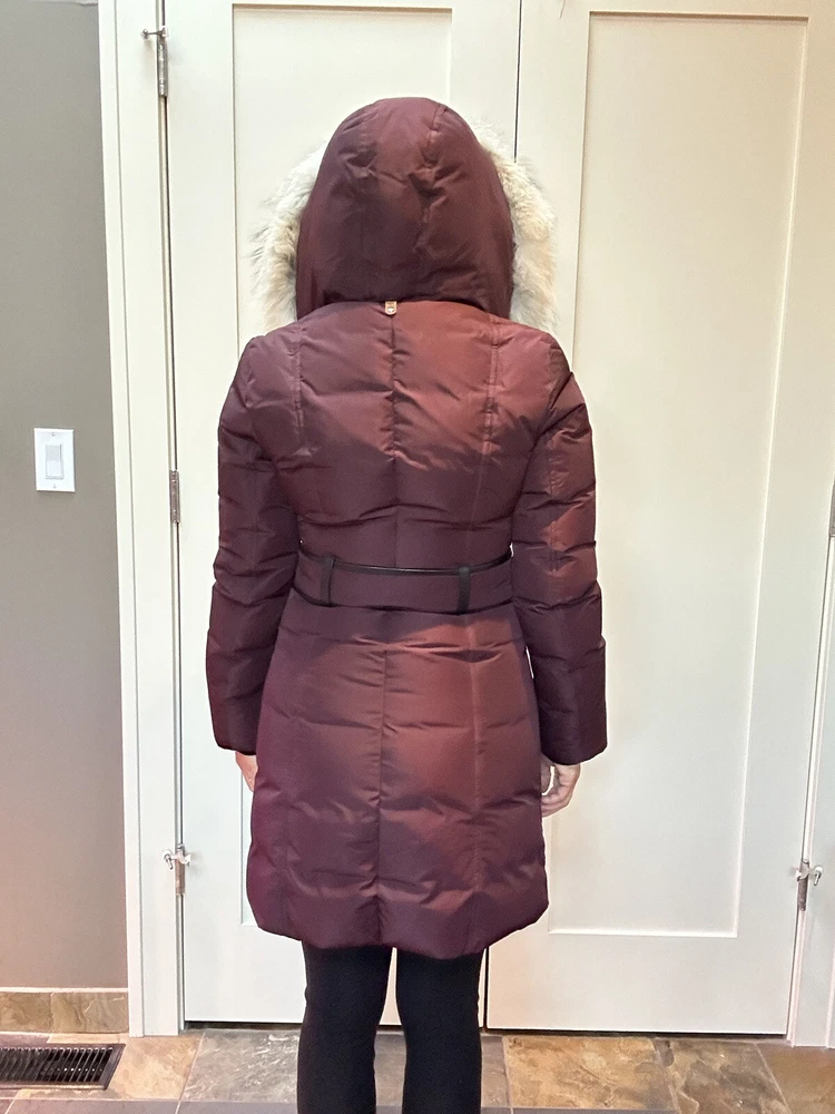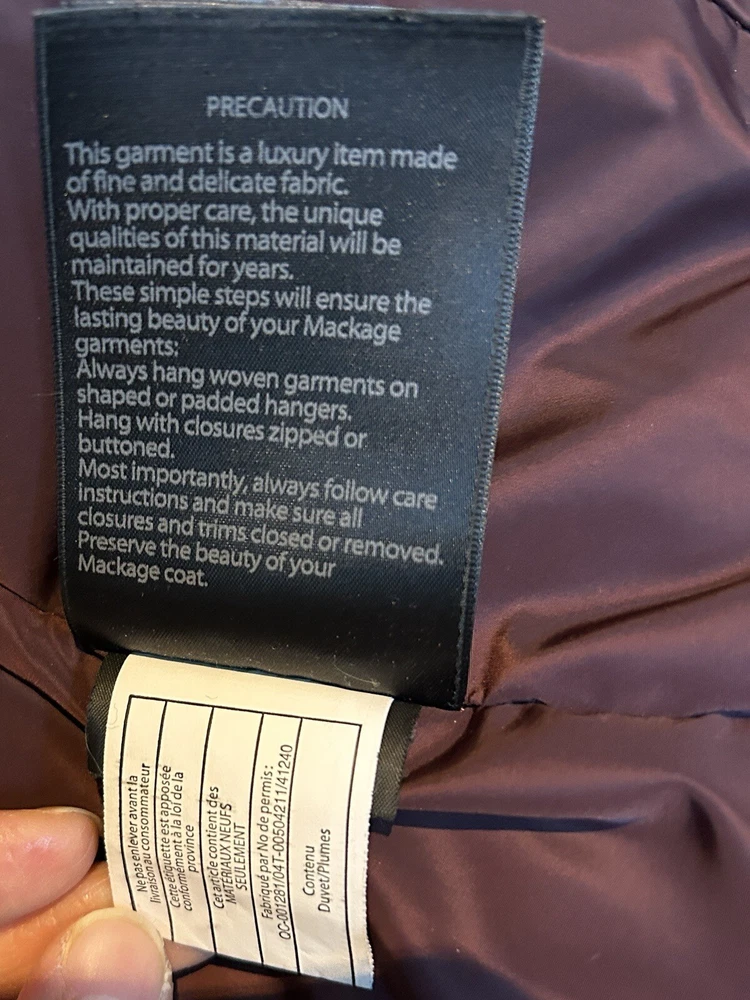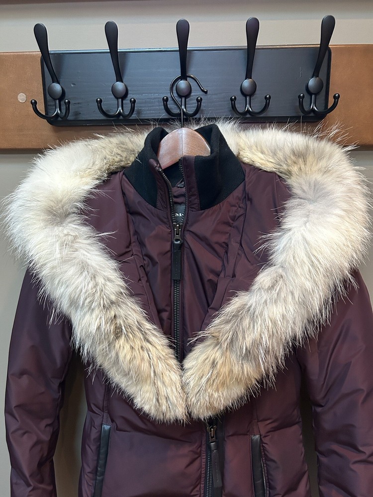 Stay warm and stylish with this Mackage Down Burgundy Coat in size X-small. Made with high-quality polyester outer shell and cozy down insulation, this parka is perfect for tackling cold winter days. Featuring a luxurious coyote fur trim and a flattering burgundy color, this coat is a must-have for any fashion-forward woman's wardrobe. Perfect for everyday wear or special occasions, this coat combines practicality and elegance effortlessly. Please see picture with green circles. One area with some dark discoloration, but not highly noticeable. Another area with light areas that maybe dry cleaning can clear. Model in photo is too big for the jacket! :-) But for perspective, model is 5’3” and about 135 pounds.