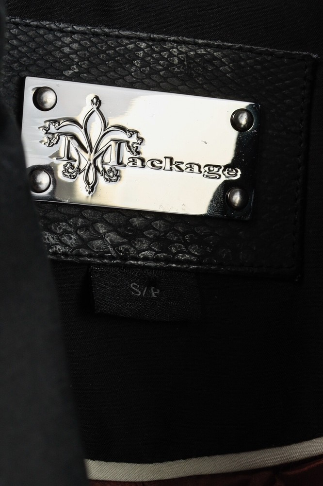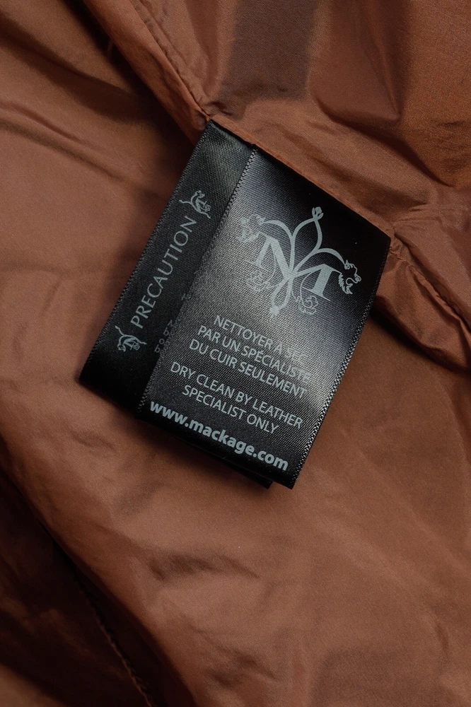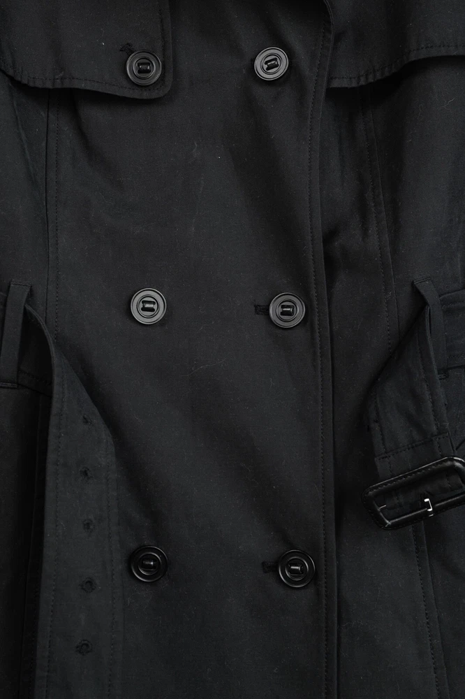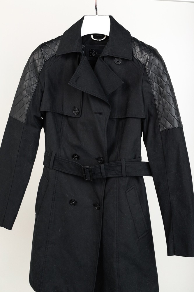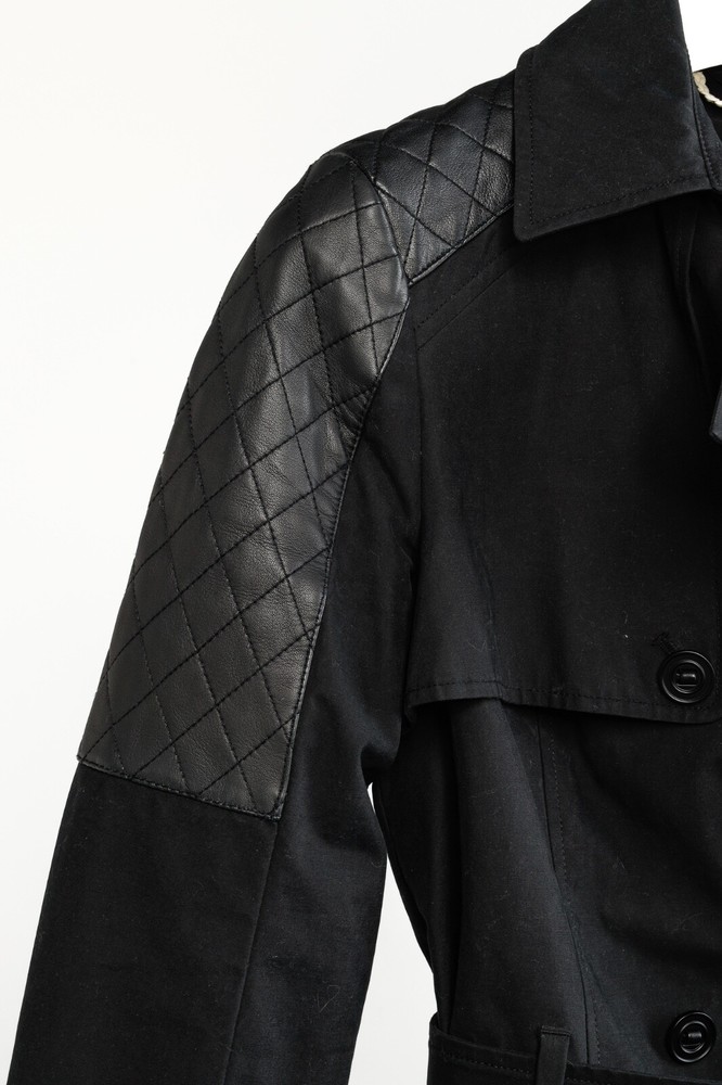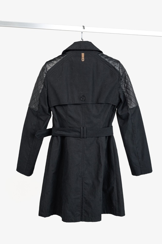 Circa 2013, the Lilith trench coat from Mackage is crafted in a sturdy Black cotton, and is adorned with quilted tonal leather on the shoulders. It features long sleeves, a collared neckline, double-breasted button front closures, a belted waist, side welt pockets, a back flap and slit, and is lined in a brown satin on the bodice, and a tonal satin on the sleeves. Size: S Condition: Great; some marking on neck, front bodice, sleeves, and back flap and hem. Approximate Measurements (laid flat): Shoulder: 14.5" (37 cm) Chest: 17.5" (44.5 cm) Length from back: 34.25" (87 cm) Sleeve length: 24.75" (63 cm) Composition: Outershell: 62% cotton, 38% polyester. Sleeves: Genuine lamb leather. Lining: 100% nylon.