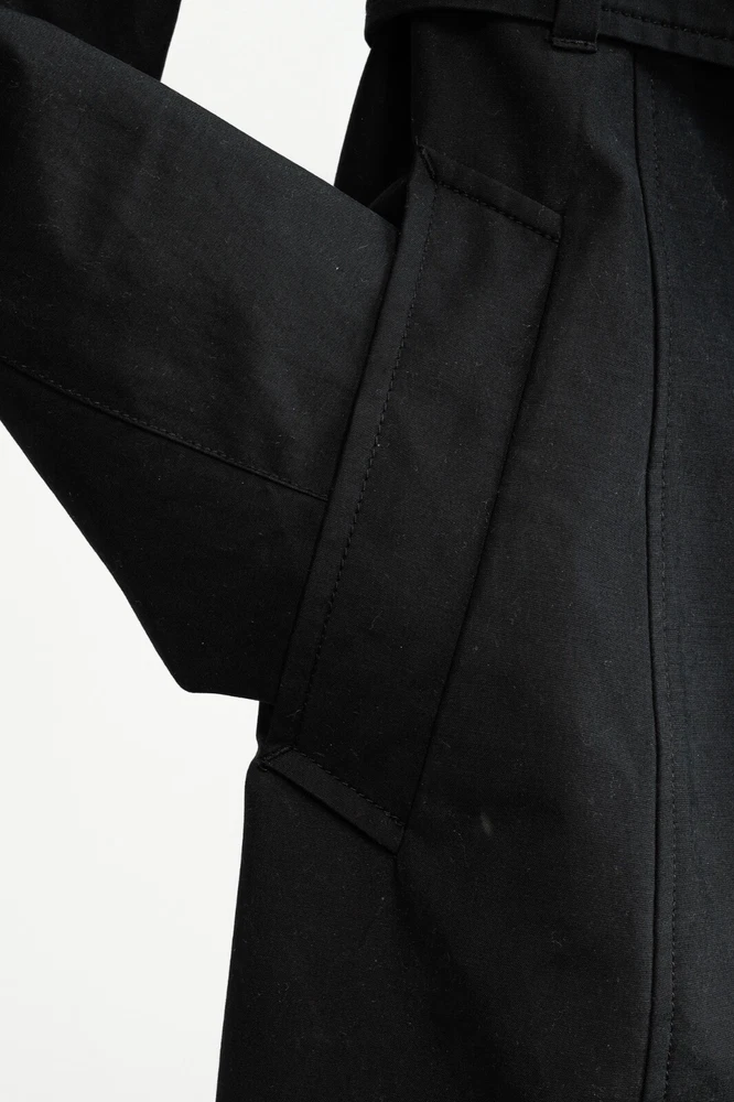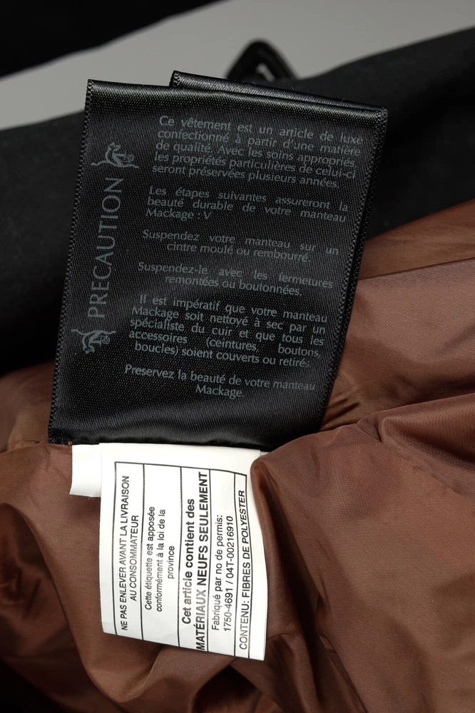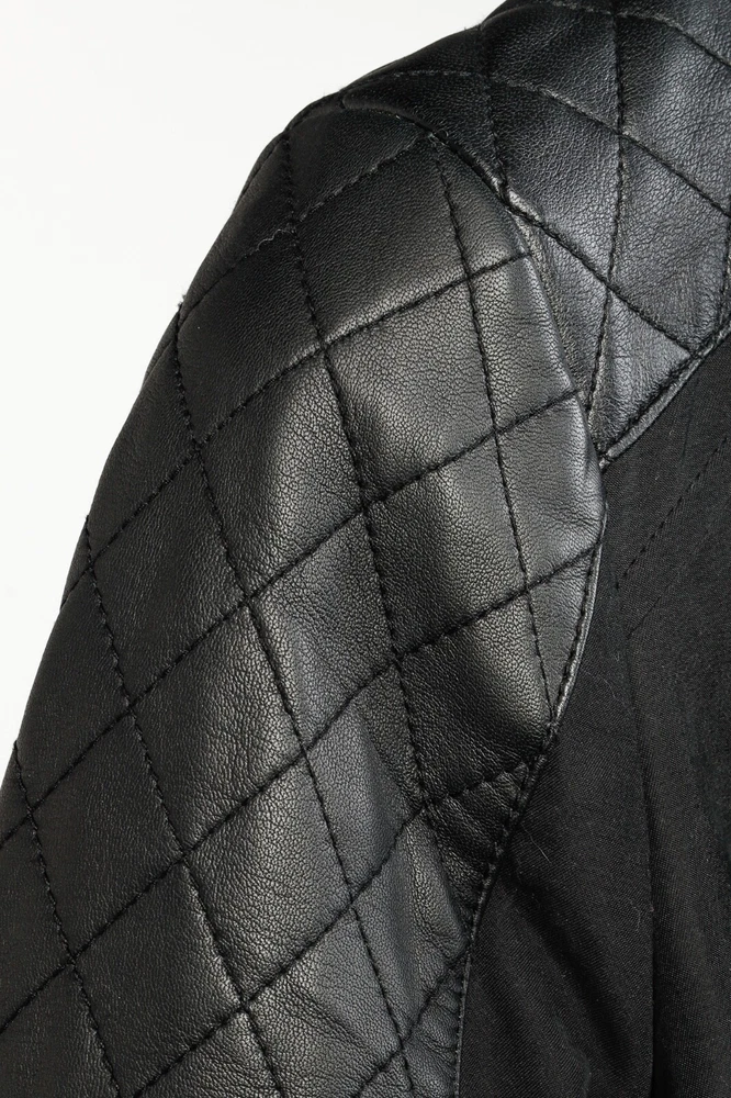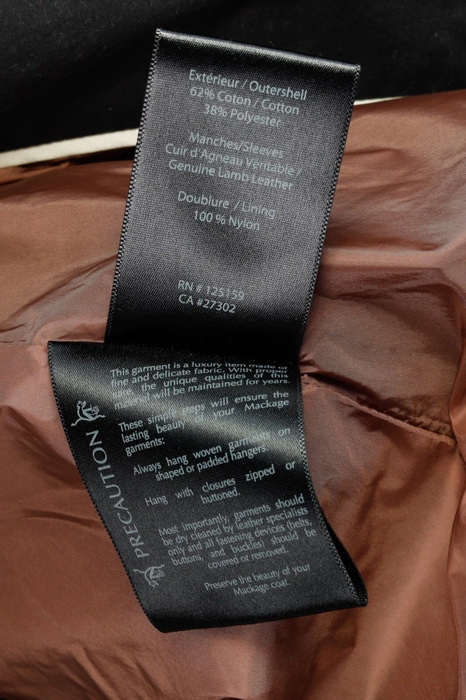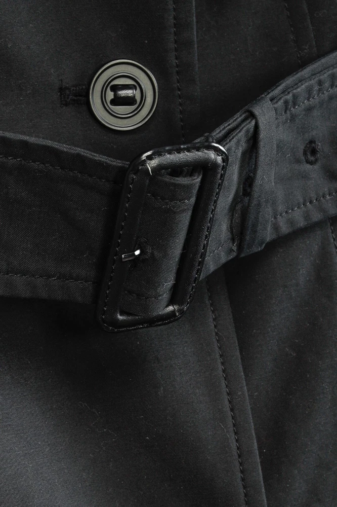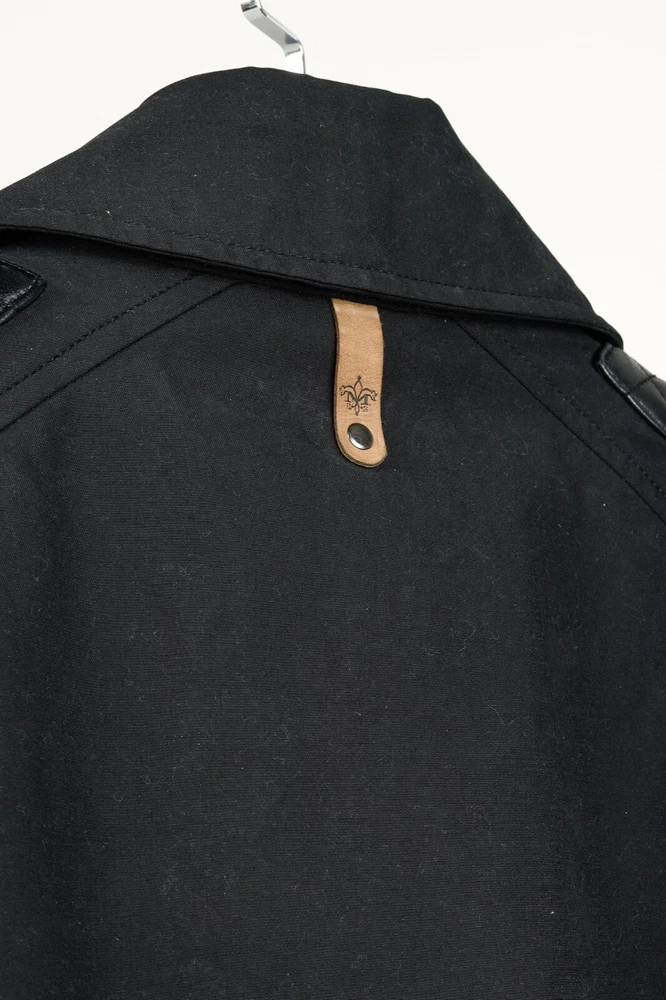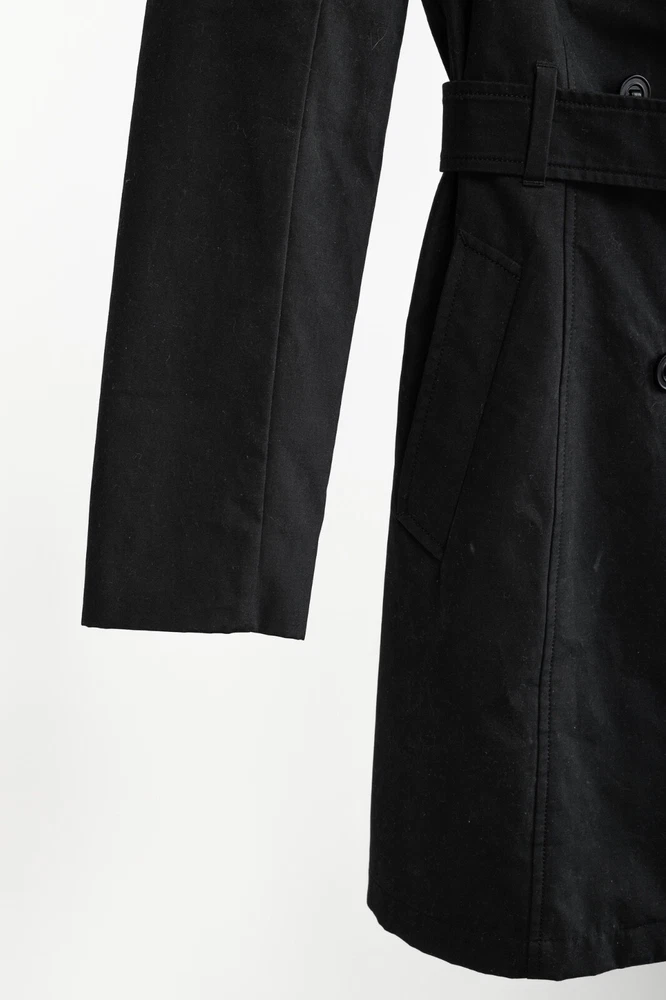 Circa 2013, the Lilith trench coat from Mackage is crafted in a sturdy Black cotton, and is adorned with quilted tonal leather on the shoulders. It features long sleeves, a collared neckline, double-breasted button front closures, a belted waist, side welt pockets, a back flap and slit, and is lined in a brown satin on the bodice, and a tonal satin on the sleeves. Size: S Condition: Great; some marking on neck, front bodice, sleeves, and back flap and hem. Approximate Measurements (laid flat): Shoulder: 14.5" (37 cm) Chest: 17.5" (44.5 cm) Length from back: 34.25" (87 cm) Sleeve length: 24.75" (63 cm) Composition: Outershell: 62% cotton, 38% polyester. Sleeves: Genuine lamb leather. Lining: 100% nylon.