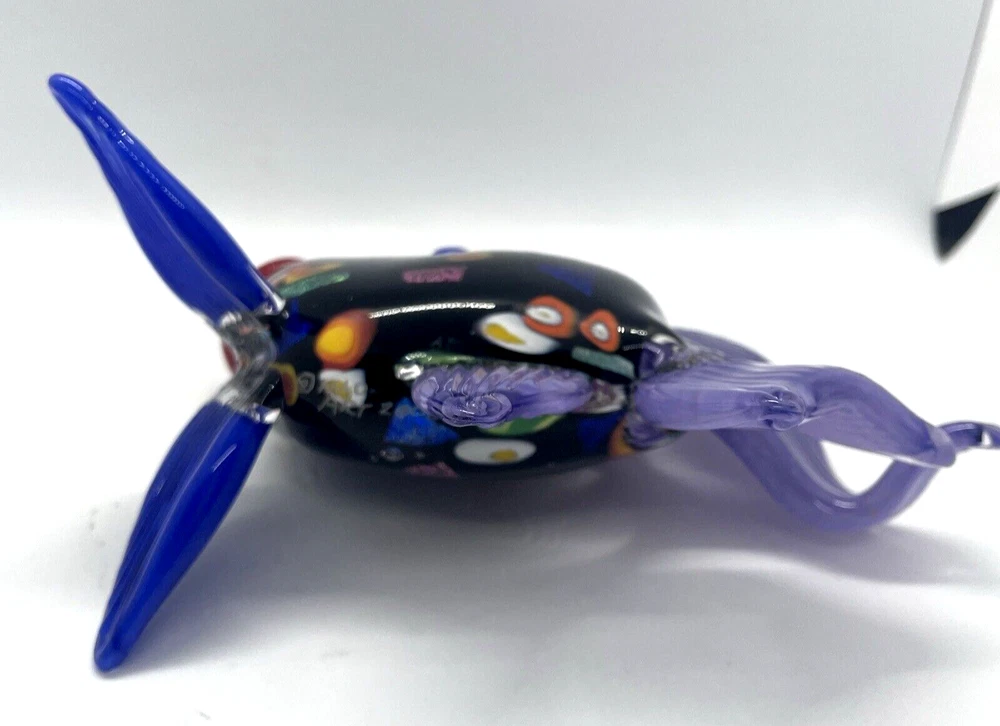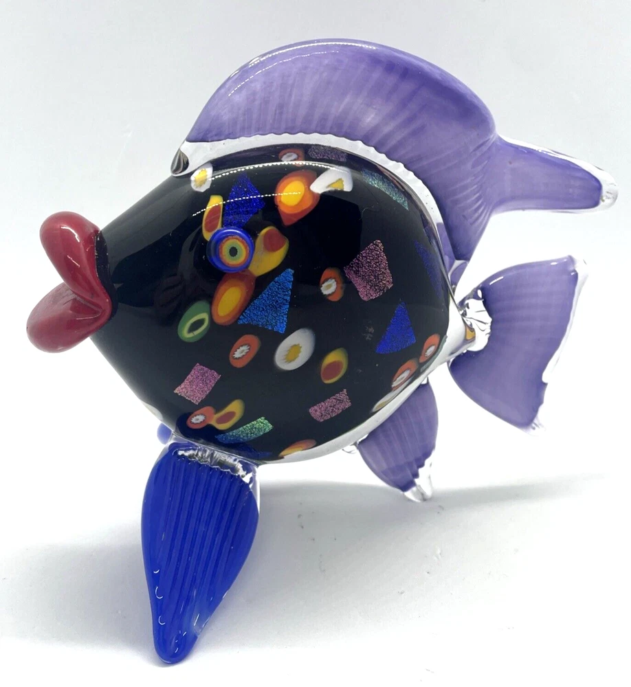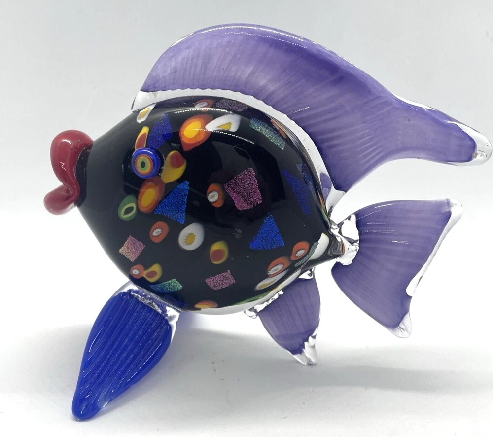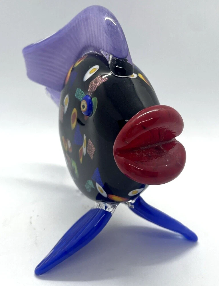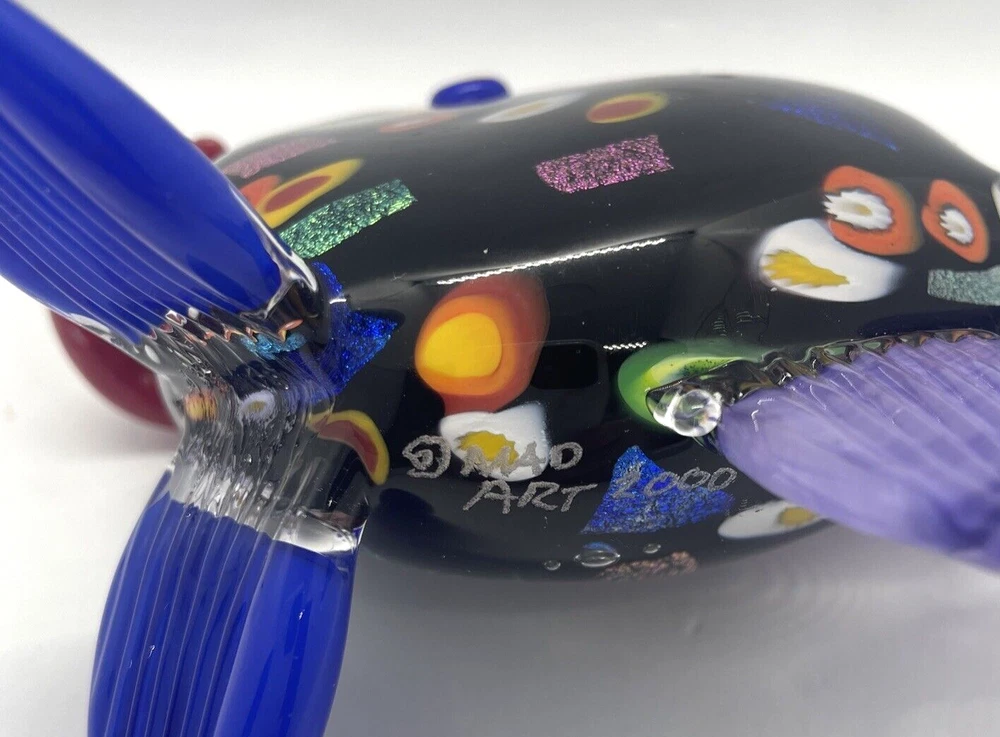 Mad Art Glass Dichroic Fish w/Millefiori Eyes Signed and Dated 2000 This fish is in excellent pre owned vintage condition. There are no chips or cracks. The lips glow under blacklight. It measure 6" x 4.75" . Please note the photos for detail.