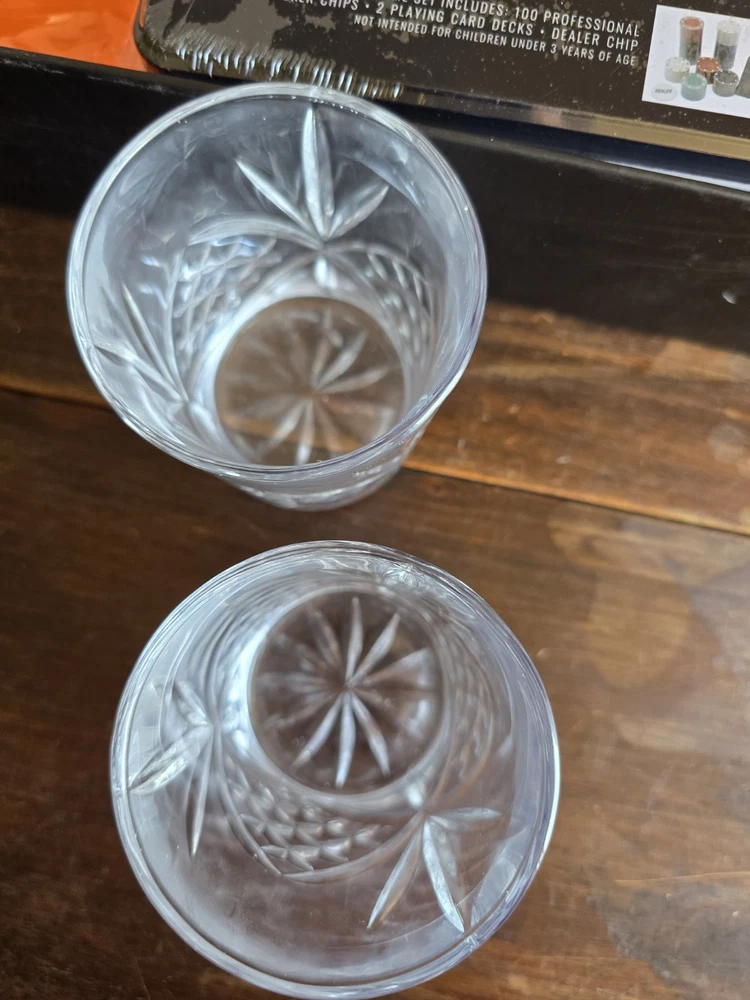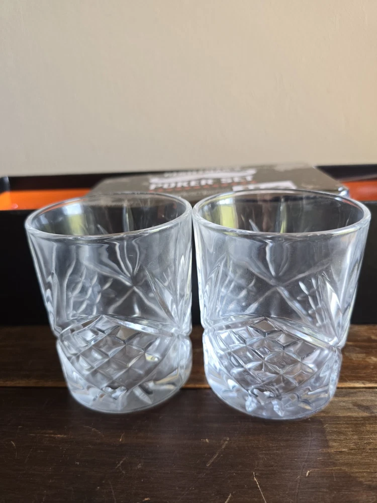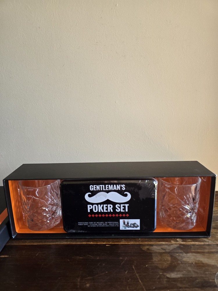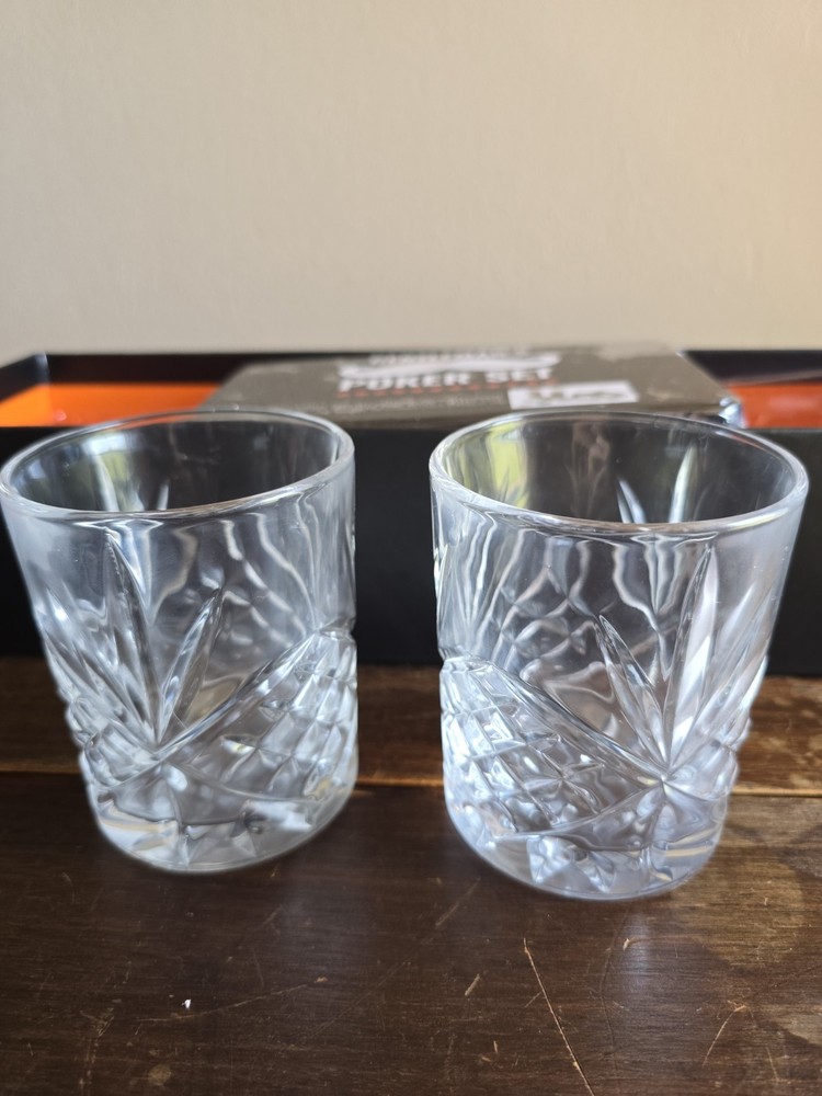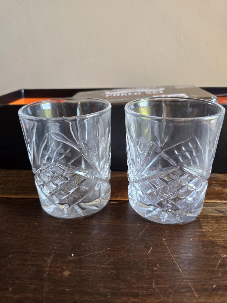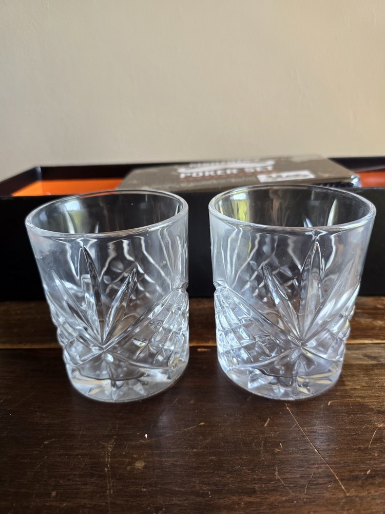 100 professional poker chips 2-playing card decks 1 dealer chip 2/7oz Crystal whiskey glasses